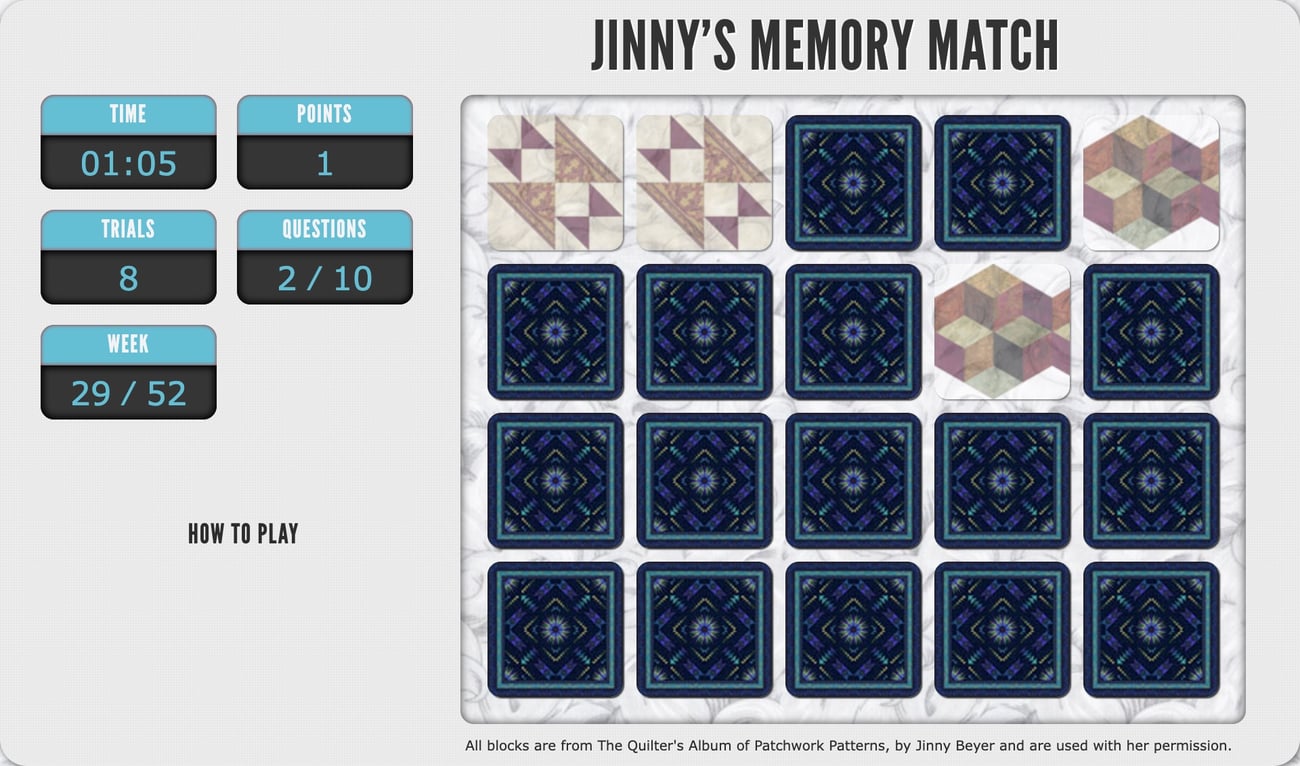 Are you up to the challenge of matching 10 quilt blocks? It's not as easy as you think. Play Jinny Beyer's Memory Match and find out if you have what it takes.