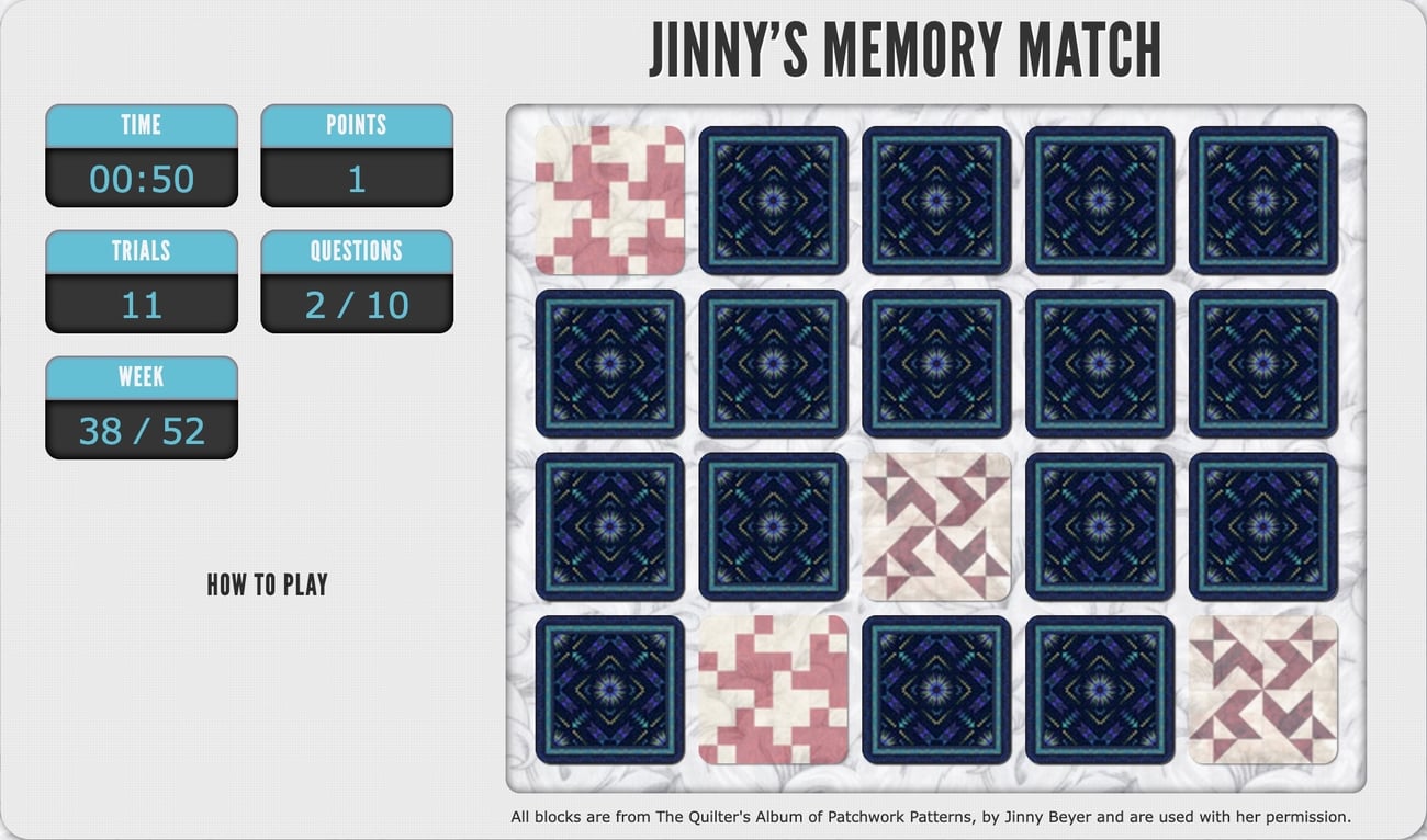 Are you going through the motions and just getting the same time every week when you play Jinny Beyer's Memory Match? Well, now it's time to step up your game and prove to everyone else you're the best around! |