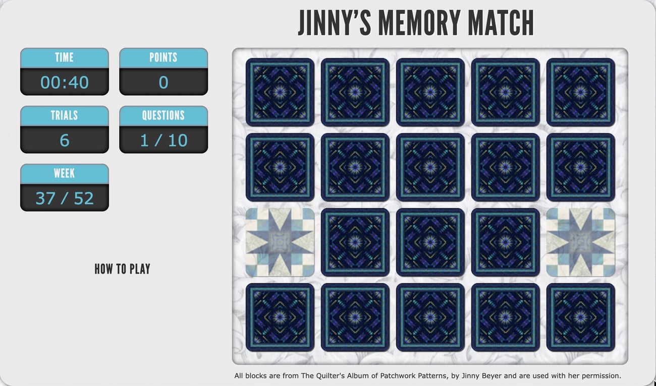 Do you dream of being the best Memory Matcher out there? Well, there's only one way to do it, and that's to play Jinny Beyer's Memory Match until you match everything right the first time! |