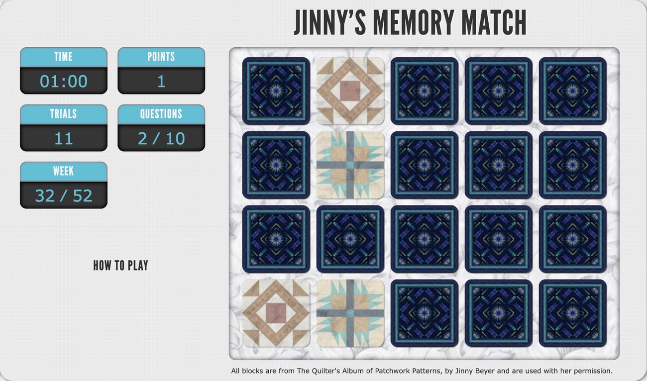 play Jinny Beyer's Memory Match. Do you know them all? Are there some blocks you've never seen before? Play the game and get inspired.