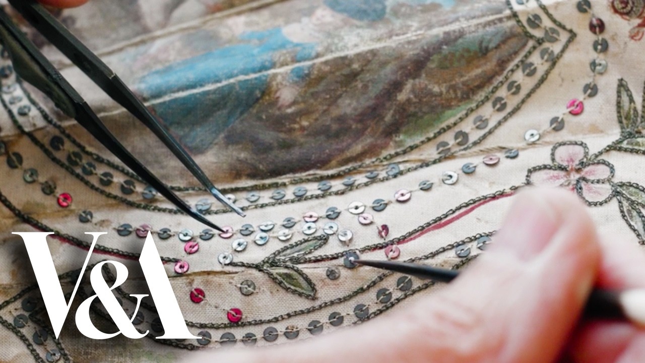 From the Victoria and Albert Museum: "Join Senior Paper Conservator Susan Catcher as she conserves a fragile 200-year-old fan from the era of Marie Antoinette. Using specialist conservation techniques (plus plenty of patience and a porcupine quill!) Susan addresses the structural integrity of the fan – reinforcing the back and creating a hinge to allow it to open and close once again. She also re-adheres fiddly loose sequins, stabilises areas of wear, and subtly retouches the design using watercolour paint." |