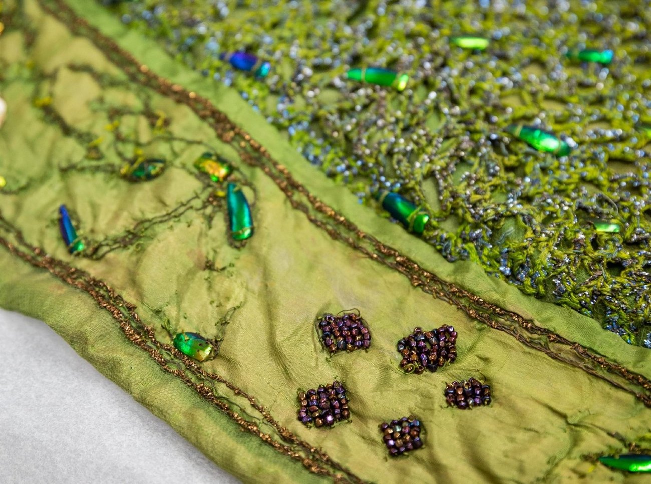 From the National Trust: "Famous actress Ellen Terry wore this shimmering dress in the 1888 production of Macbeth. Decorated in more than 1,000 beetle wings, it was even immortalised in a painting by John Singer Sargent."