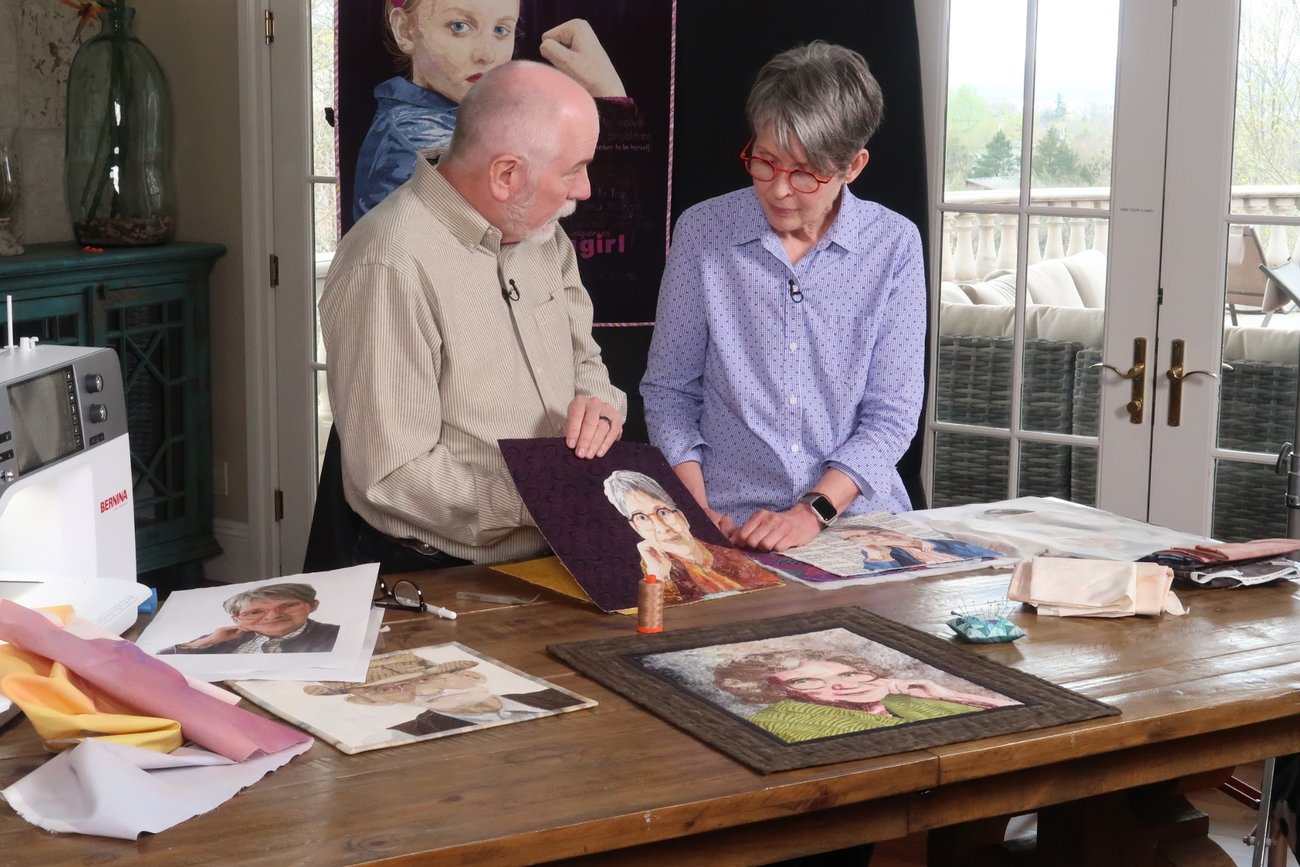 Lynn Czaban begins her first demonstration in our new show by explaining what to look for when selecting an image for a self-portrait. She then offers suggestions for selecting fabric, emphasizing how variations in value—particularly in skin tones and hair—are essential to achieving a realistic effect. Next, she demonstrates how to appliqué the face onto a background, and shows how to bring the portrait to life by adding subtle details like wrinkles, smile lines, and other small touches that infuse the work with personality and realism.