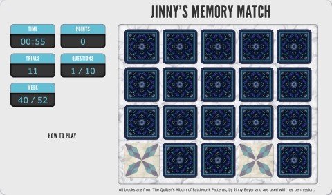 Do you play Jinny Beyer's Memory Match Game? Have you tried challenging your friends? Find out who among your quilt group has that encyclopedic knowledge of quilt blocks. Have some fun and learn about quilting.