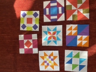 I'm playing around. I'm going to try switching the orange/red to the middle and the blue/purple to the outside. I also have been thinking about replacing the light brassica with a white border, with nine blocks in the center, and blocks in the border beyond the white border. More block to make though!