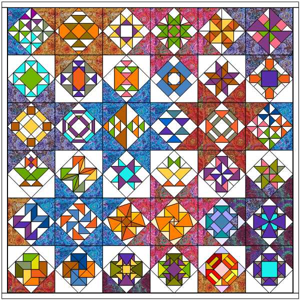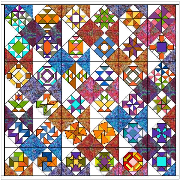 although there are new blocks to do (Spool + others), my quilt was saying 'I'm done' also - as others' have said. And sashing with special corner stones (look closely) and outside HST seemed to pull it all together. Will wrap a bit more green around the edges - a 'border' that doesn't look like a border, just to float the big squares a bit more. Thinking yet to quilt it...mmm... Thanks Alex and the whole crew for all you have done to help us grow in skills and confidence! Love it!