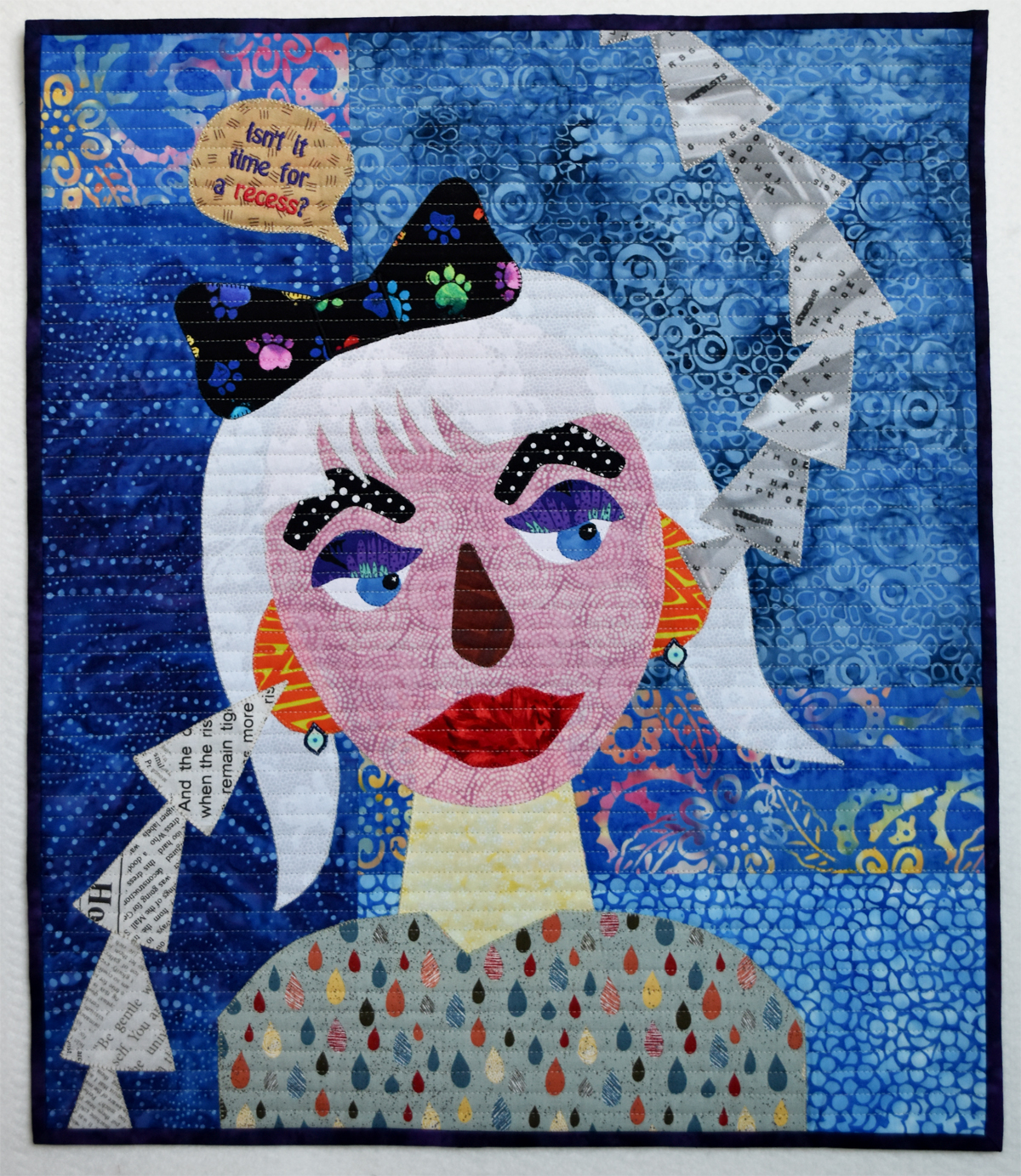 Well, I'm a little late to join the party, but here is my finished face quilt. I obviously had a little trouble letting go, so this ended up being a bit of a self-portrait from my working years as a court reporter. The triangles going into the left ear have words printed on the fabric, and the triangles coming out the other side have my steno output -- fabric I designed and had printed on Spoonflower. That all said, it was the most fun I've had making a quilt and the next one I do, I'm hoping to let my wild side out (if I have one)!