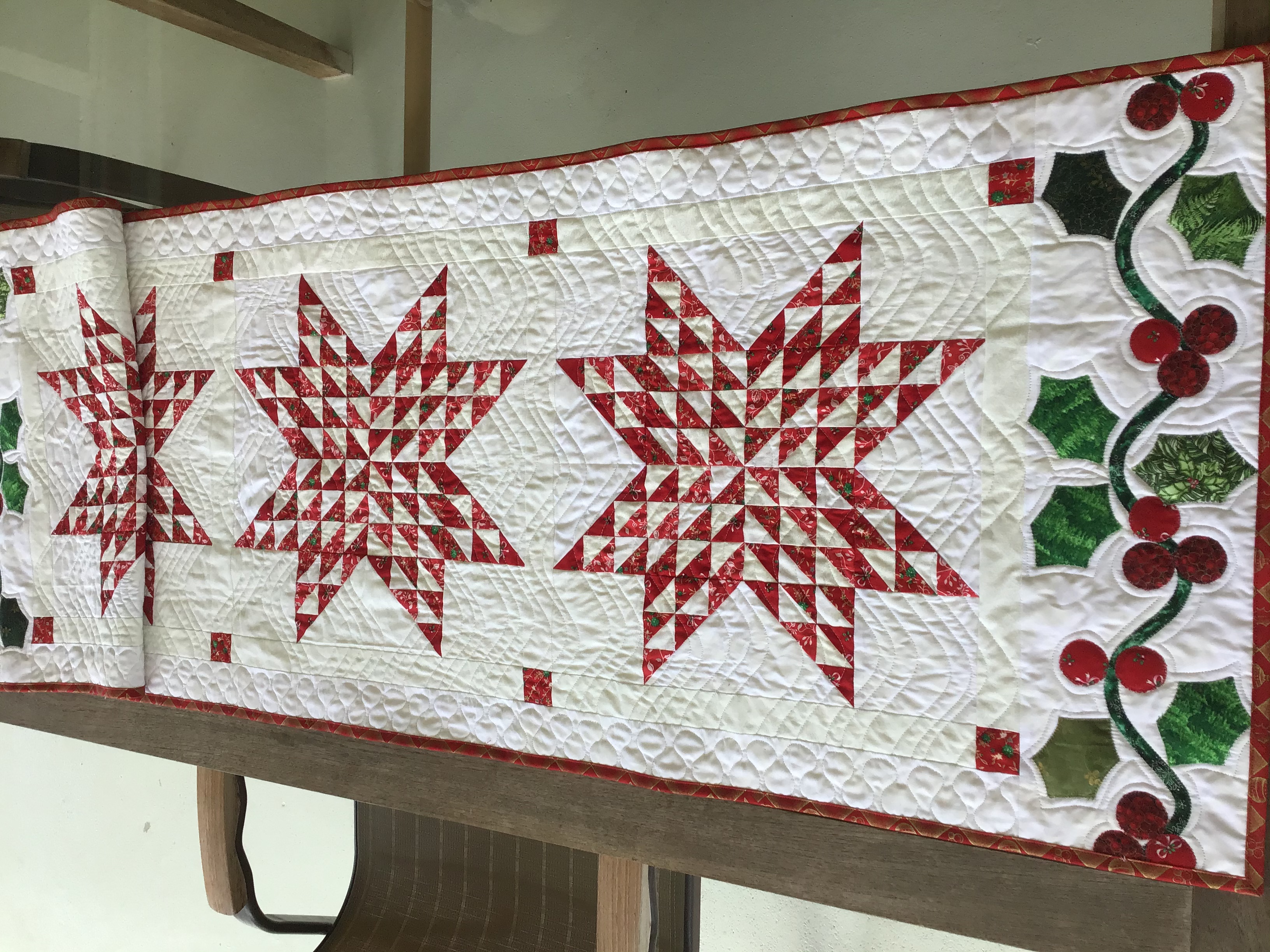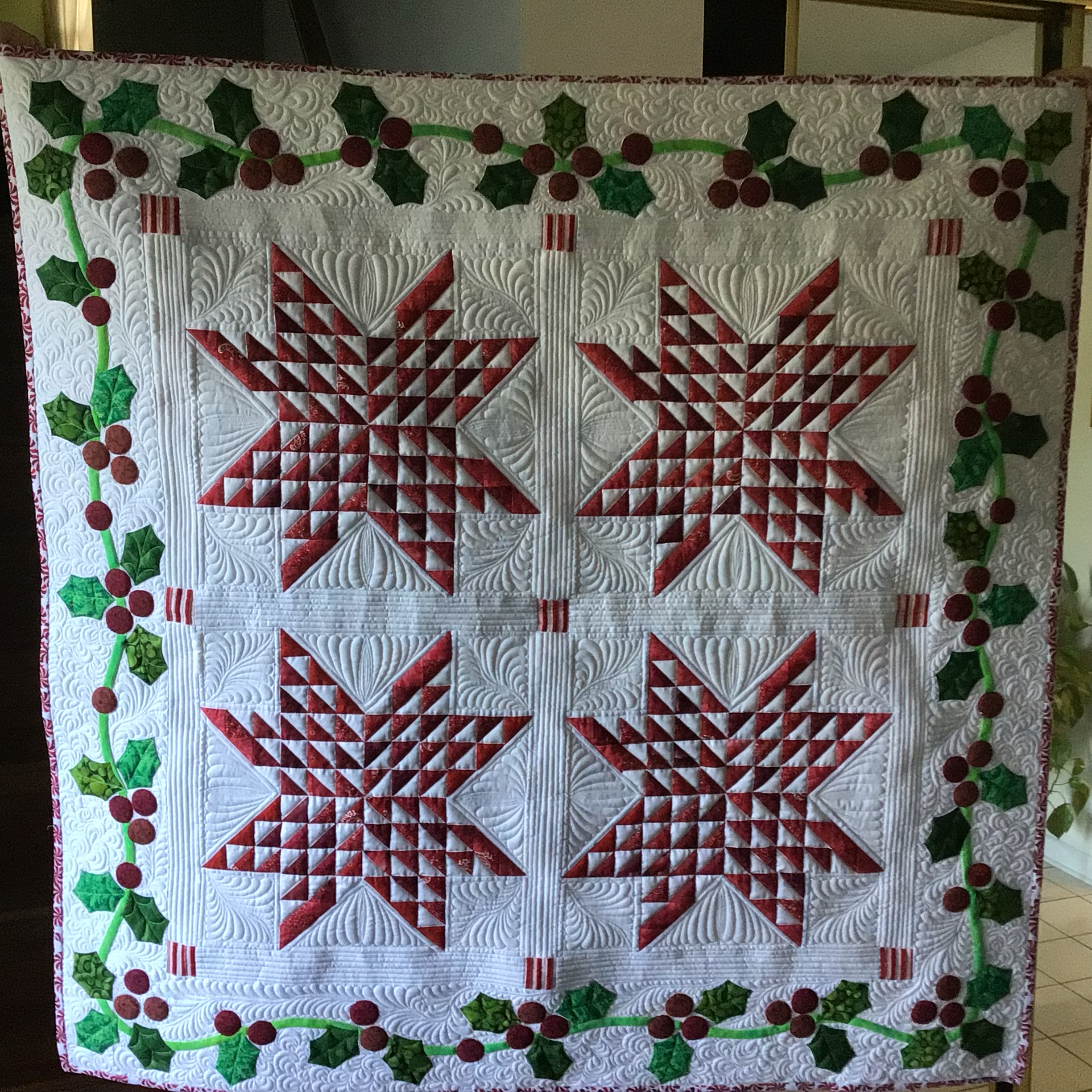 My holiday quilt is a bit different. It's called Grape Vines and Berries. I would like to ask Alex how to quilt it. I'm thinking crosshatching on the Redwork and echo on the vines. But I'm also thinking it should be by hand at least through the Redwork. I would appreciate any help. Thank you.