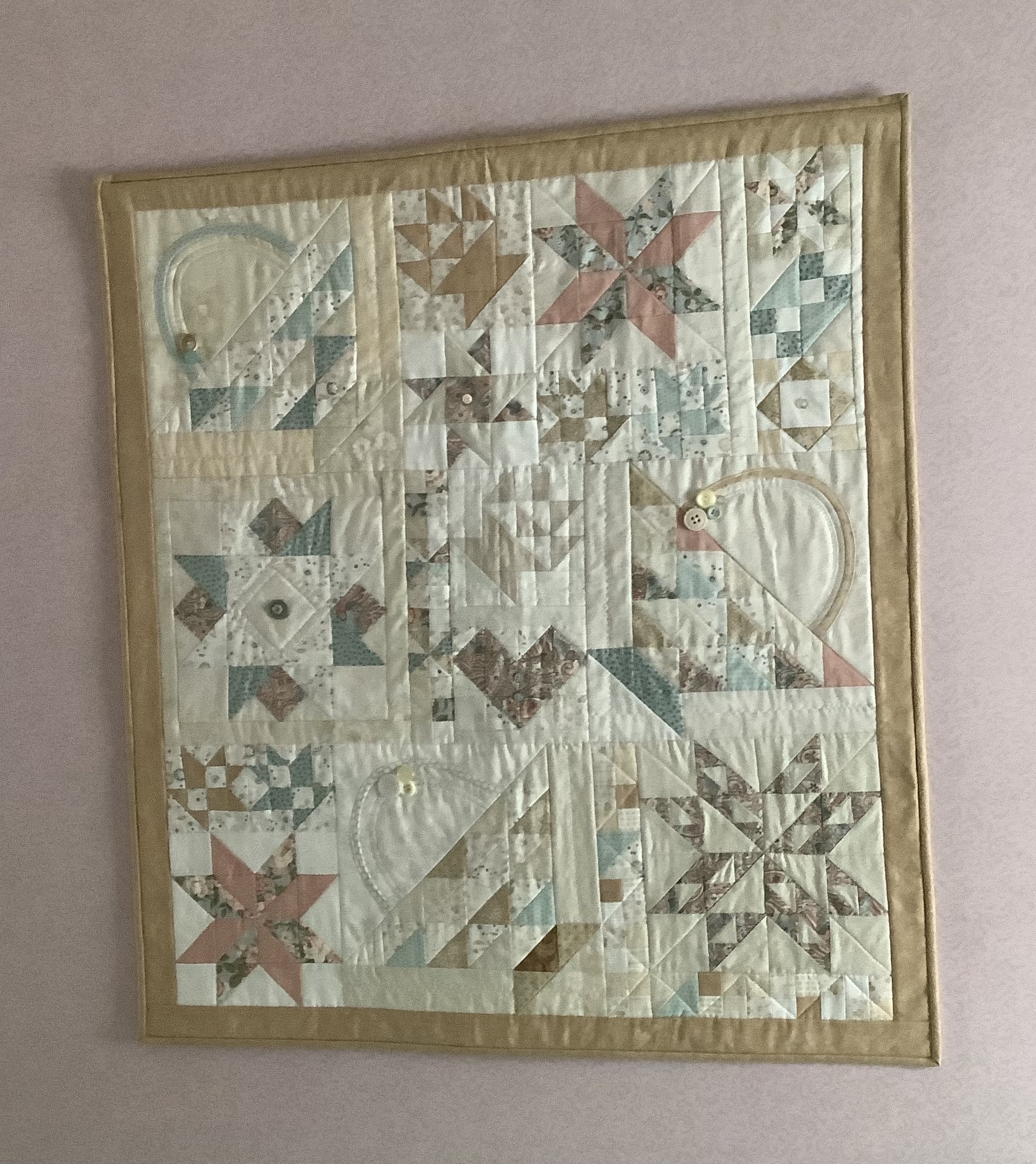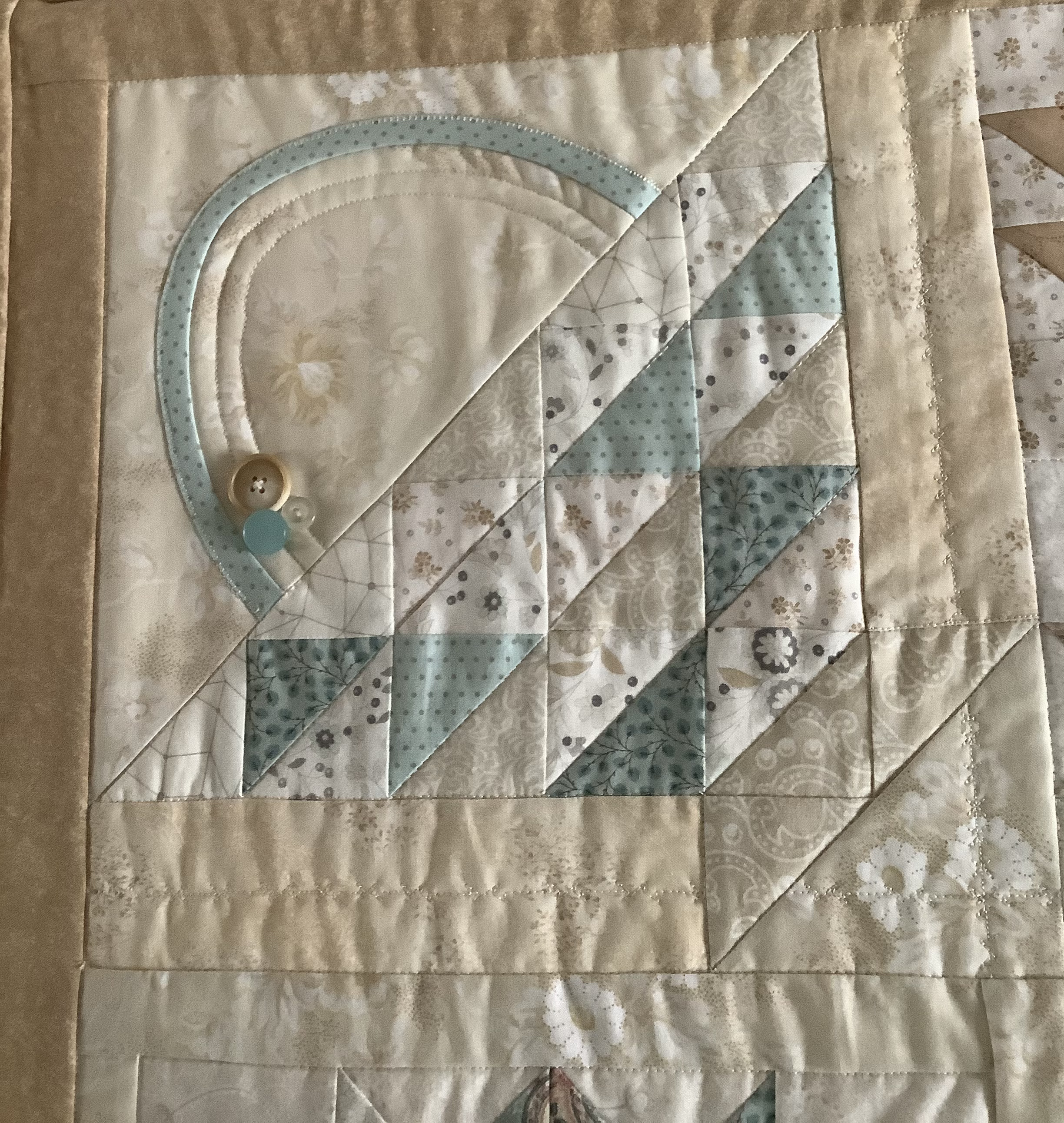 Happily I am able to be able to post! A little glitch prevented that but John and Justin were able to fix it! My basket wall hanging was made using fabric I had and my focus was neutrals as well as where it would be hanging in my house. It also includes several old buttons. If I were to make it again I would include other fabrics for more contrast. It was a challenge mathematically but I learned a lot doing it!