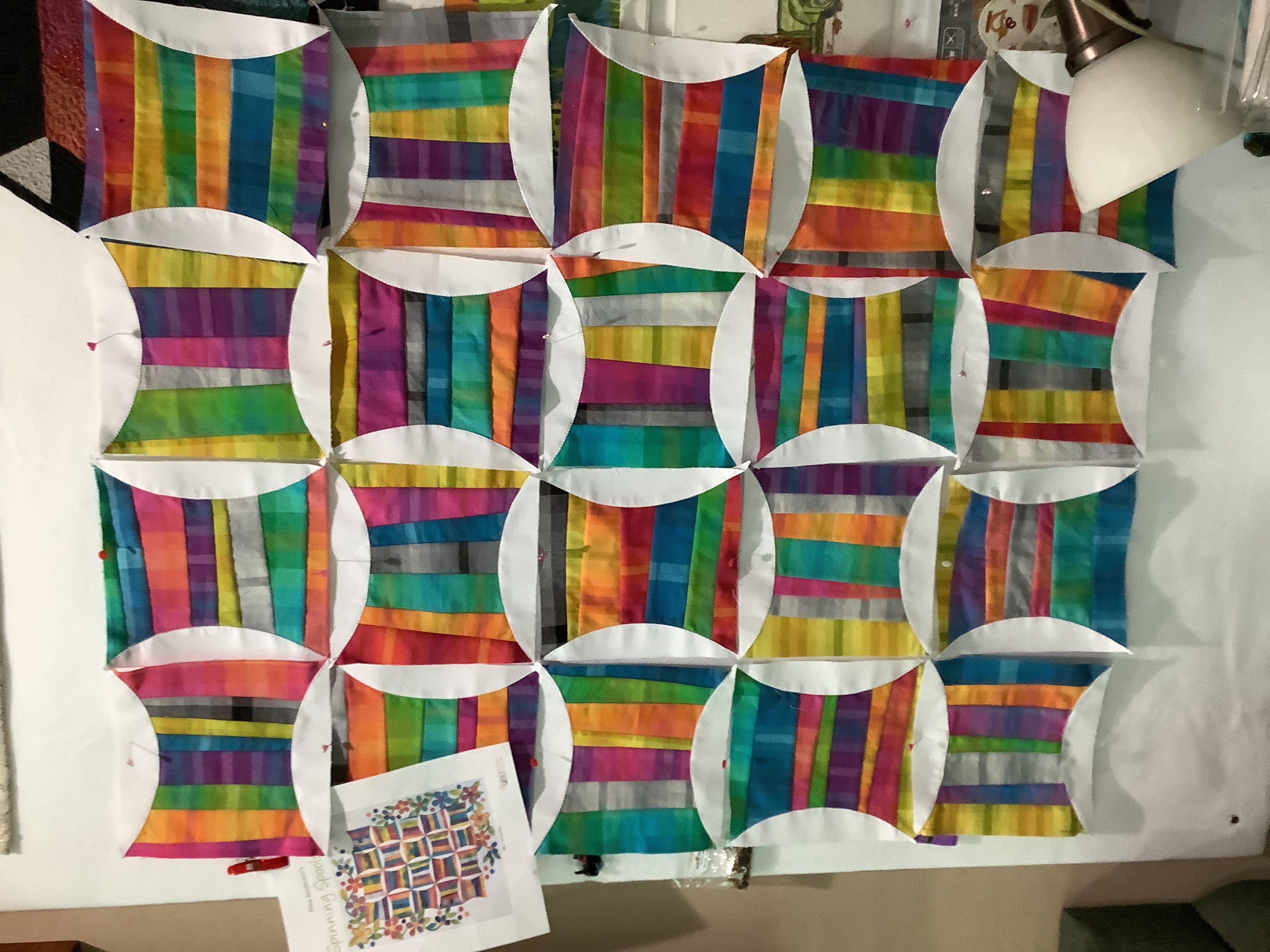I finished stitching the spinners, using monofilament thread, the blind hem stitch adjusted to around 1/1, and the Bernina clear applique foot. I squared up again to 8 1/2", as I only had a few that didn't go off the edge a bit because of matching the 1/4 inch corner. I may move a few colors around yet.