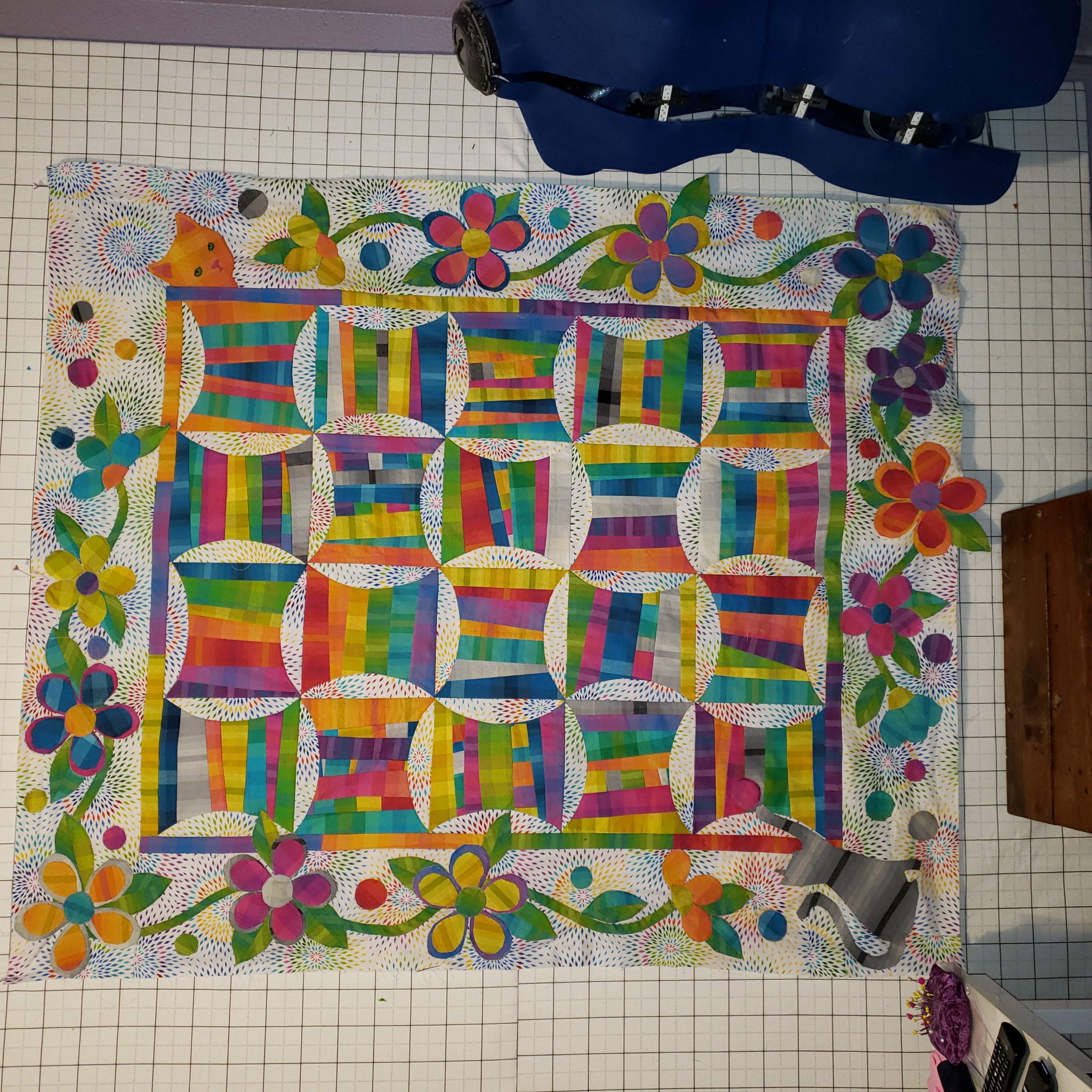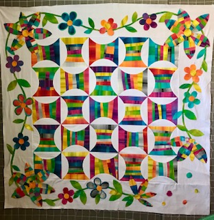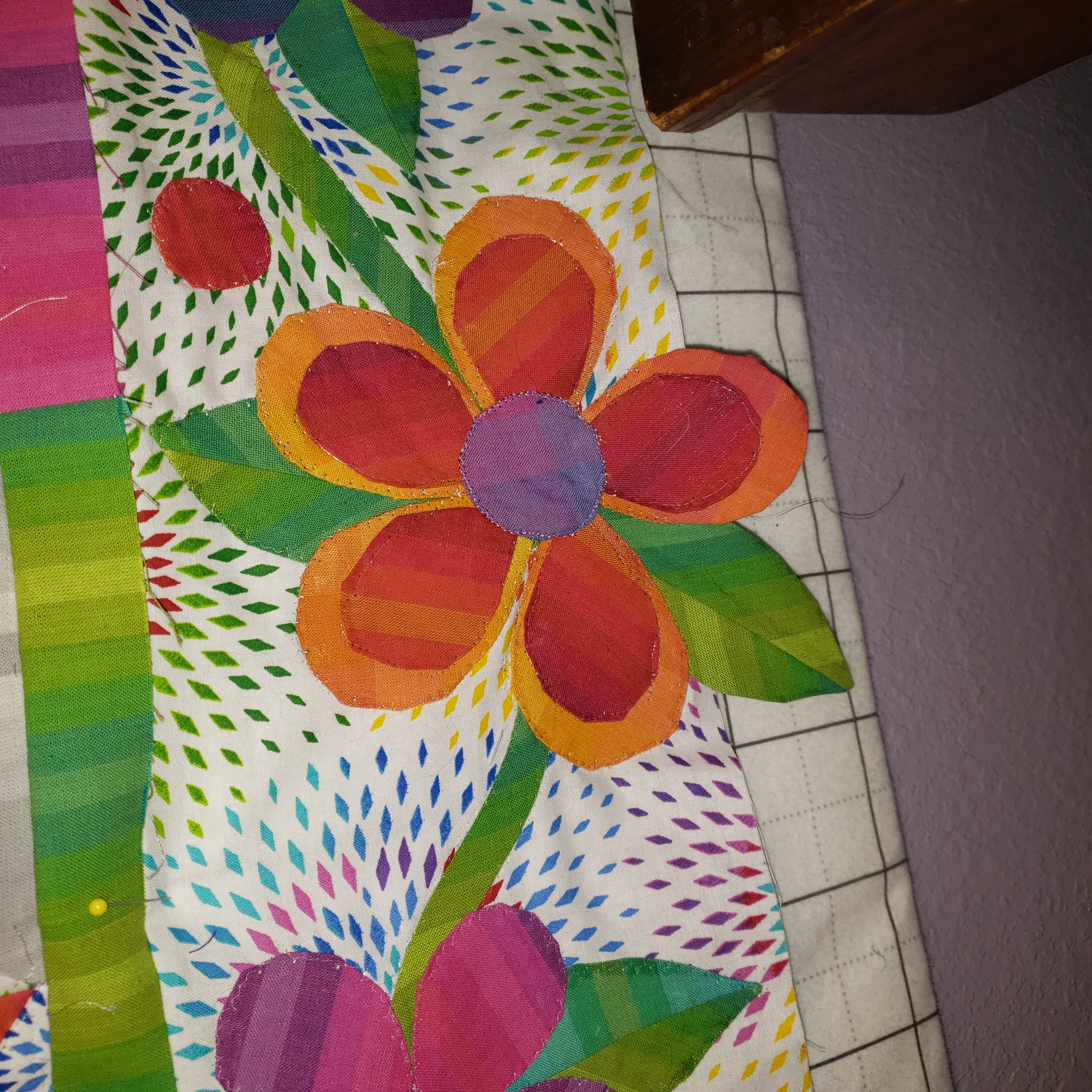 Roberta, Very creative to put the big flowers in the corners. Thinking of contrast with the flower colors and the spools colors, I thinkOriginally posted by BertaKaty View PostApplique is just pinned on but it’s readyto fuse everything down. I will then do a machine blanket stitch in black.