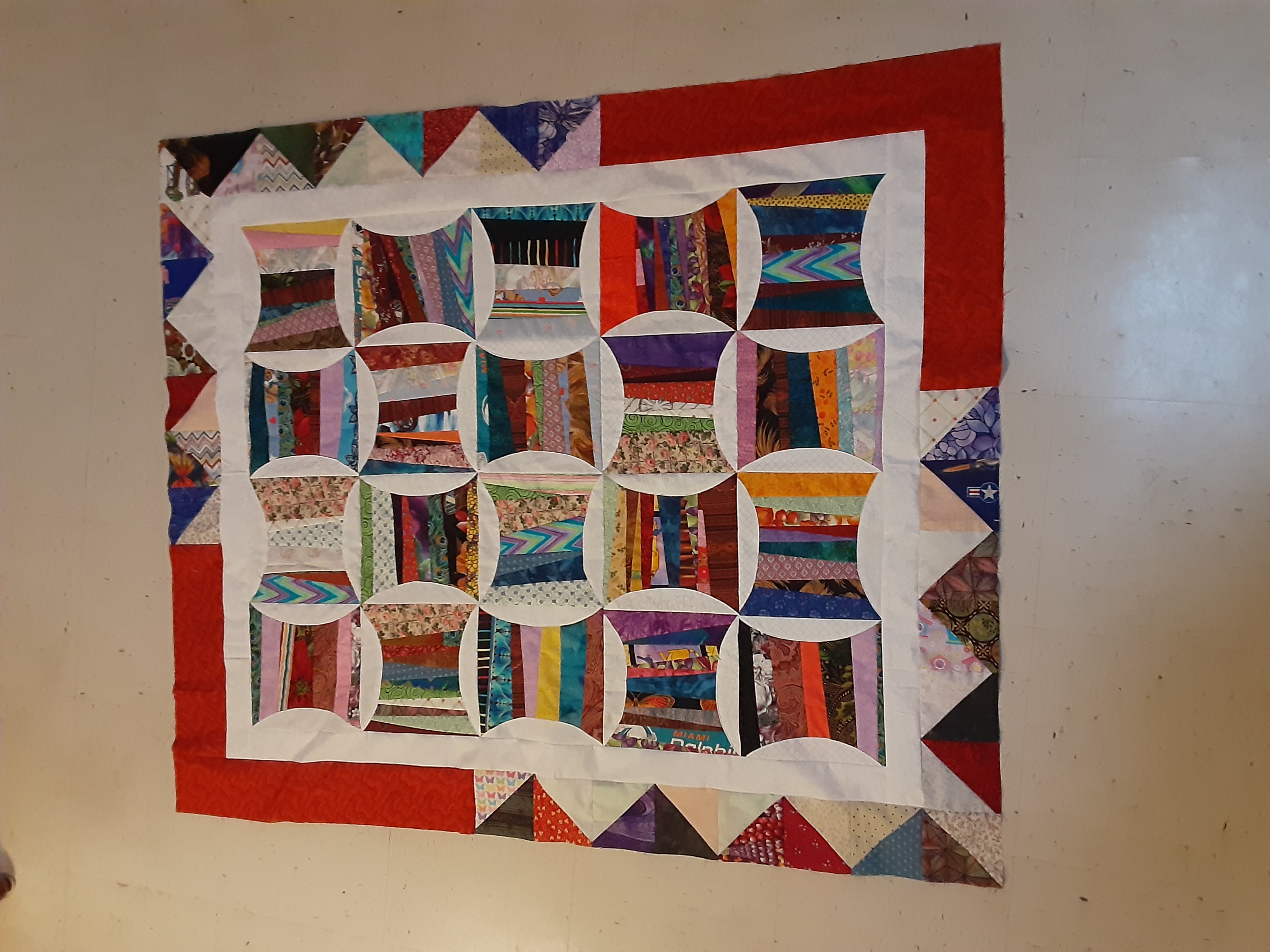 SueGee, Your got it right. It looks great with just the multicolored narrow border and an outside border that is not wide like the original pattern. Good Job. HelenWOriginally posted by SueGee View PostSo after many starts and rejects, I finally decided on a border. Applique just did not look right with the neck ties. It is now quilted and ready for the label which will read "Ties that Bind" . Need to work on the rest of the wording.HelenW