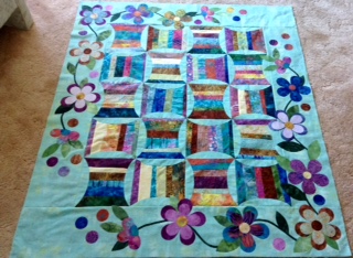 I'd face it and leave it extending beyond the edge of the quilt. It looks great!Originally posted by MommyG1 View PostHere's my oops from last night. I sewed the flower and leaf overlapping the outer edge instead of the inner edge (the border isn't sewn on. Now do I move it or let it extend past the binding? If I leave it, I will back it so there aren' any raw edges on the back.