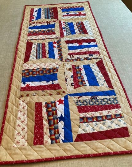 Sandy, Just in time for the 4th of July. It looks great! I like the idea of using iinsul-bright batting for hot dishes. HelenWOriginally posted by sandytn View PostI ended up making a table runner from my Spinning Spool blocks. I used Insul-Bright Batting so I can safely set hot dishes on the table. I still have some blocks that I will use to make some hotpads.HelenW