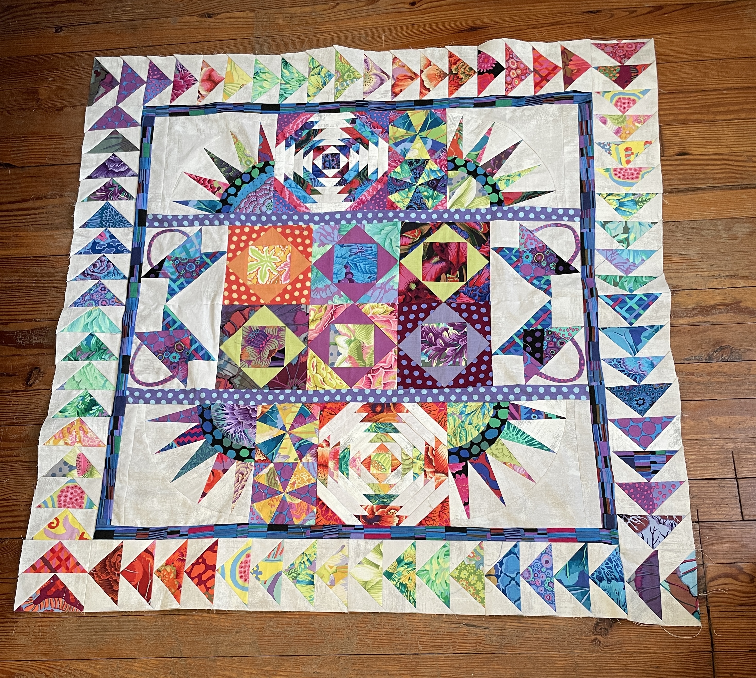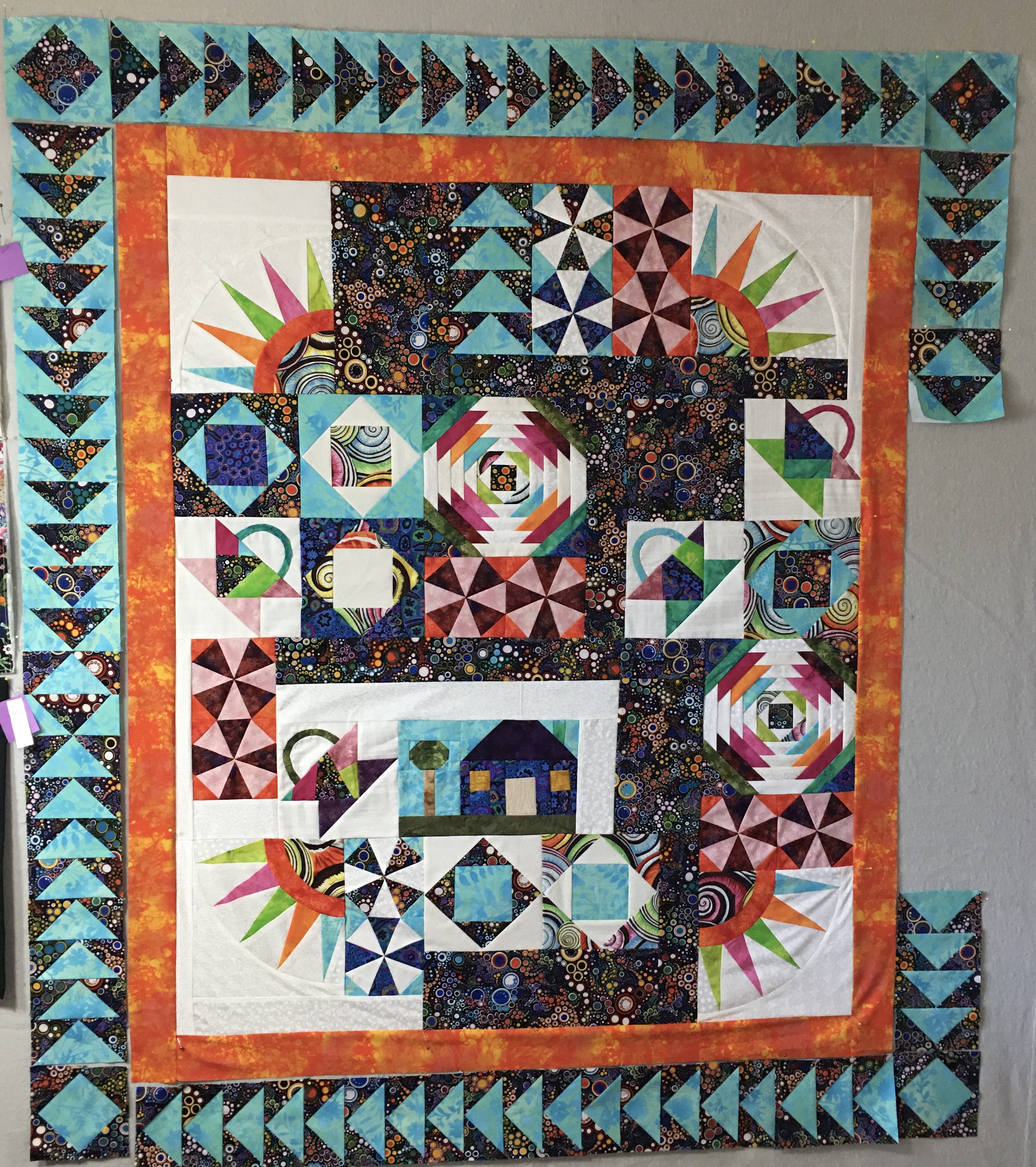 It took me full 2 days to add the bottom orange border, (sew on, rip out, sew on, rip out, 4 times, trying to get everything to lay as flat as it is now, uuugh!) because it was cut the same direction as the selvage and the two bottom corners are on the bias because of the New York Beauty blocks.