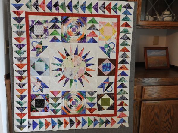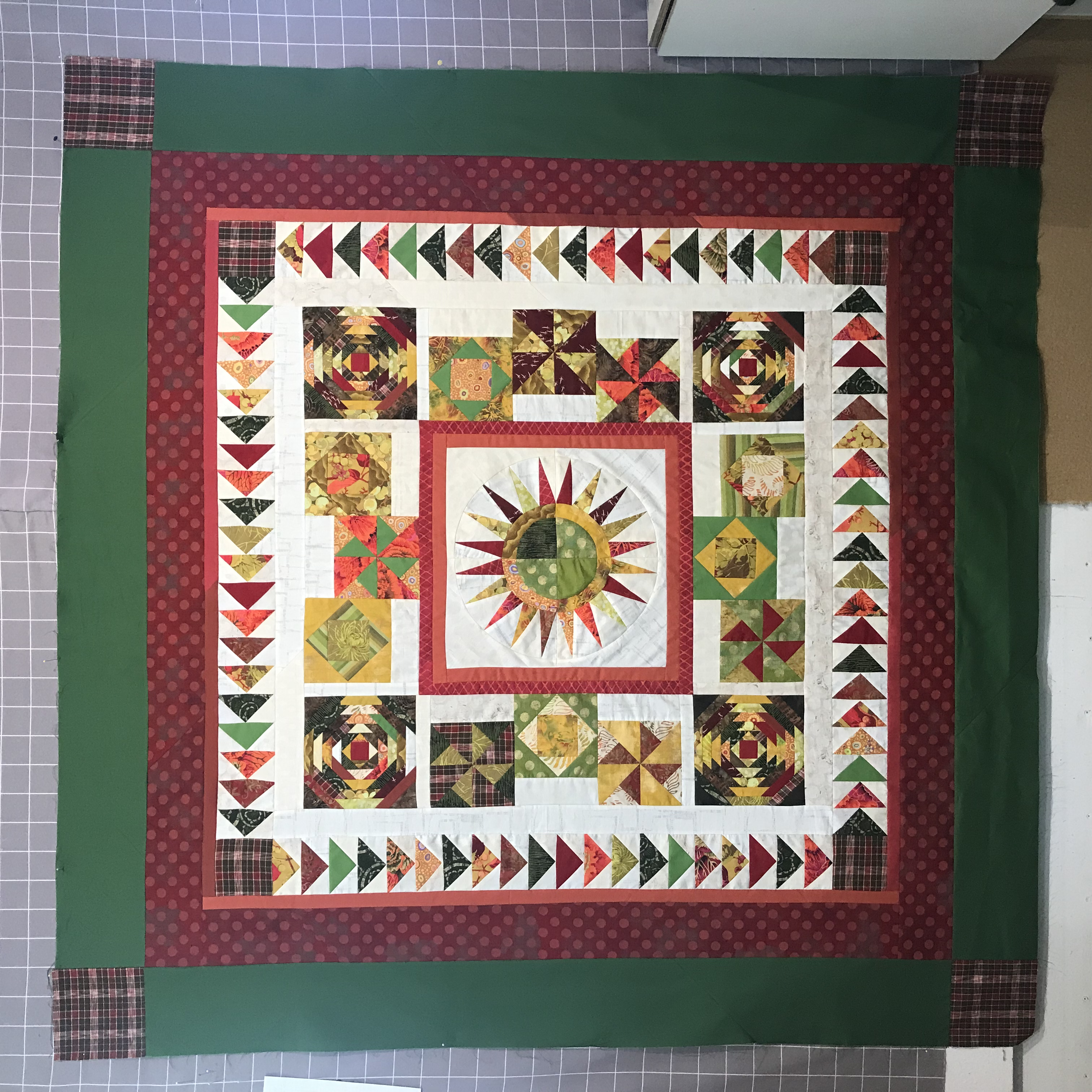 I only have 12 flying geese to make. The reverses of the colors are calculated and in their position; (ie) lower middle left and high on the right. The corners are all done too. Then to sew all the geese to the outside of the quilt. I’ll have to cut down the size of the orange border a bit because the math does not work.