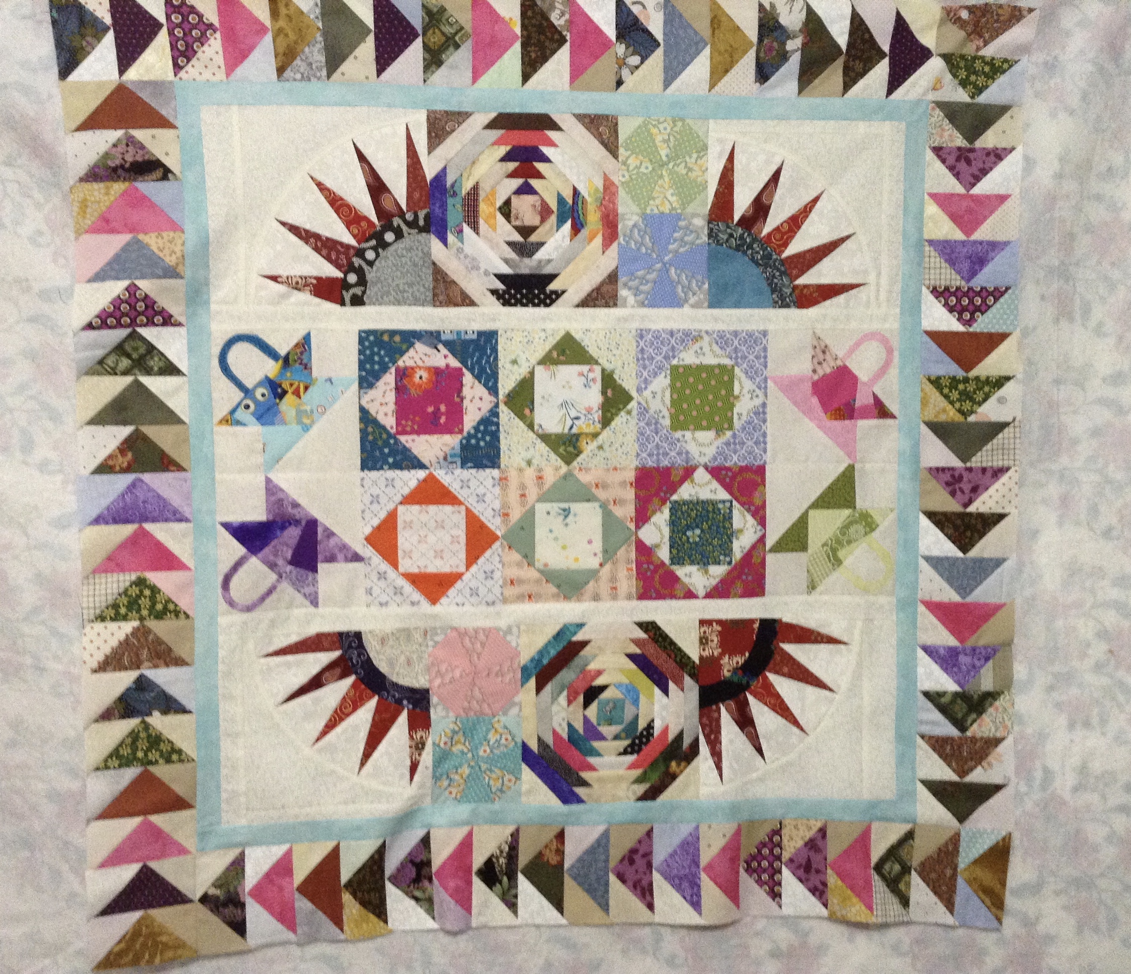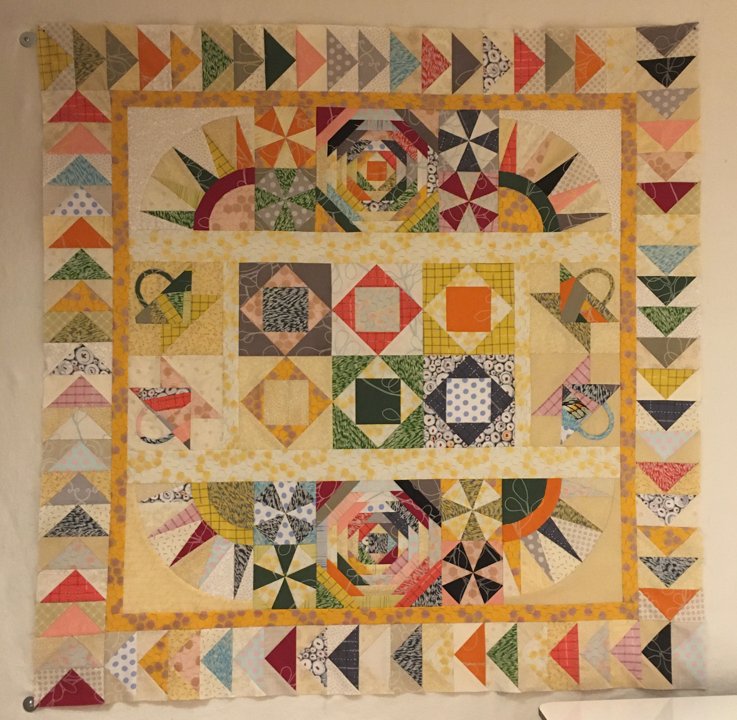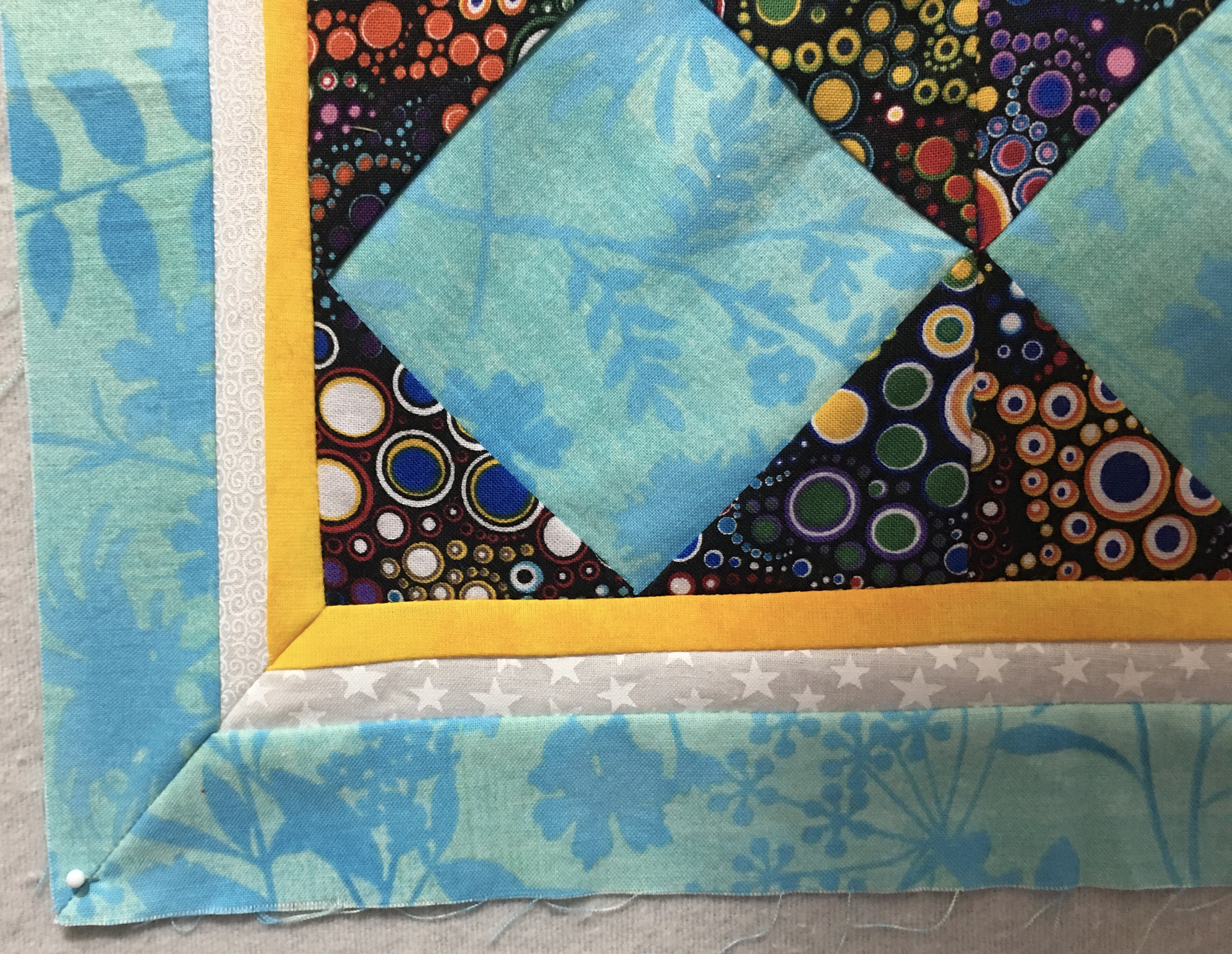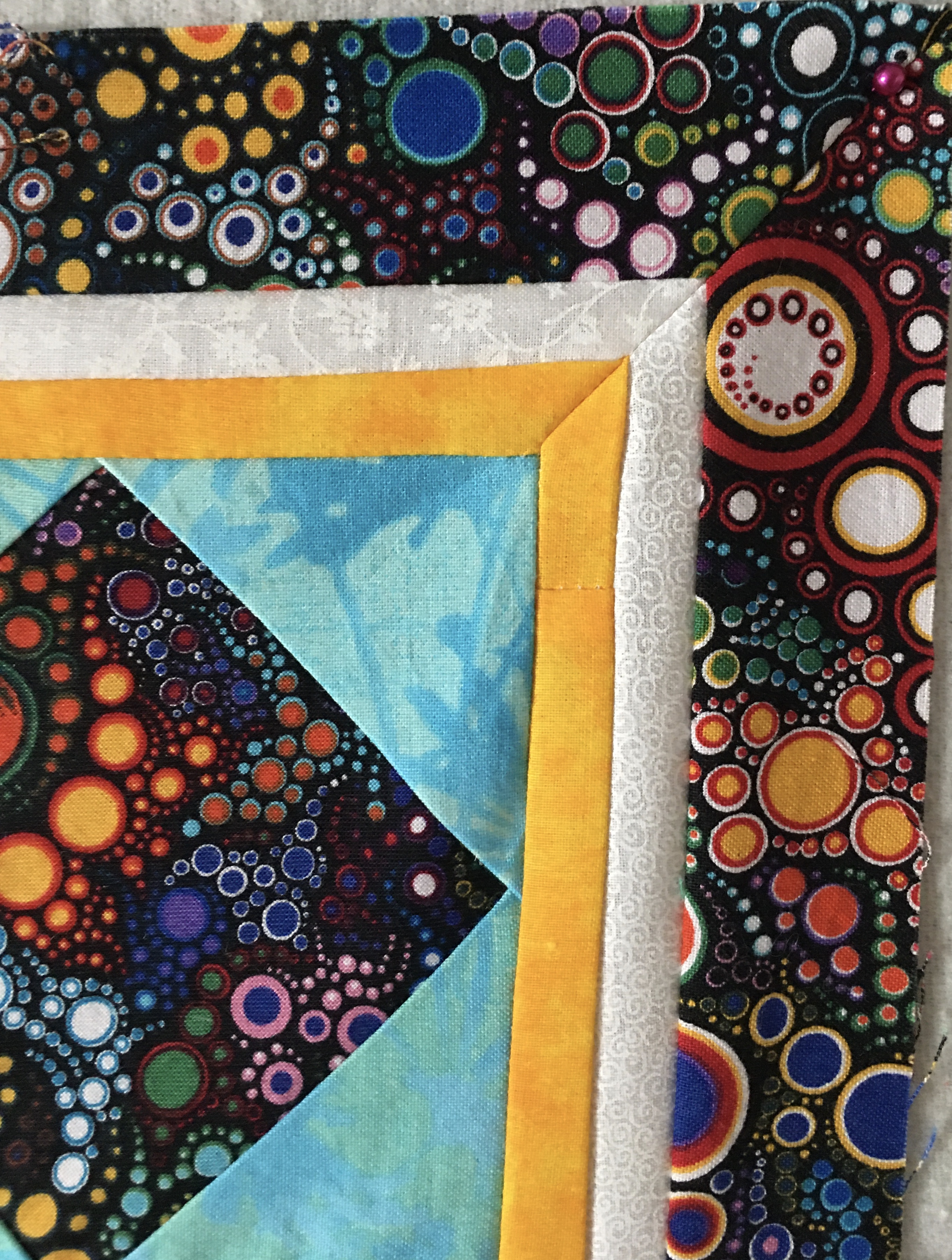 I found that I couldn’t end the quilt at the flying geese border. I found that it looked too naked. My daughter is in Interior and commercial design and with me being a University Bachelor of Fine Arts graduate, we decided that to really make this quilt “ ME” I needed to bring the yellow and white out to the edge, and since I was going to make the bias a reversal color of the flying geese also I wanted it to be larger and more visible on the edge so I made the last border a 1 inch of those colors. I even mitered the 4 corners, and bias joined the side joins!