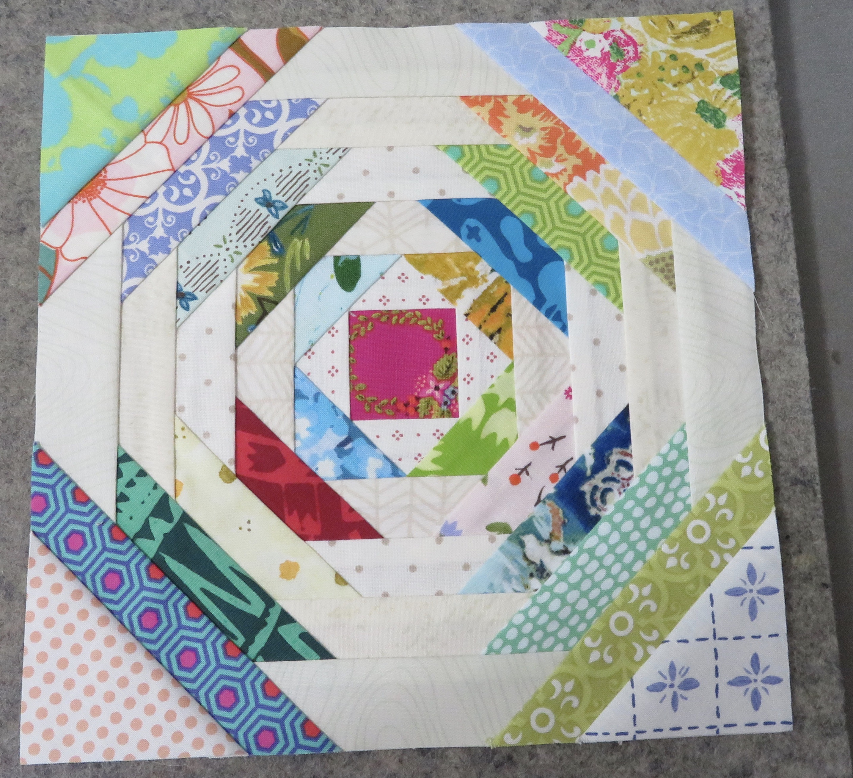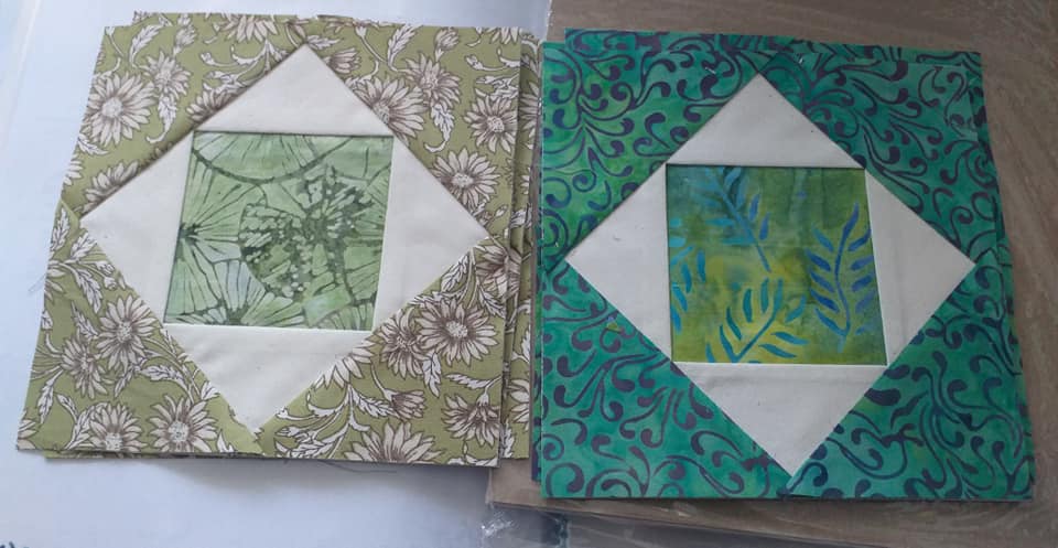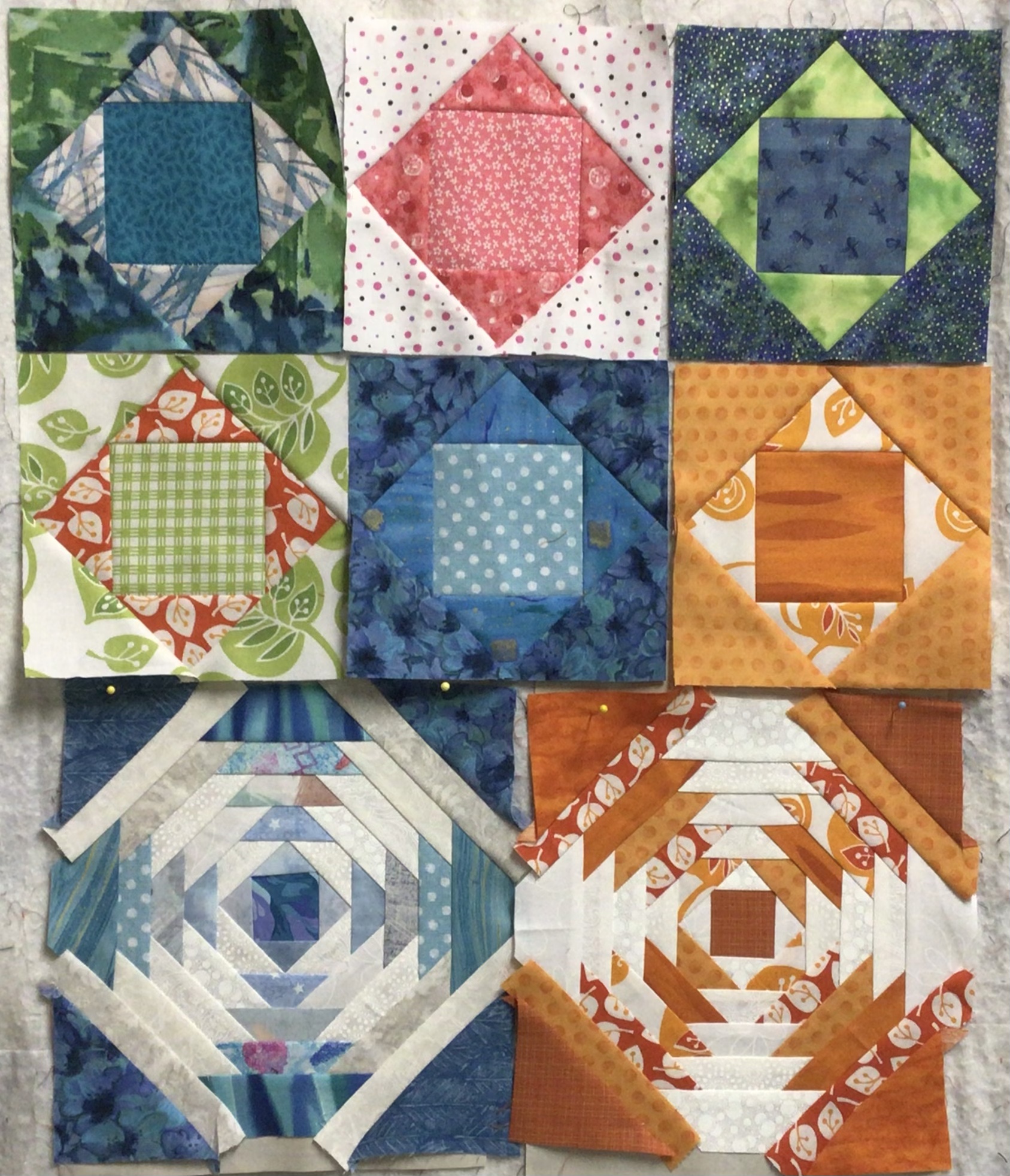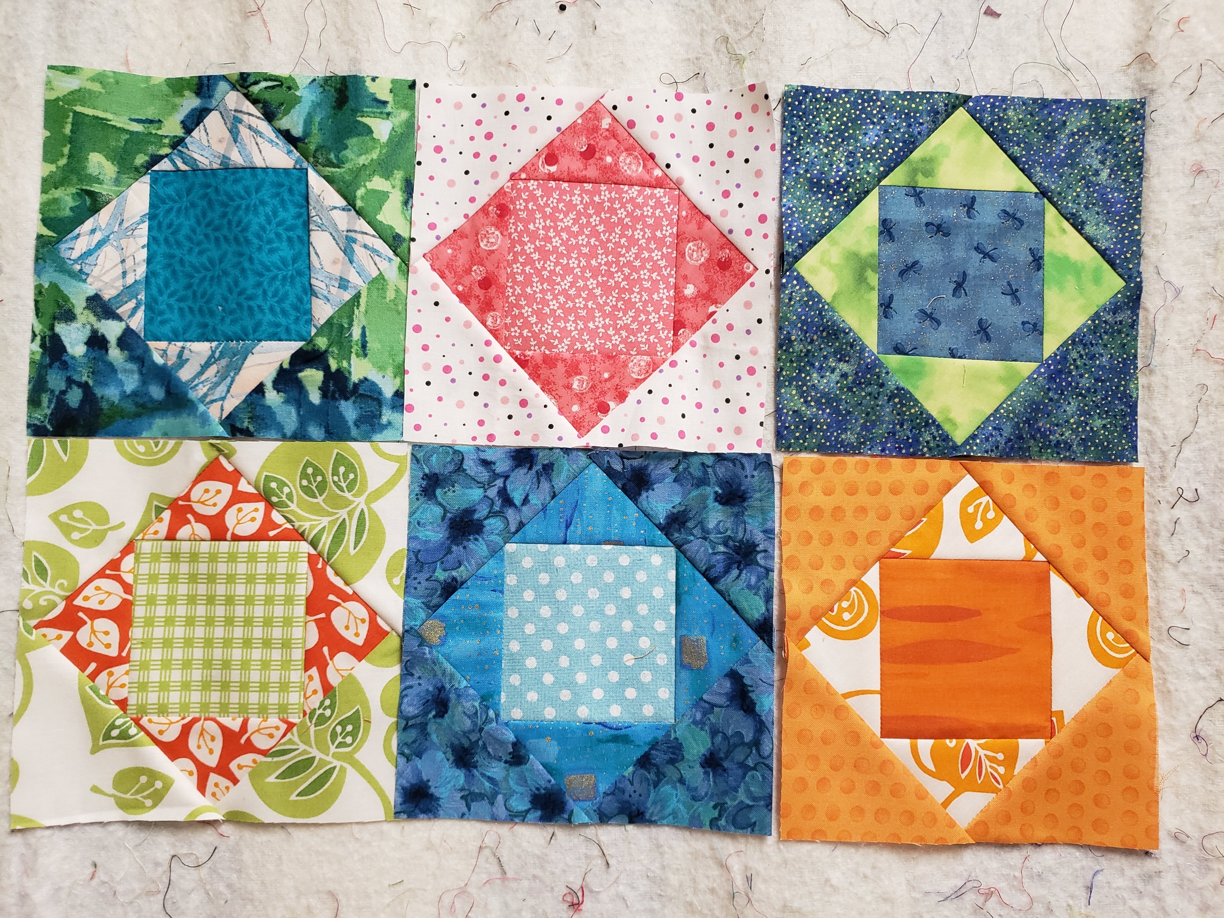 I have the “crazy” part of the baskets done, and I used only my scraps from my pineapple and square in a square blocks to do it! I even sewed pieces together if they were too small to create larger color pieces. It was fun! But one has too many straight seams, I am thinking of adding a piece on the bottom left (green) one to fix that, to make it look more”crazy”.