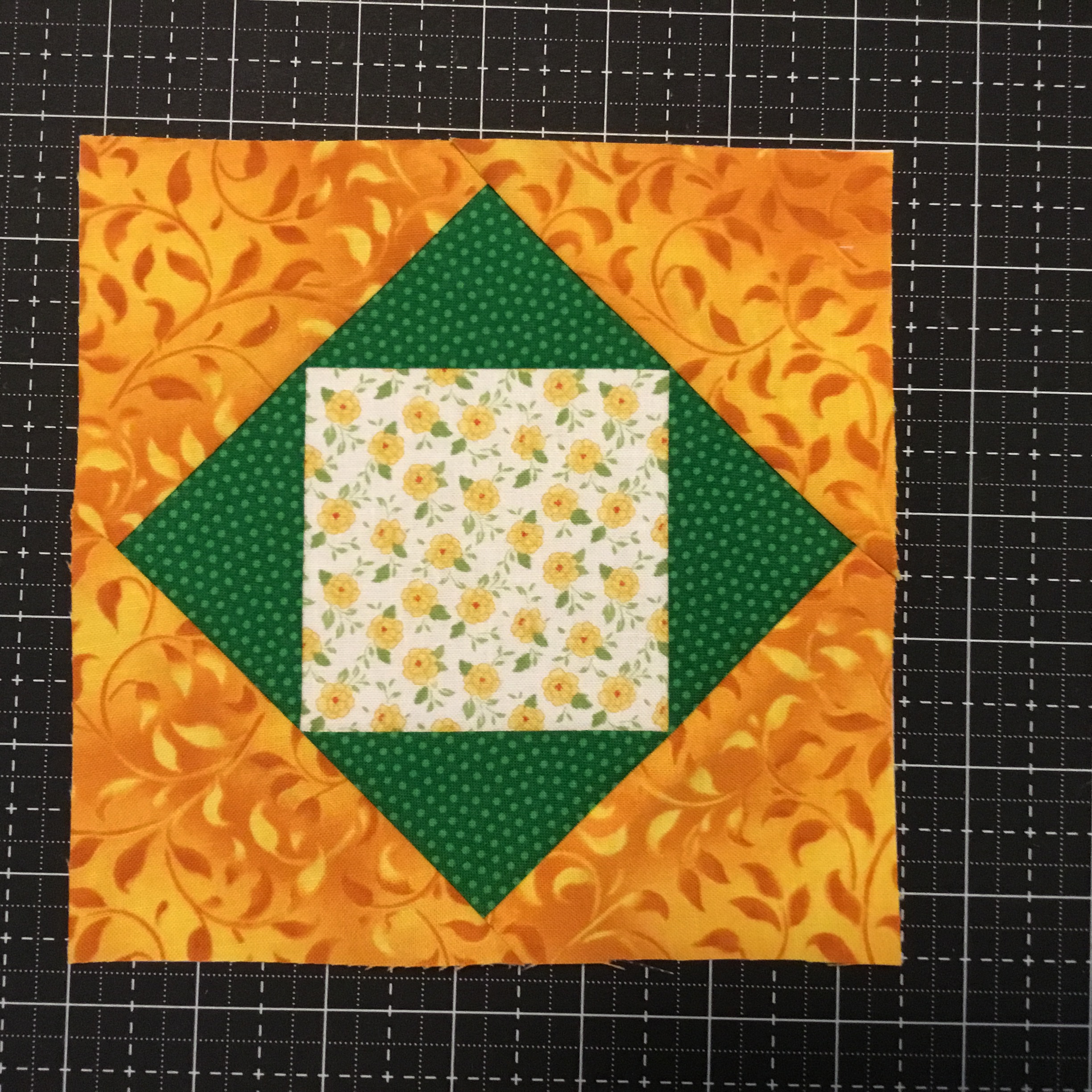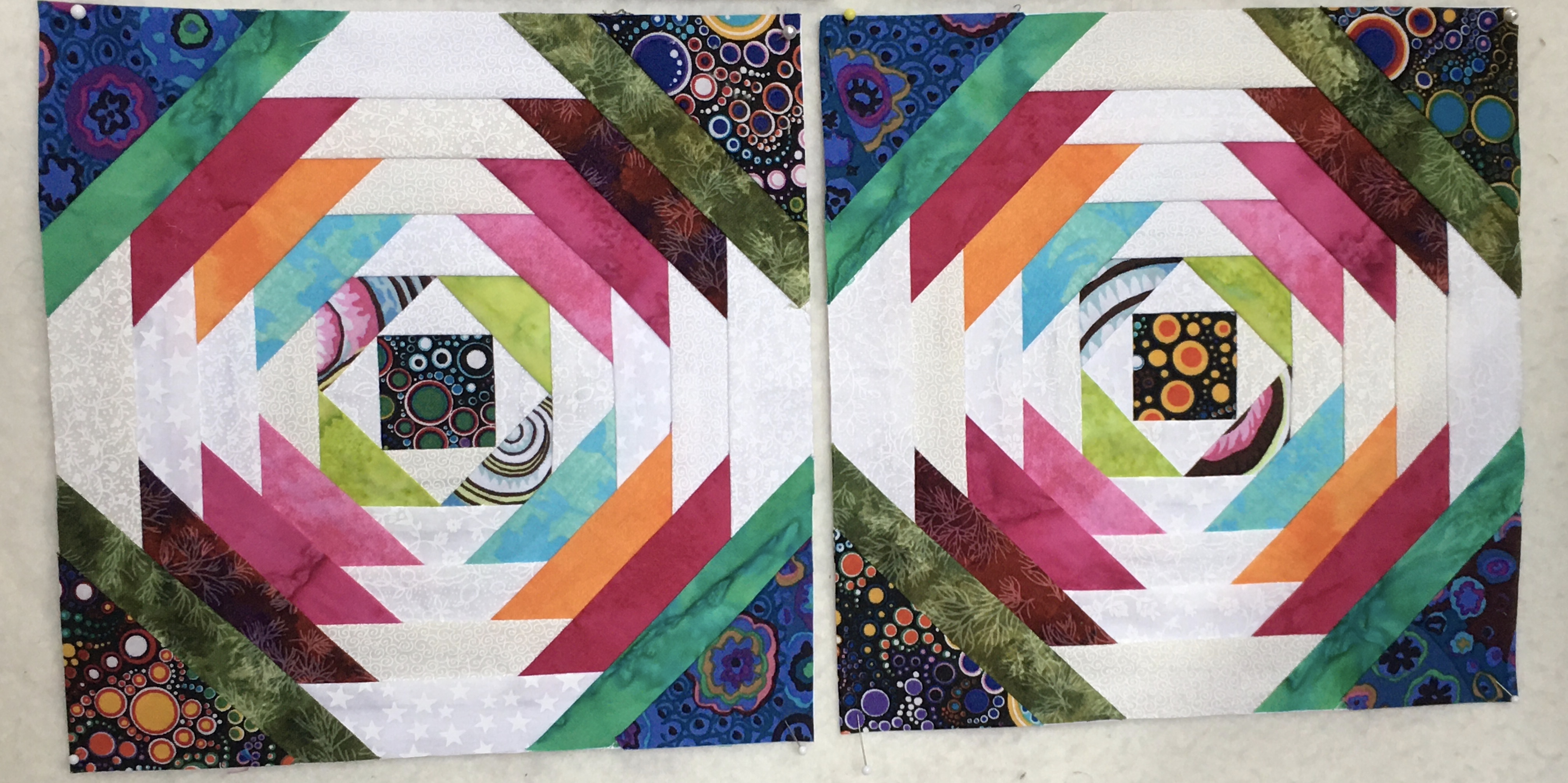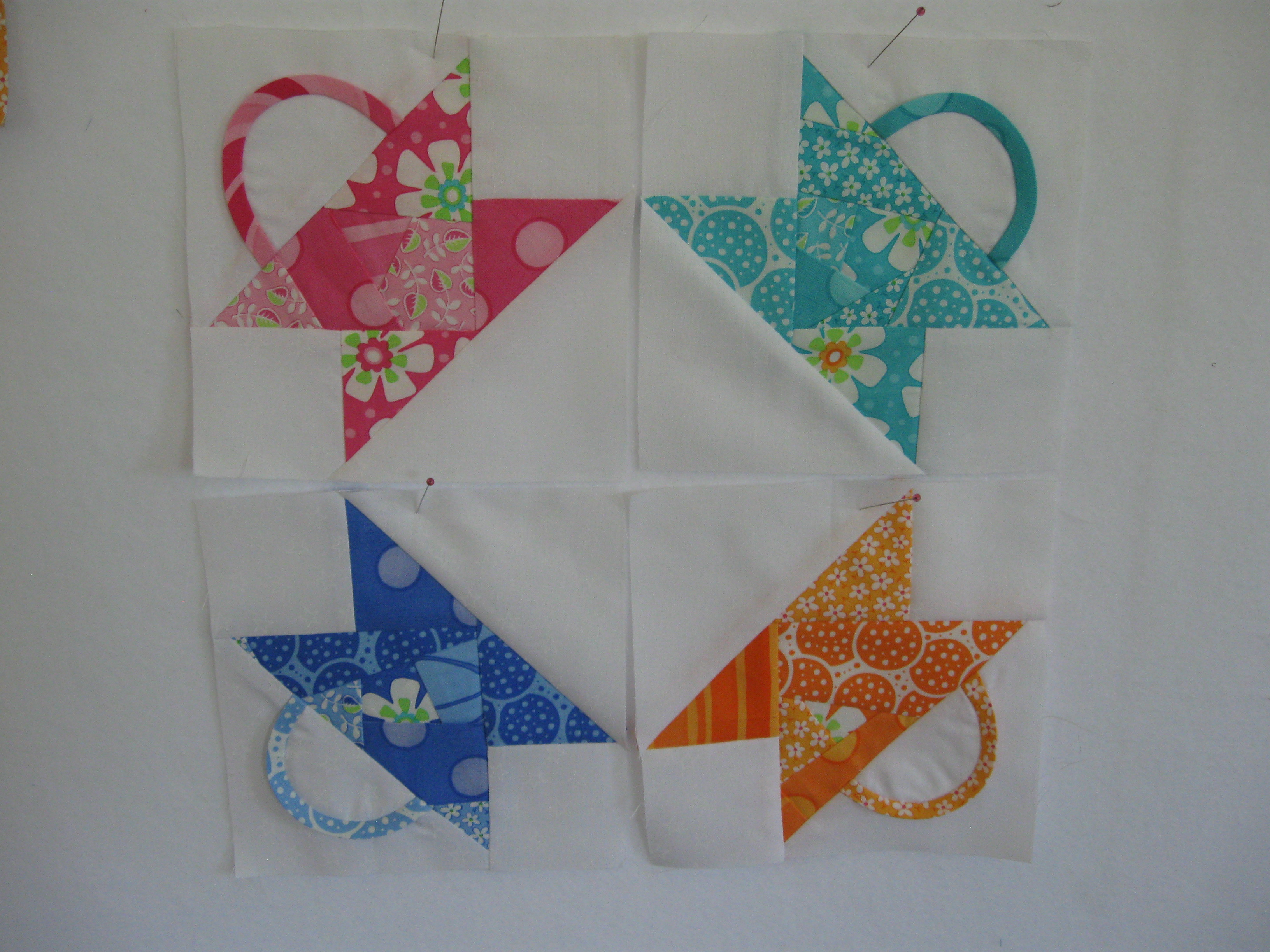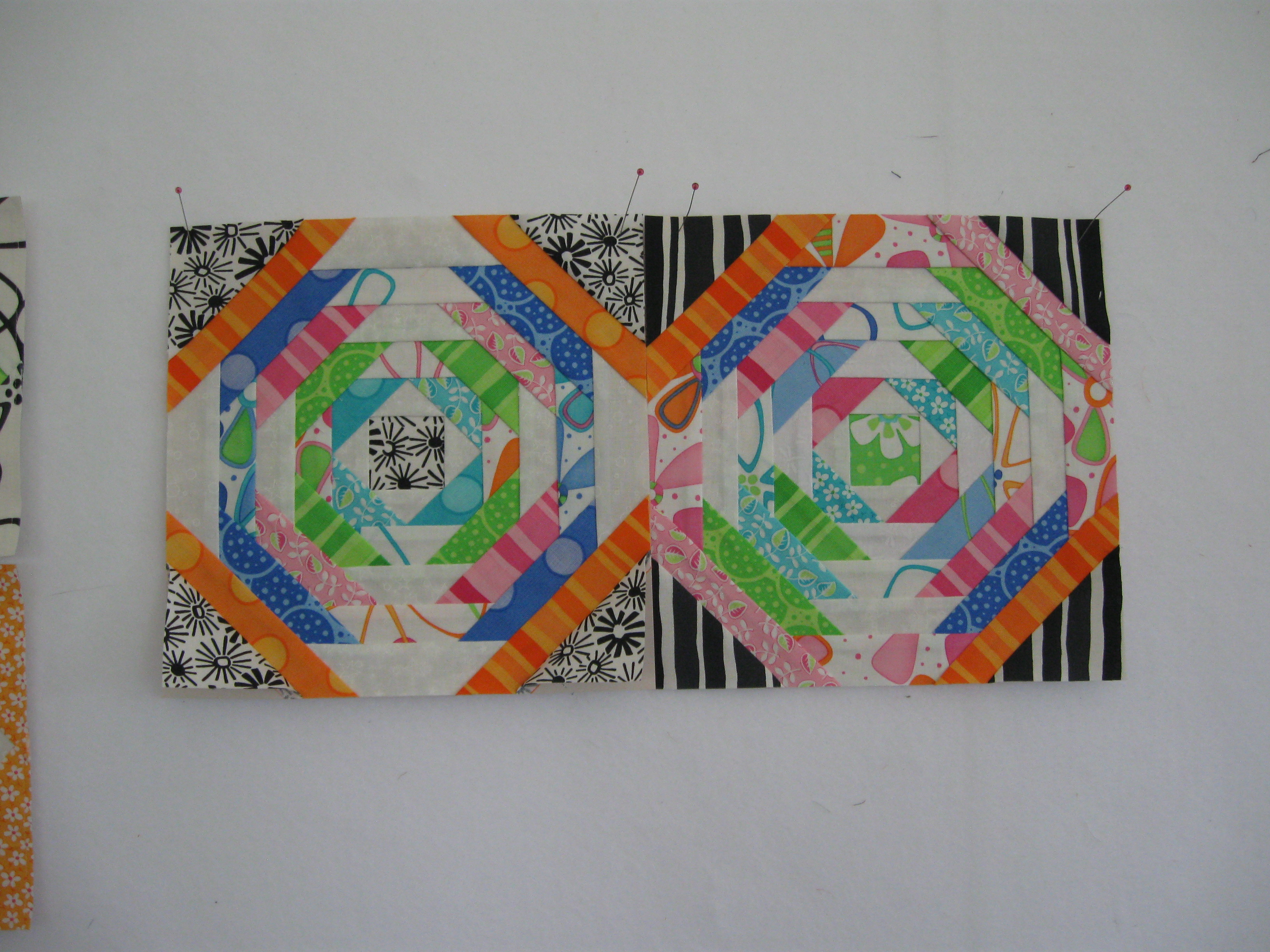 I have the “crazy” part of the baskets done, and I used only my scraps from my pineapple and square in a square blocks to do it! I even sewed pieces together if they were too small to create larger color pieces. It was fun! But one has too many straight seams, I am thinking of adding a piece on the bottom left (green) one to fix that, to make it look more”crazy”.