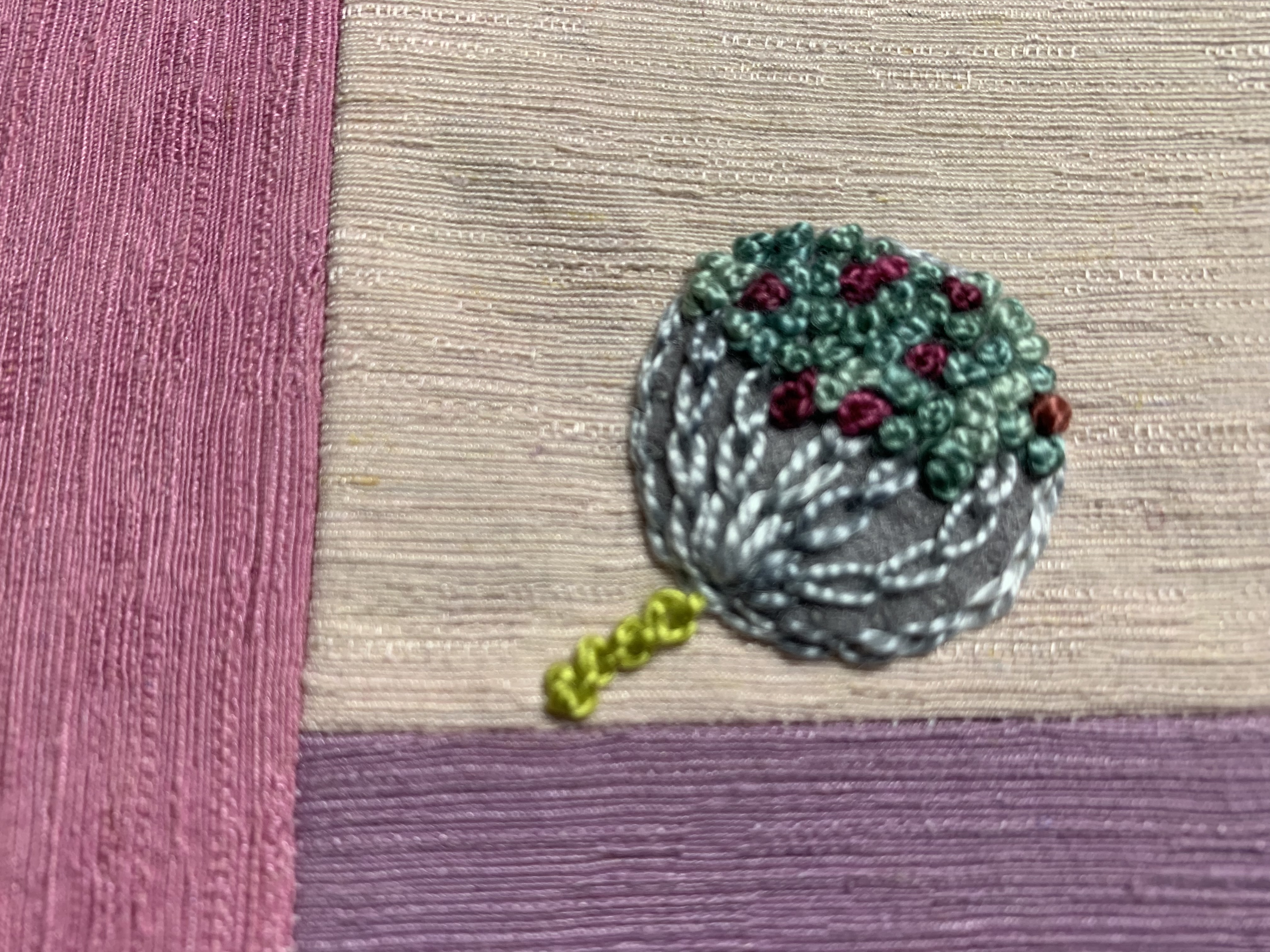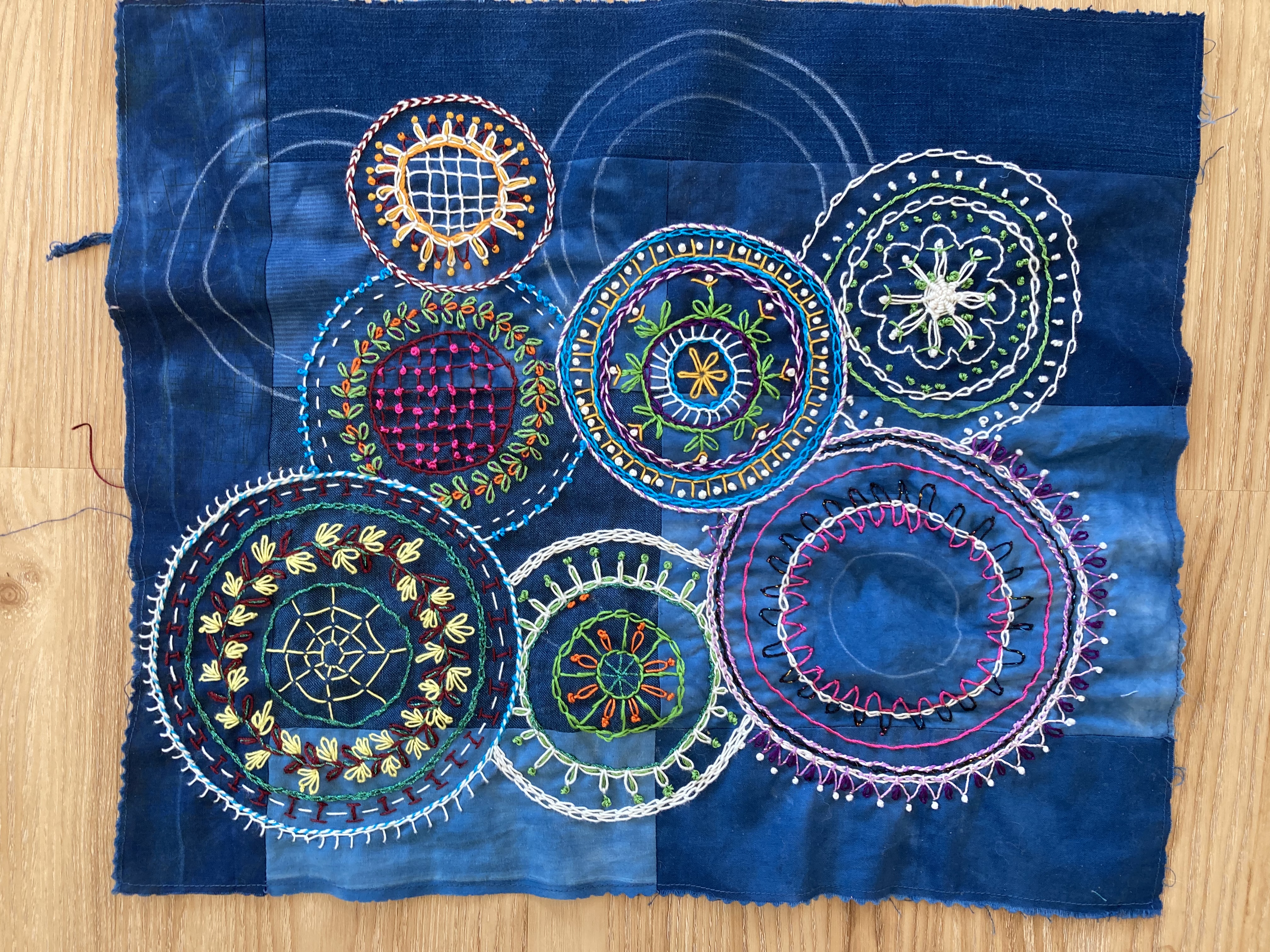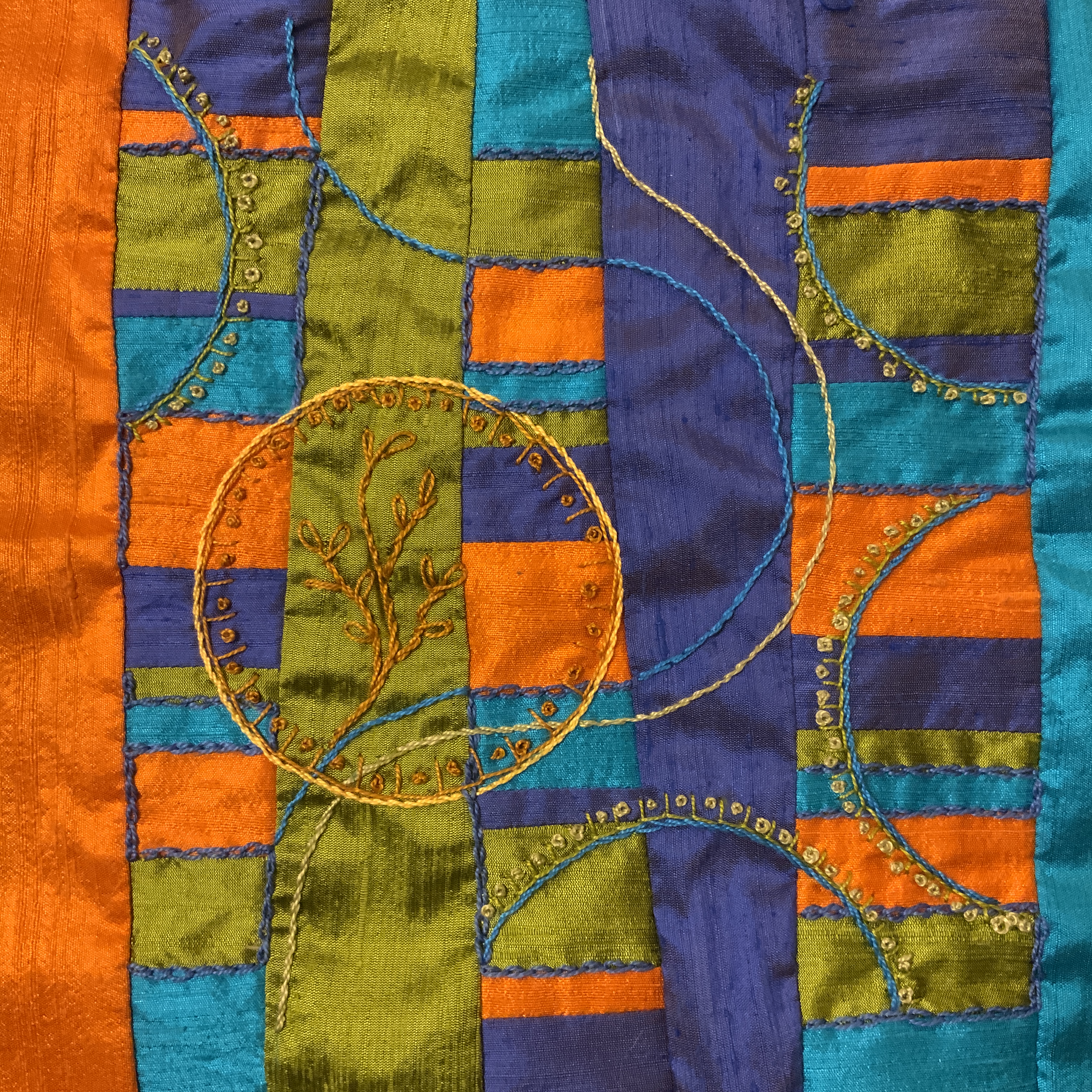 Hey everyone, this is my first time on the Forum. I was looking for a road trip project, when I found Alex’s embroidery class. I have been doing a lot of wool embroidery, but have not really worked with silks except for a sampler crazy quilt. Joining late and under a time crunch I dug through my stash and found several silks I bought years ago and forgot about. Below is my progress to date… I love the modern layout combined with the traditional stitches…having a blast…