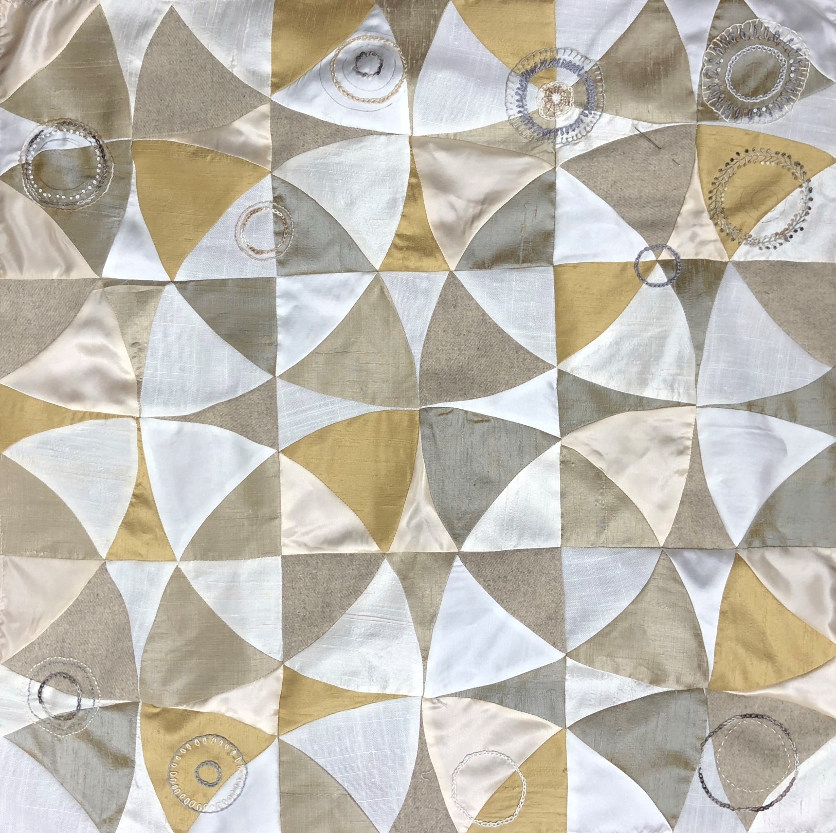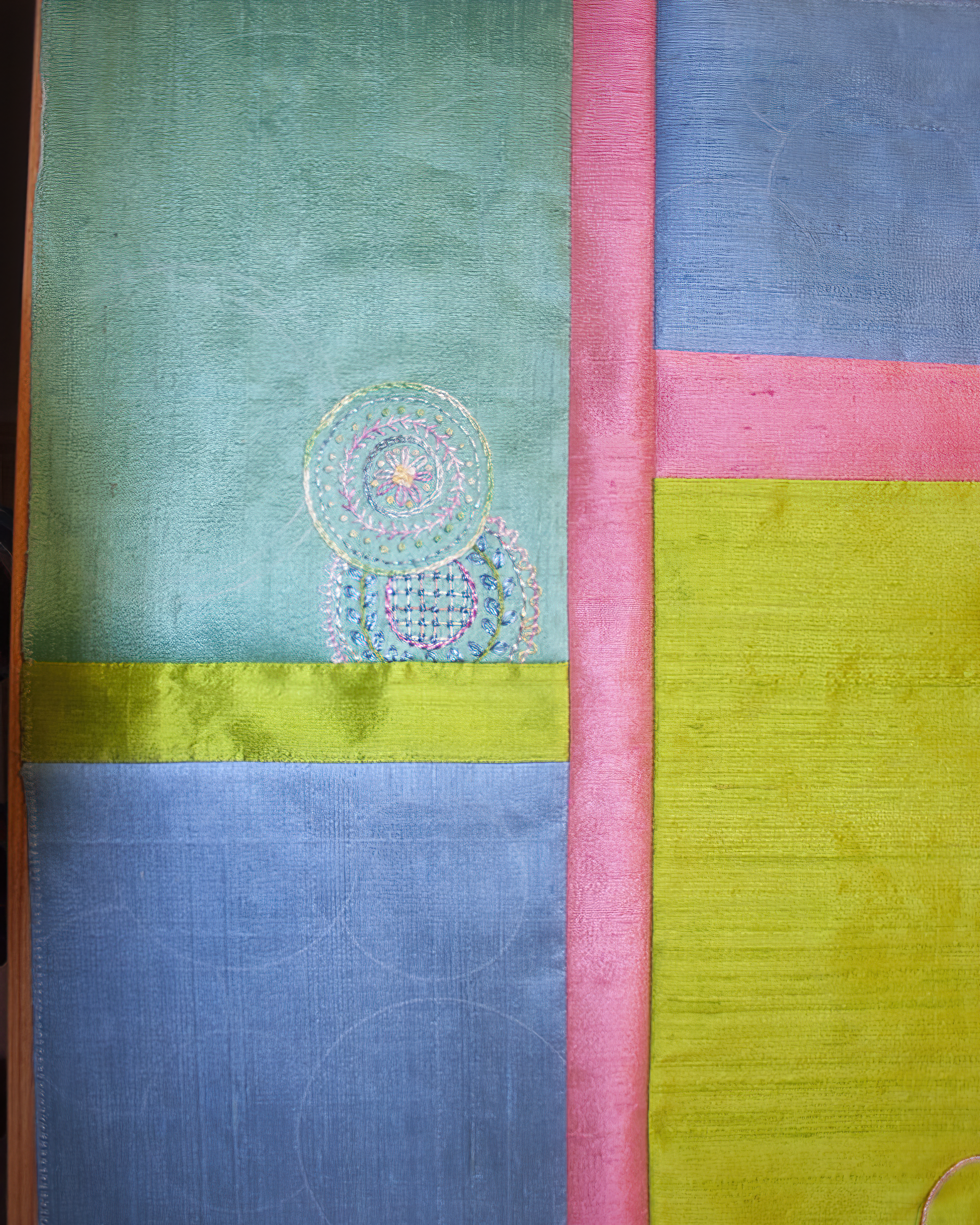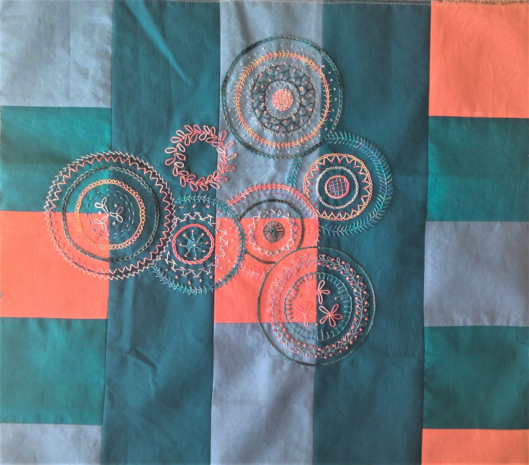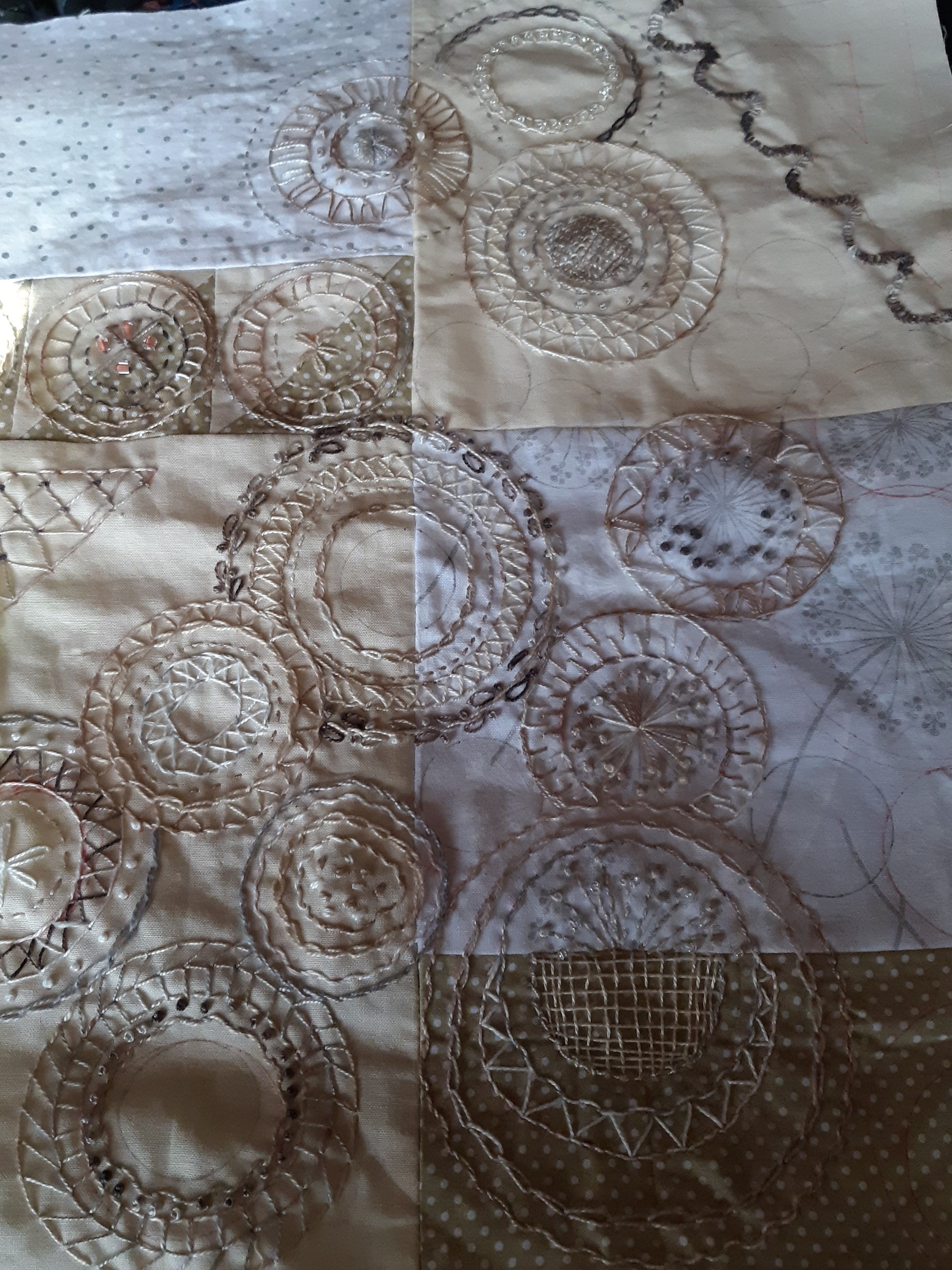 Adding circles with running stitch around each of my 30 circles. Have added batting and backing and will ultimately be framed. May add some additional straight stitches on several blocks. Time will tell.