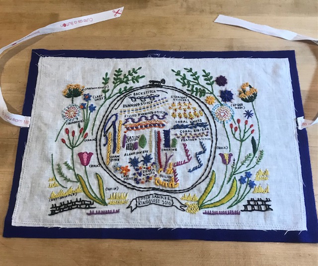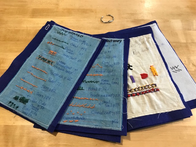 Peg, I love your idea for a stitch guide. Would love to see a photo of the cover laid out flat so I can see the whole design.Originally posted by MSHendel View PostDecided to get more organized on learning stitches- I took my sample pieces, labeled them with name and page #s, and backed with 7"x10" felt. I put a button hole in each corner and put all the pages on a ring. Then I made a cover out of a 2010 (!) class project of fancy stitches. I also backed this with felt and put a ribbon loop inside for the ring. Now I can have a good visual reference as I decide what to do next and I can see which book to refer back to for directions as needed. This was a good snowy day project! Now I'm ready to get back to the circles on silk as I'm super excited with new ideas.