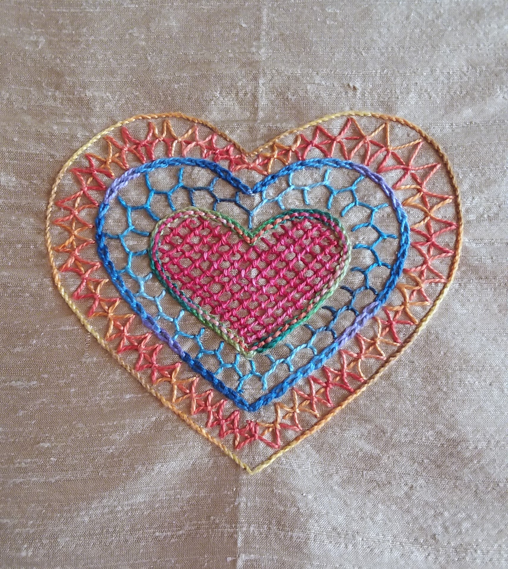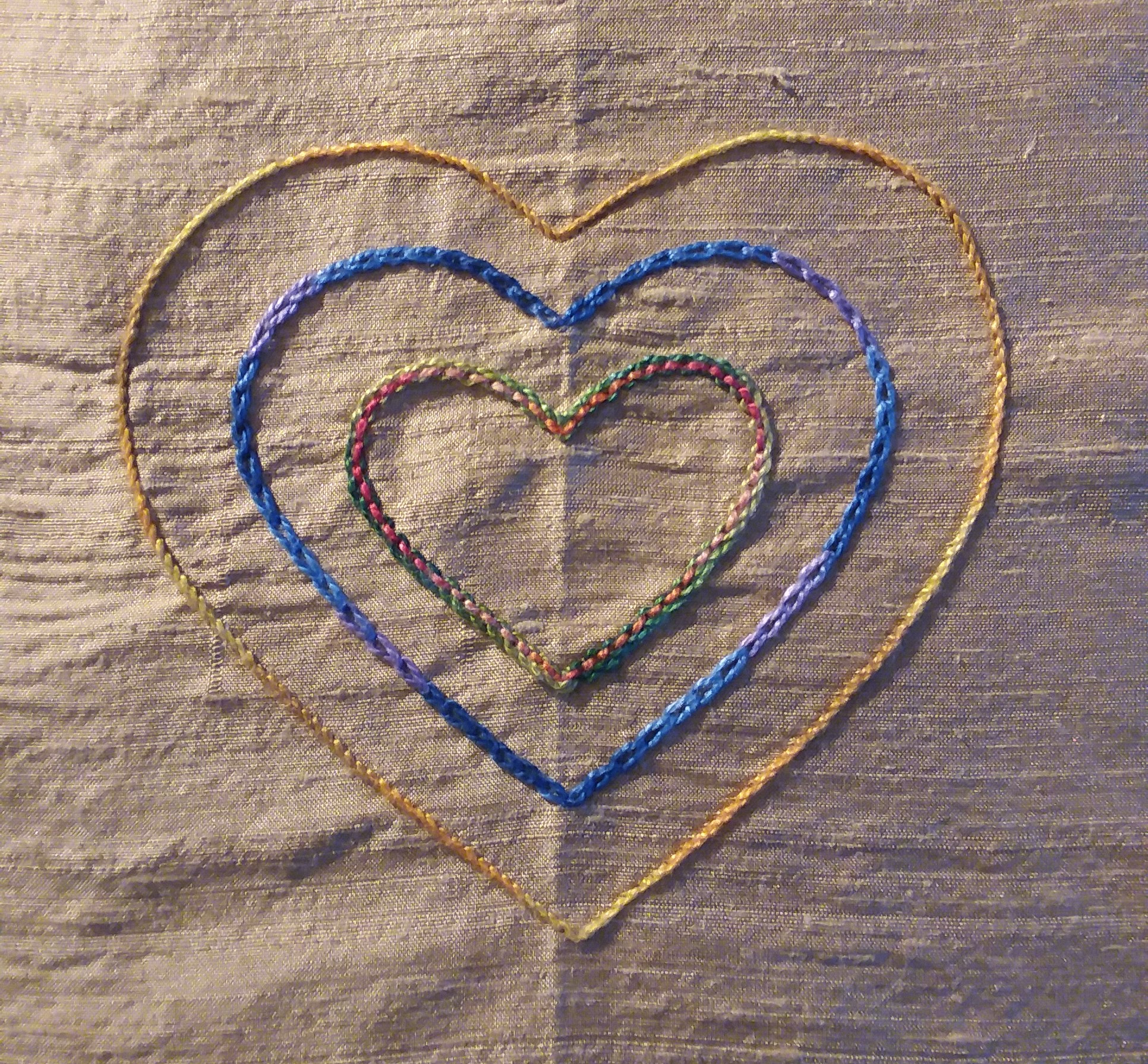 I am using the threads in the brights kit. On the inner heart, I used the Pekinese Stitch from Sue Spago's book (pp. 40-41). It's a foundation row of backstitches with a weave of e's through it. The filling stitches are running stitch & fly stitch (orange), cretan stitch (blue), and the grid (red) in the middle. Next, I am going to do the lazy daisy vine around the outside. I also think it needs some French knots and flowers.