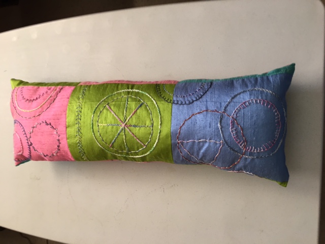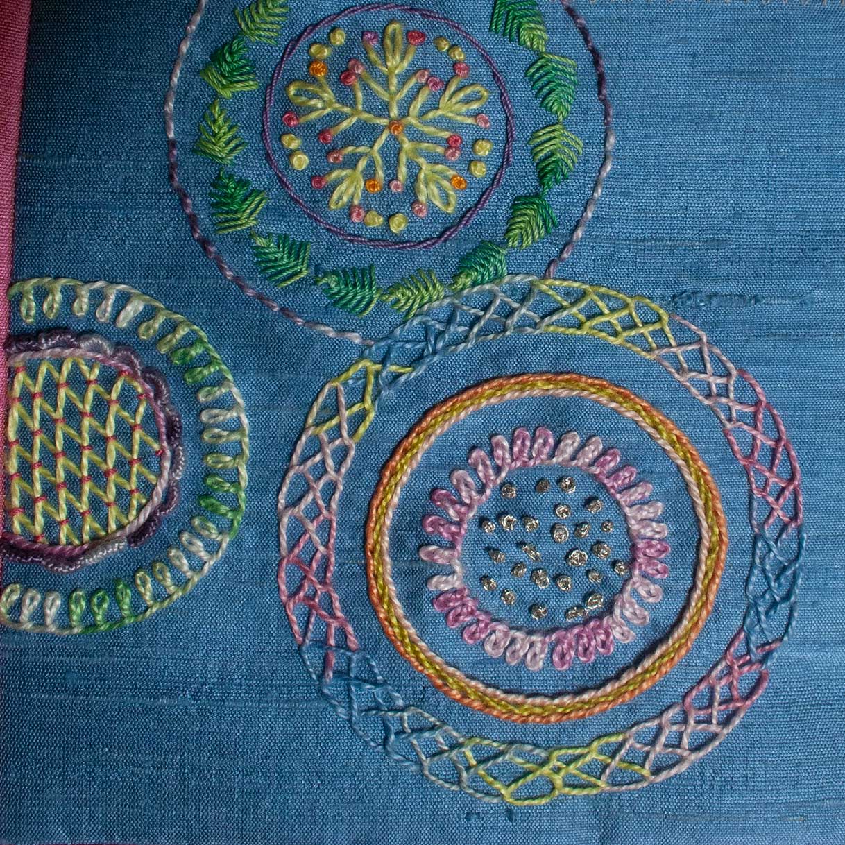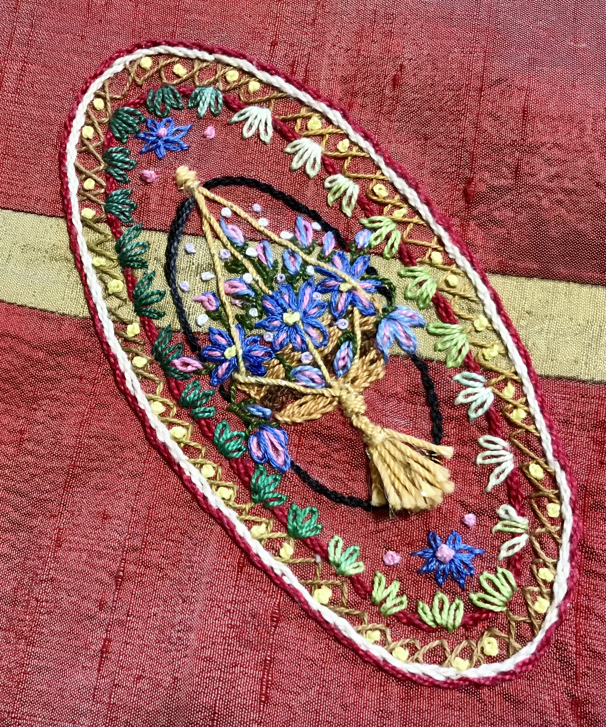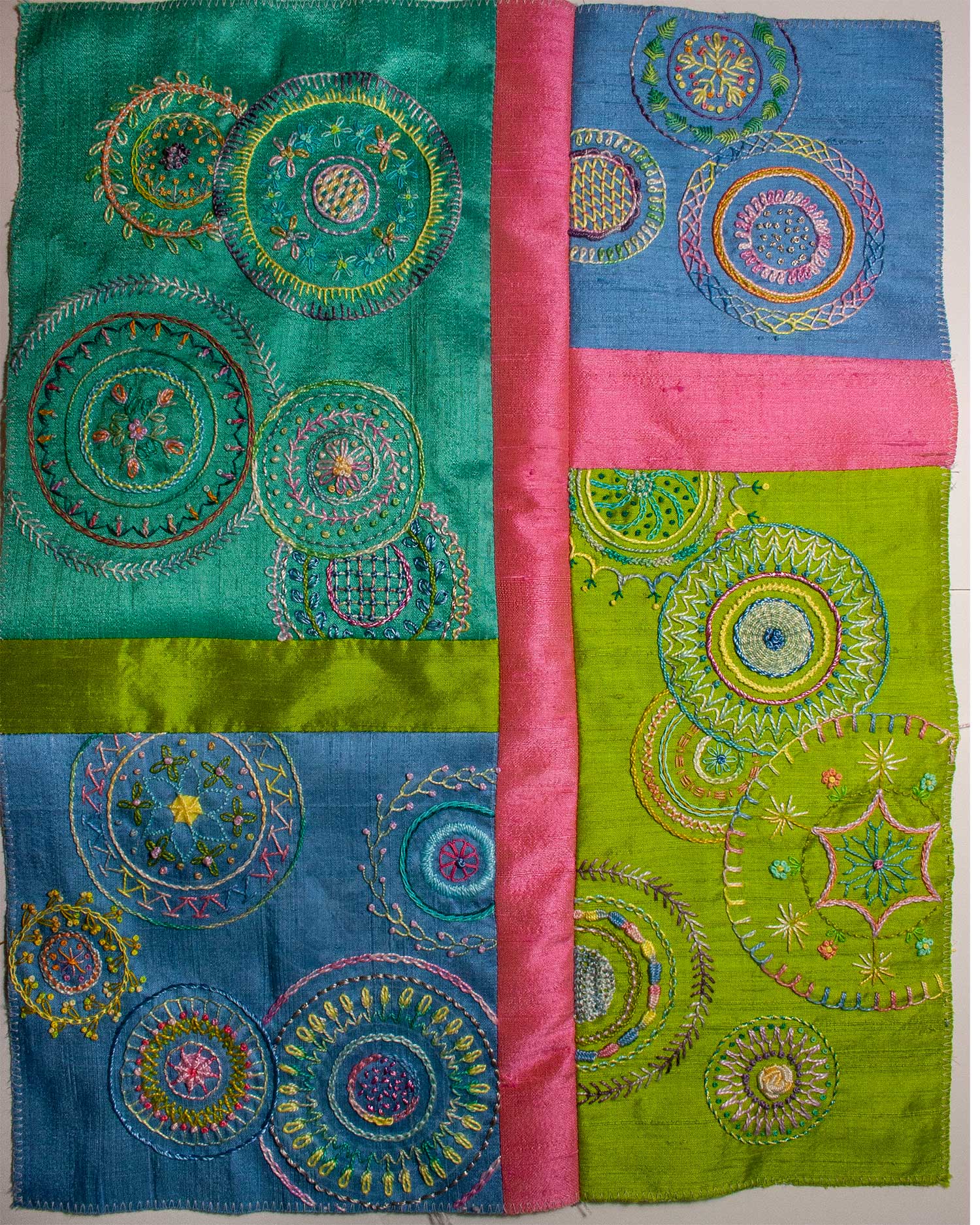 I decided to put some decorative stitching on the sashing. Right now I am contemplating a woven chain stitch with some flowers in one of the sashes. I usually stare at the project and peruse the books until I get a brain wave. Will post my progress.