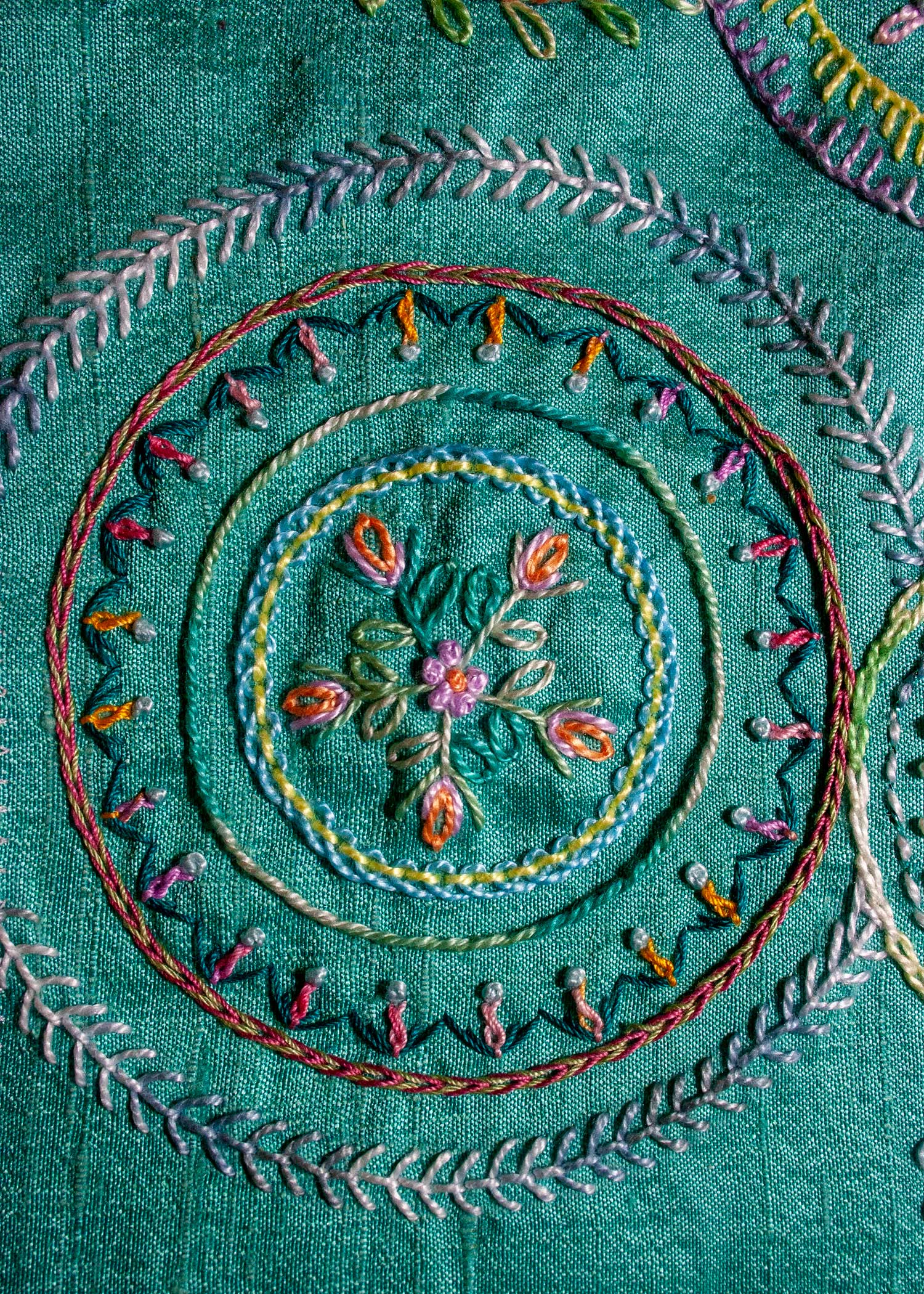Thanks, Helen. Chain stitch it is! I have to decide what to put in the middle. Will post.Originally posted by HelenW View PostSuzanne, What a masterpiece of stitching. Just Love It!!! I love the chain on the long section.