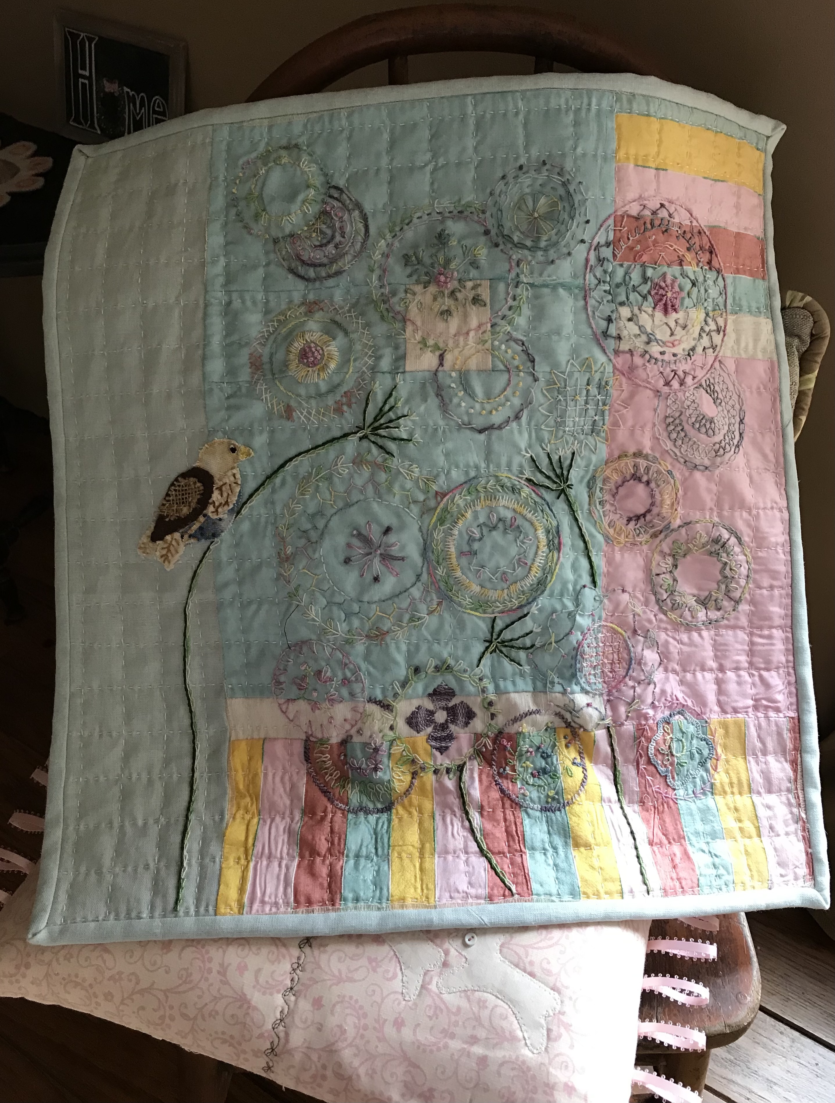 I have finished my Make It Your Own Embroidery! I kept staring at it and wondered what it looked like… and finally decided it looked like a field of flowers. So I added the blue linen on the left, the 3 Queen Anne’s lace stems and flowers, plus the bird to further that idea. Also added the background grid quilting and linen binding. I’m going to use it as a small wallhanging.