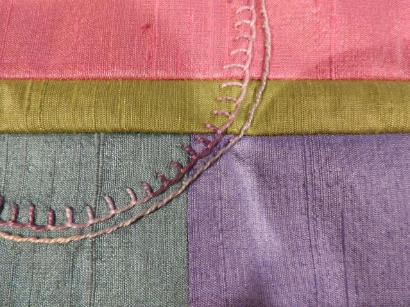 Here is my background piece for our embroidery fun. I used silks that I have had for probably 20 years… a fellow teacher gave them to me. I have 5 yds. or so of the colors in the picture plus a black one and a white with stenciled black leaves. Some are Jim Thompson Thai Silk and some are T. Shinawatra Thai Silk. And BTW, silk fabric does not smell good! I googled the smelly problem many years ago and found that you’re supposed to put in on a hanger and take it outside to air for a few days… hmmm…