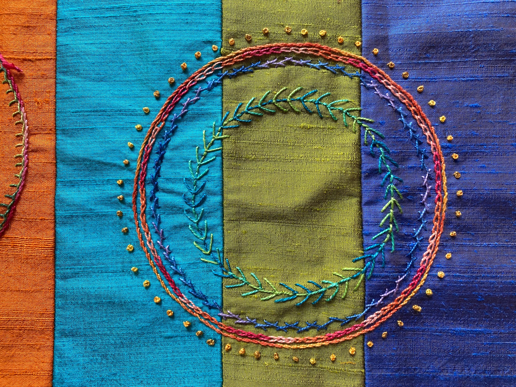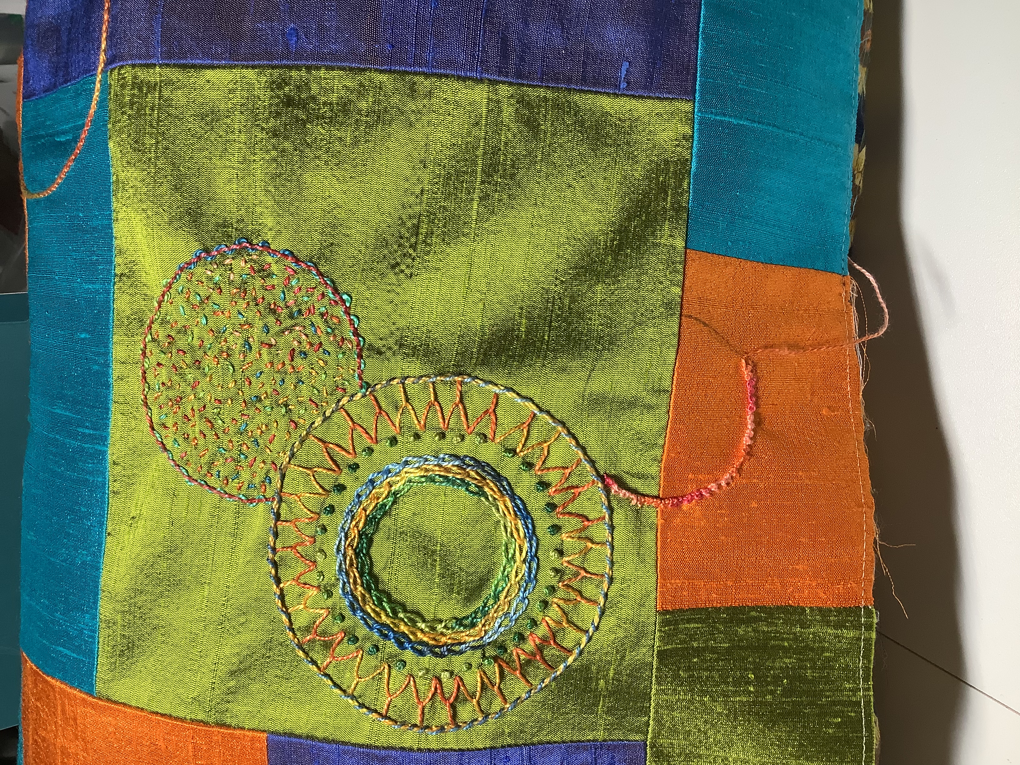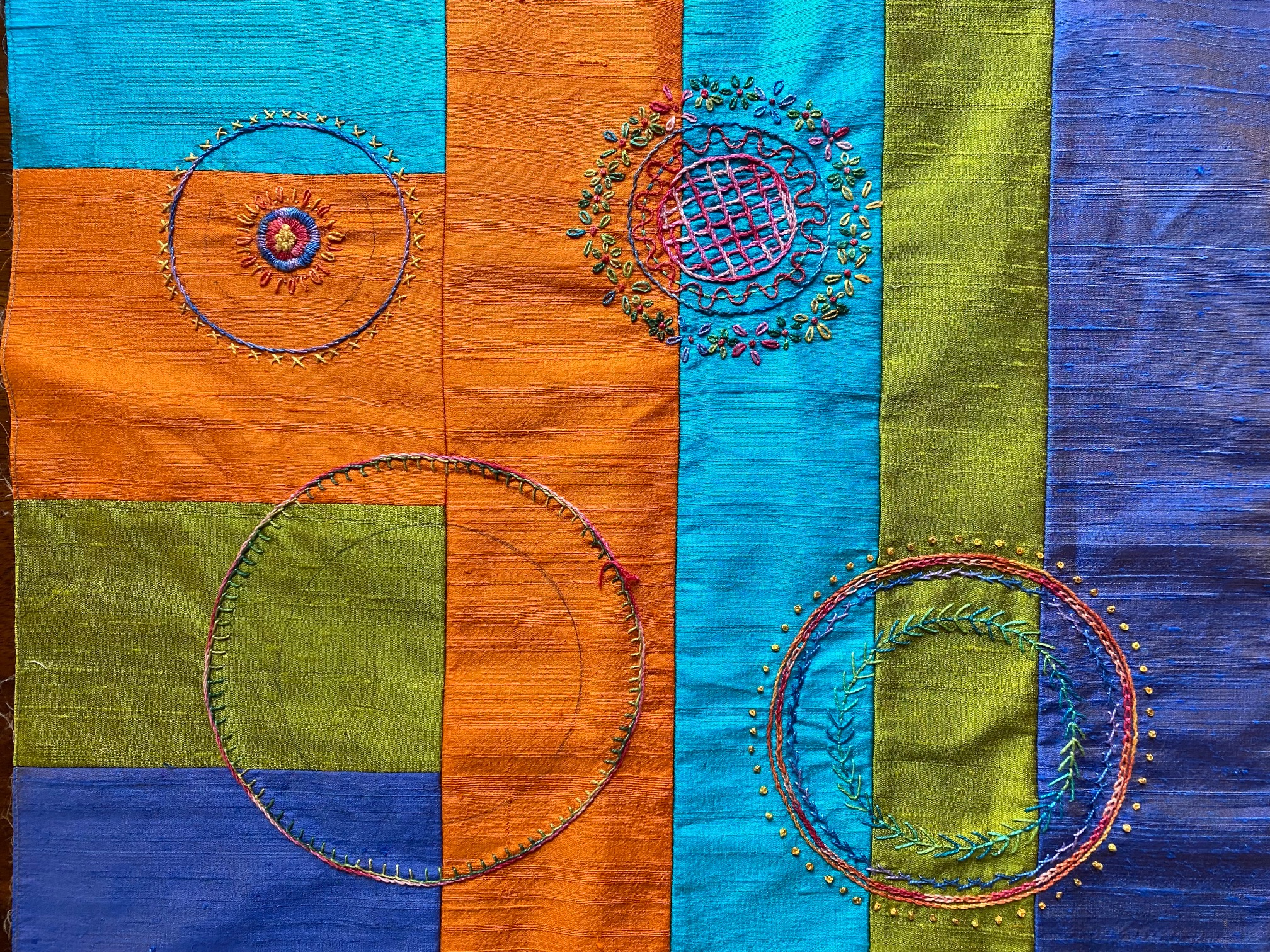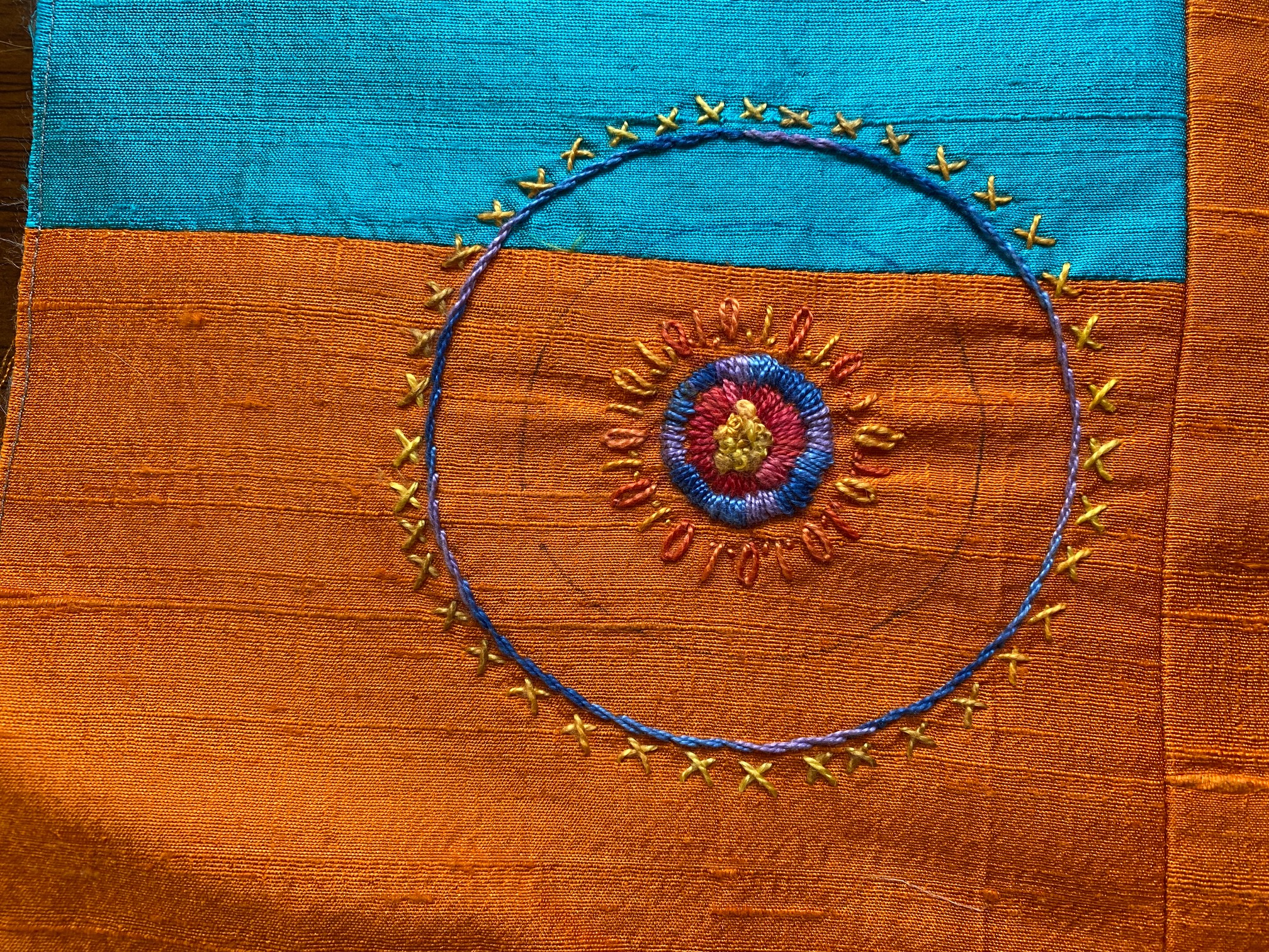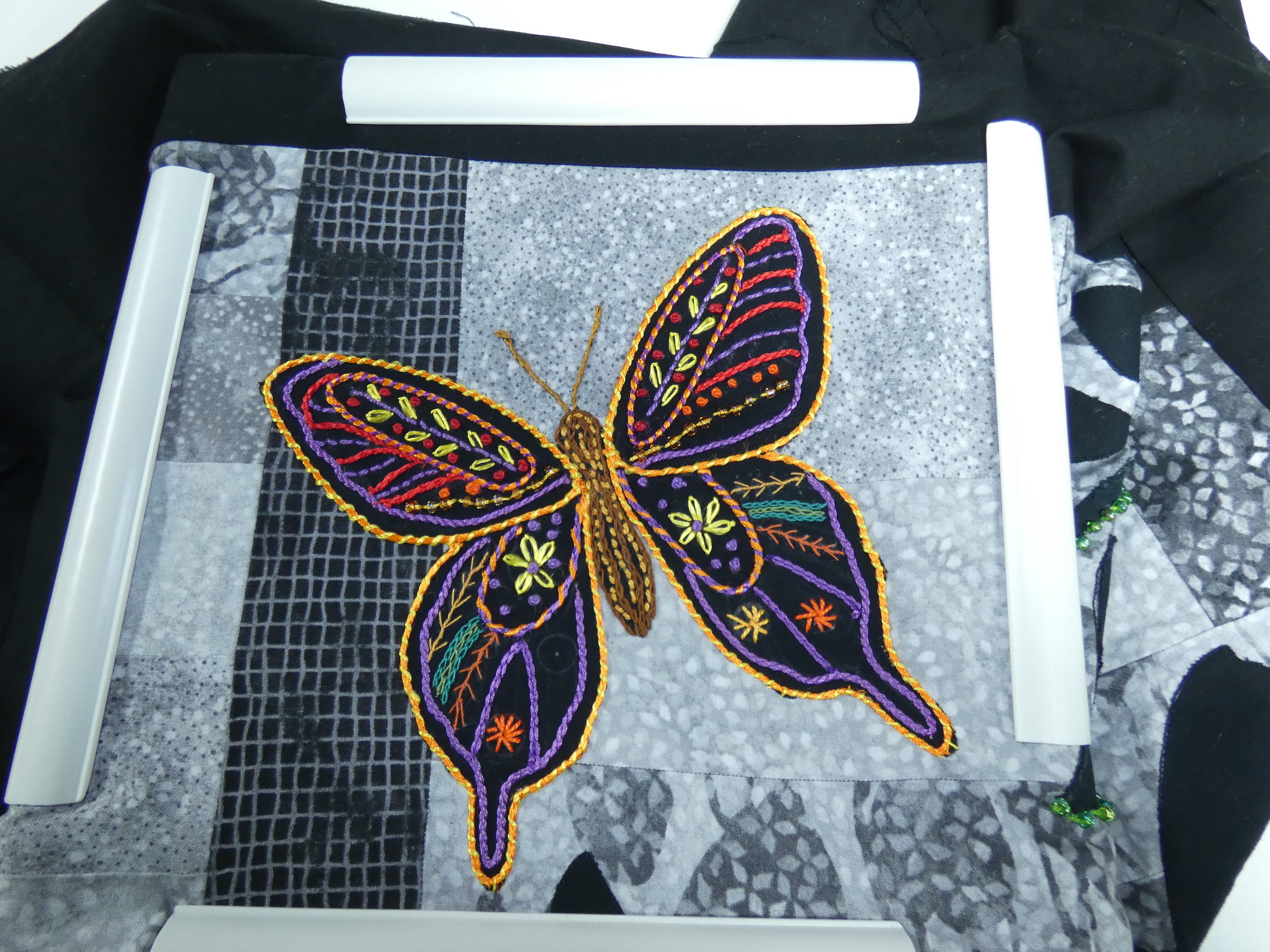 I am really enjoying this project! I went digging in my old cross stitch and embroidery supplies and got really excited to be stitching again. I had some perle cotton and bought some (okay- a lot more!). I found a fat quarter of black woven fabric in my Stacy and decided to use that. This is what I have so far.