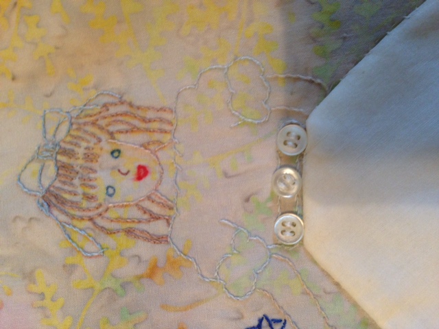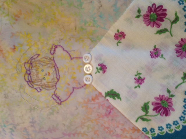 I make a jacket from my Grandmother Hayes' hankies & did two dolls embroidering the face, hair, arms, etc. I also did a butterfly. I used her butons as the band on the dresses & a big button for the face of the butterfly. She was 106 yrs. old when she passed away. Everyone can't believe I did this.I used straigh stitches, slip stitches & satin stitches for the flower centers. Thought you would love to see it.
