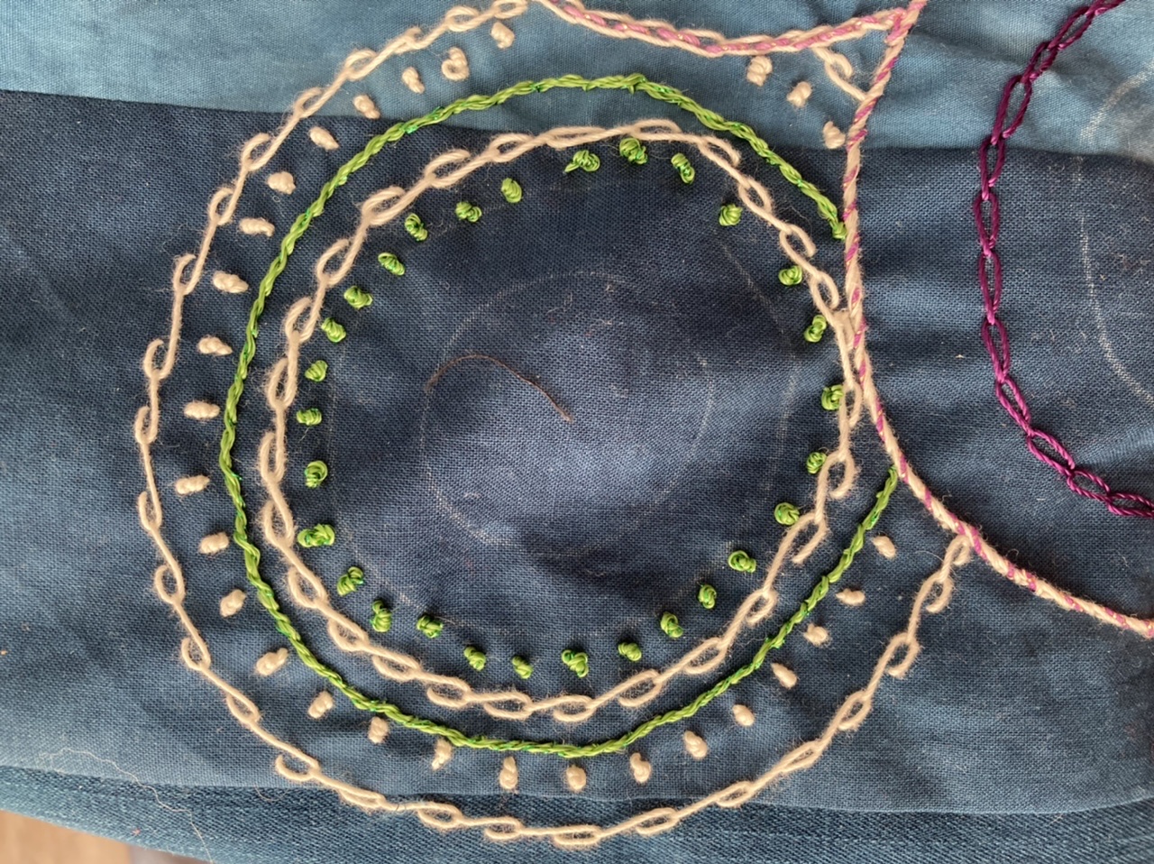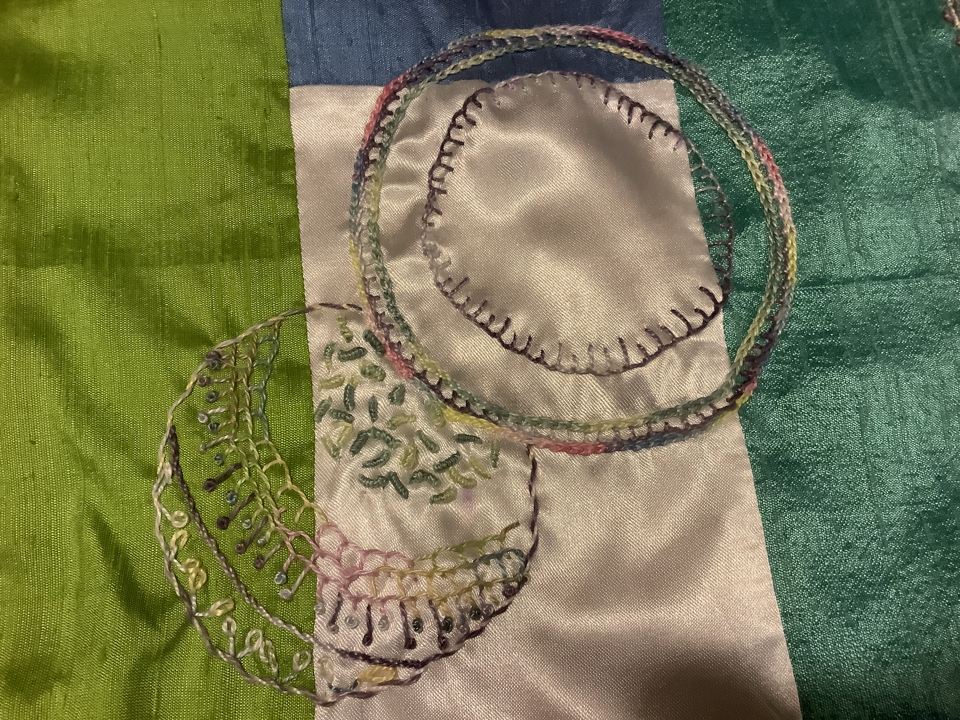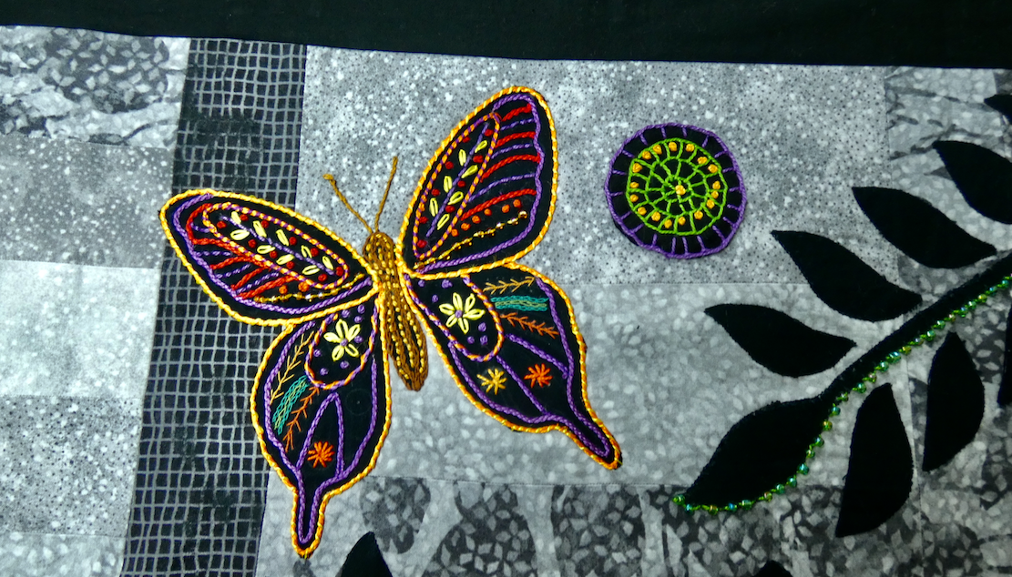 Blanket stitch on a piece of Annies soft n stable to raise it up like trapunto. I made a circle, did the green blanket stitch and knots, then cut a circle of Annies soft and stable. Put a little glue on it to hold my black stitched piece, and needle turn stitch it to the background. Then put a purple blanket stitch on. Everything is a little crude looking, but I am just trying new ideas to use in the future. Having fun, that is for sure. Thank you Alex. You are the best!!! HelenWHelenW