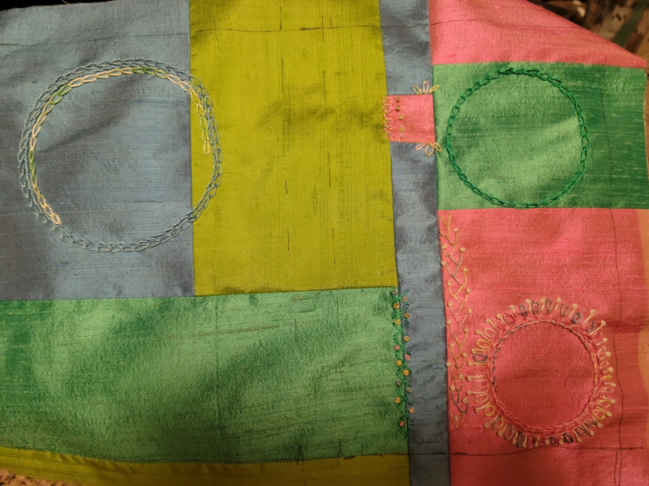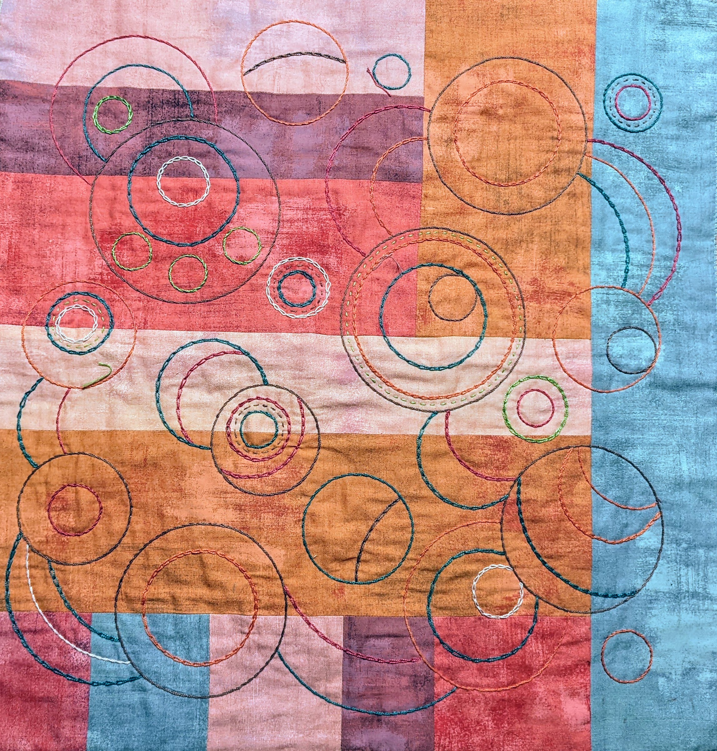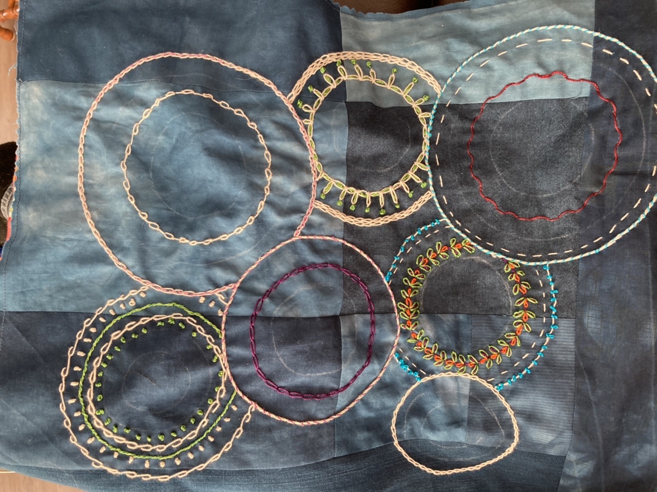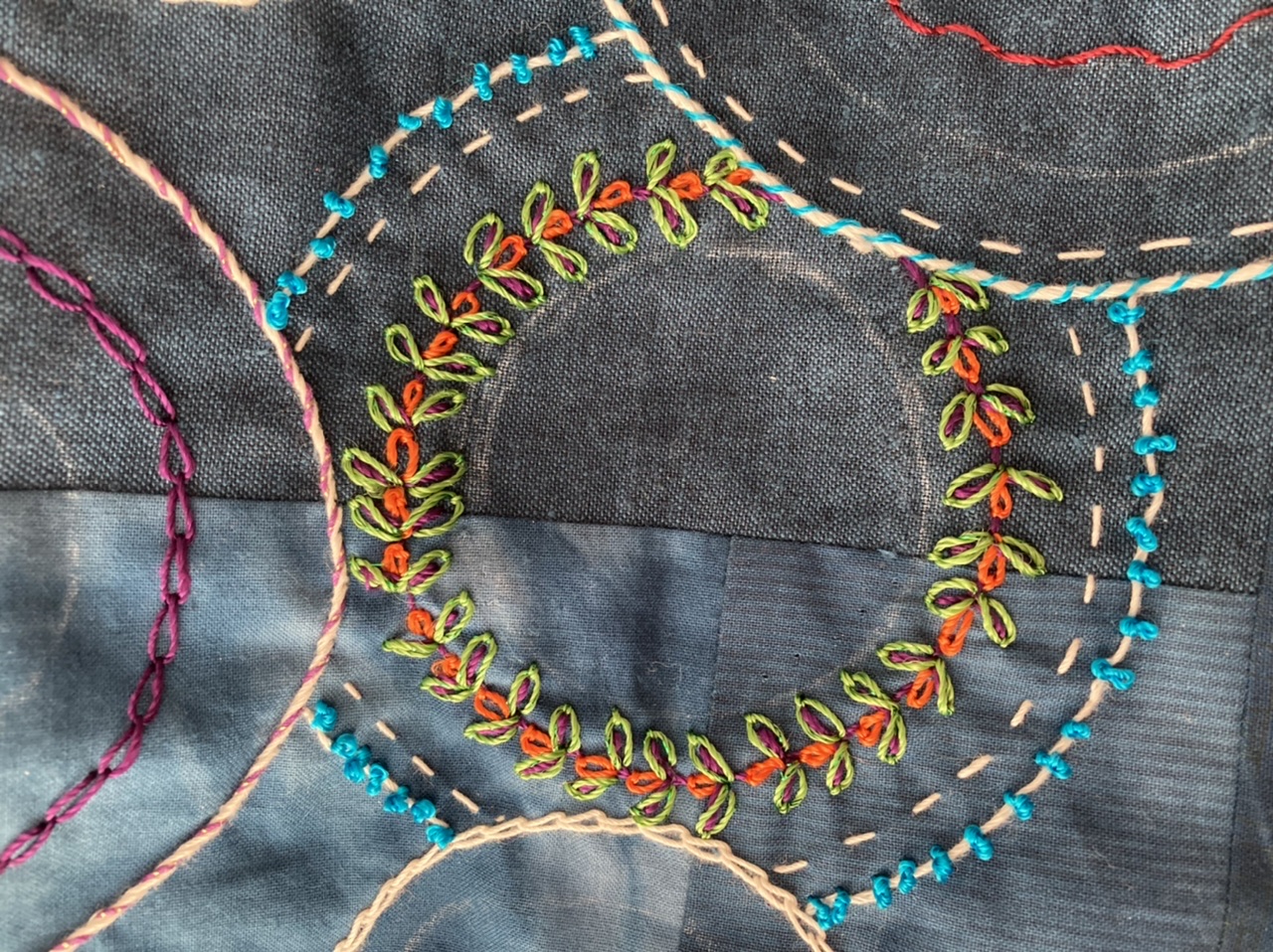 Working on the embroidery before I turn off my light as Christmas Day comes to a close. Pieced my background with Moda Grunge cottons, sandwiched with light batting, and more Grunge on the back. Circles and curves are made with bottle caps and round lids. Learning many new stitches on this layered embroidery. Very relaxing to embroider as improv! This week my granddaughter, Kayleigh, 5, is visiting and sleeping in my sewing room. We may work on a doll blanket together. Lots to do since I haven't seen her for 2 years, due to the pandemic. She is visiting Maryland from where they live in Minnesota. Making up for 2 years' worth of missed hugs and kisses too! Merry Christmas to All!!!