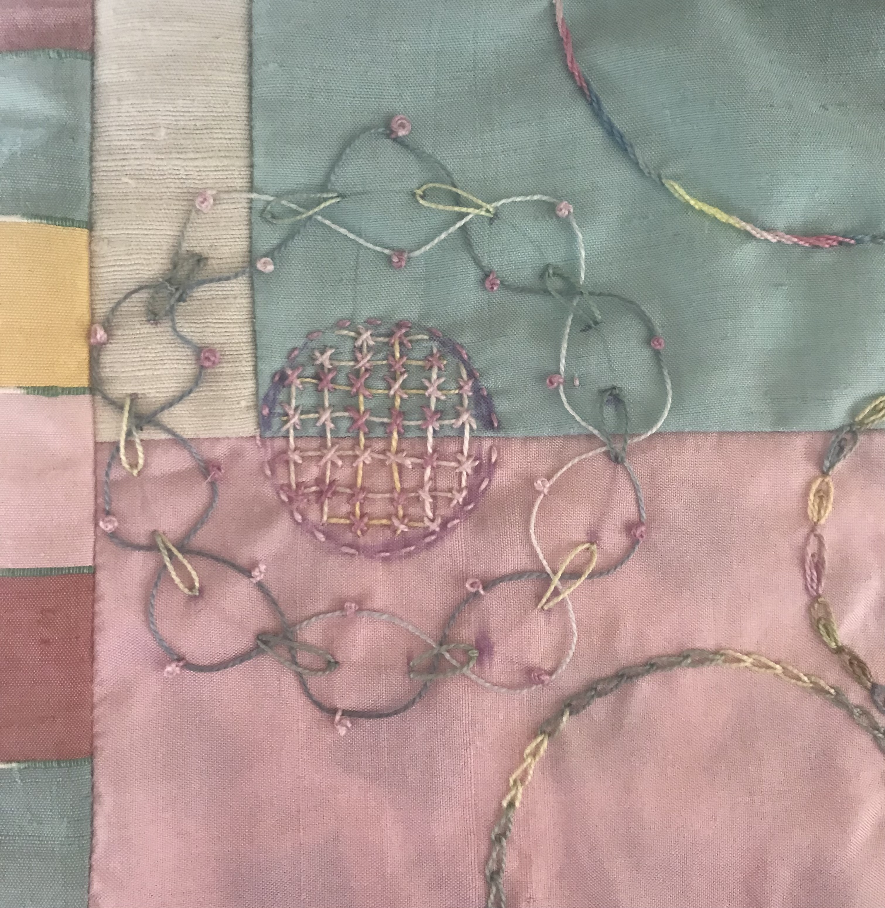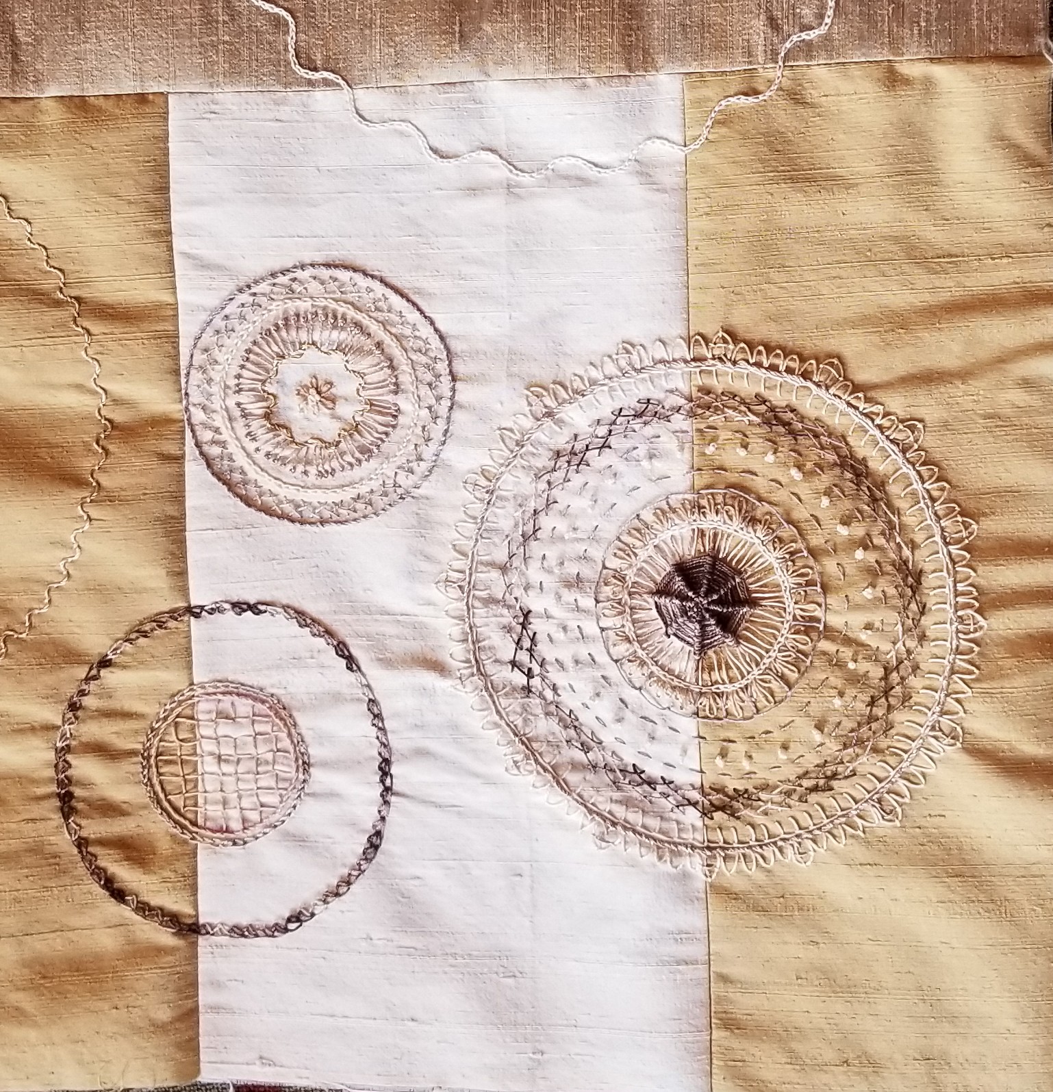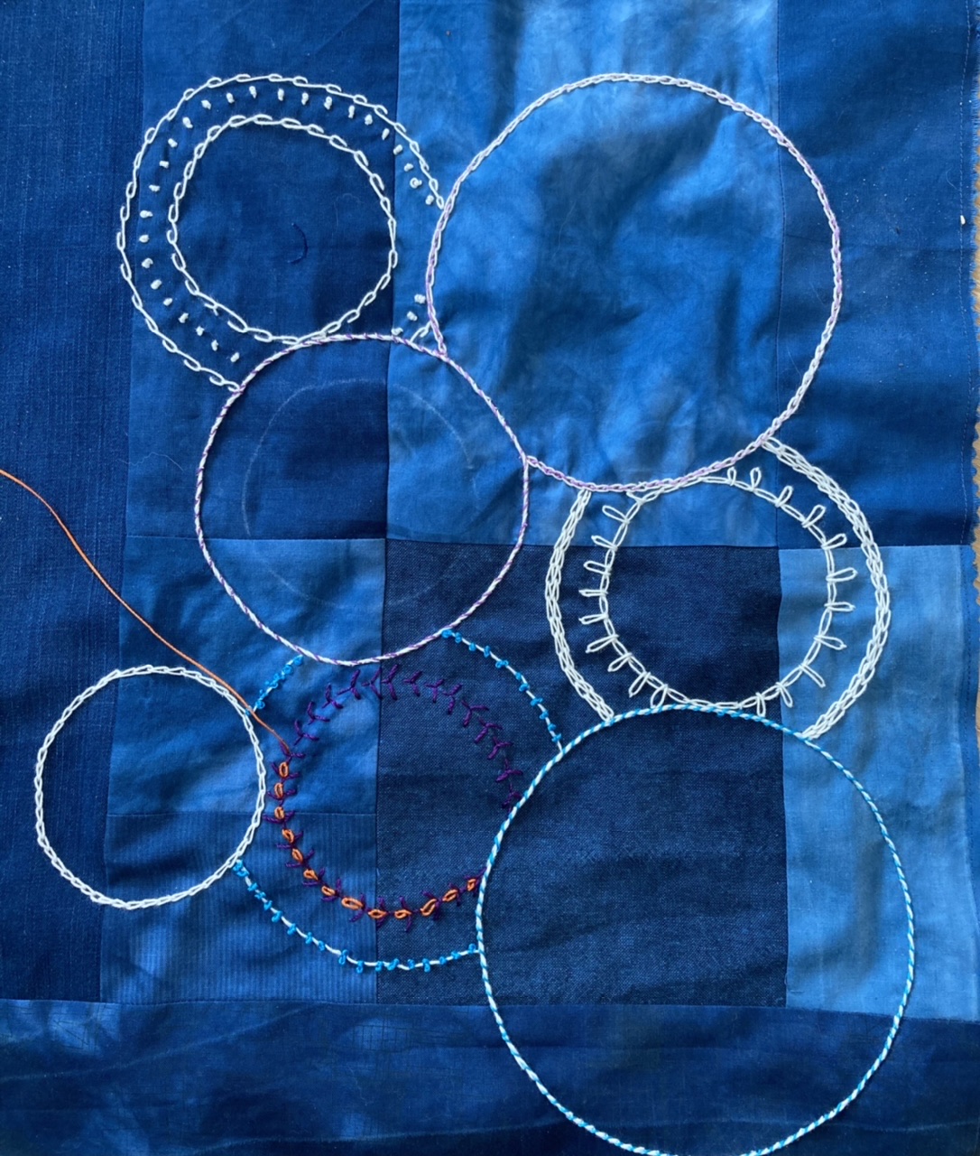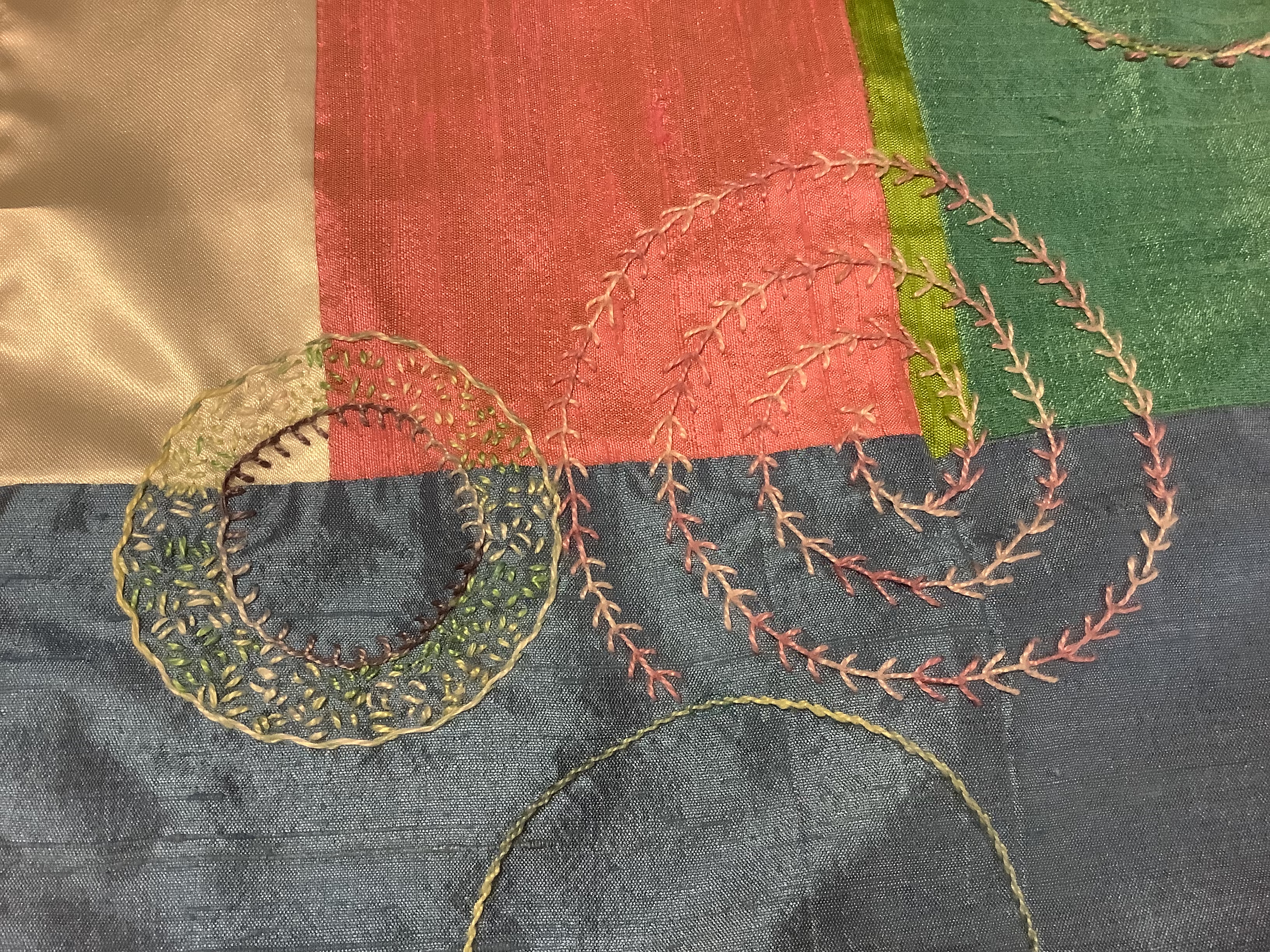 Working on the embroidery before I turn off my light as Christmas Day comes to a close. Pieced my background with Moda Grunge cottons, sandwiched with light batting, and more Grunge on the back. Circles and curves are made with bottle caps and round lids. Learning many new stitches on this layered embroidery. Very relaxing to embroider as improv! This week my granddaughter, Kayleigh, 5, is visiting and sleeping in my sewing room. We may work on a doll blanket together. Lots to do since I haven't seen her for 2 years, due to the pandemic. She is visiting Maryland from where they live in Minnesota. Making up for 2 years' worth of missed hugs and kisses too! Merry Christmas to All!!!