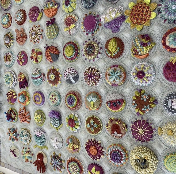 Helen—Sue Spargo does a lot with circles. Theses are a few photos I took when I visited her shop this summer. So much eye candy!Originally posted by HelenW View PostNothing to show yet. Thinking about using a black piece of Kona cotton fabric. The thread colors will pop.