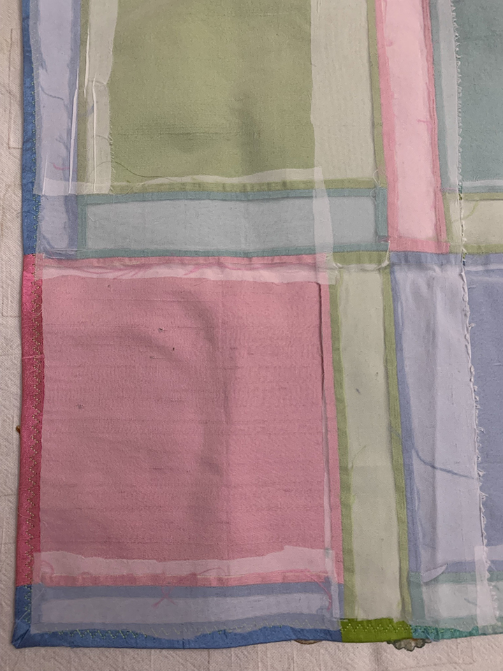 My background is prepped and ready to go. I had plenty of stablilzer and no problems ironing it on. I went with a fairly simple background that spreads the color around. I love the diversity of color. Just sewing these pieces together, it seemed that the seam allowances were fraying fast. I was concerned that while handling the piece it would continue to fray. I used my scraps of stabilizer and put another piece over each seam. I also turned the edge and used a zigzag stitch to help avoid frays at the edge.