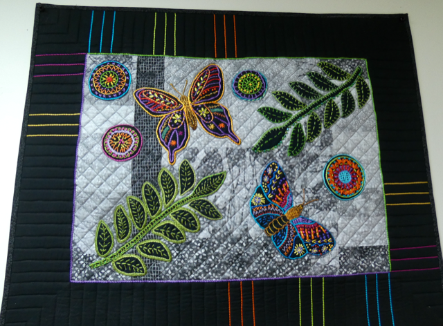 Laguna, I just treated mine like a quilted wall hanging. I did crosshatch quiting in the background and straight line quilting on the border. Border and binding. HelenWOriginally posted by 1829Laguna View PostI am finished with embroidery. How is everyone finishing the project? Quilting? Mounting on stretched canvas?HelenW