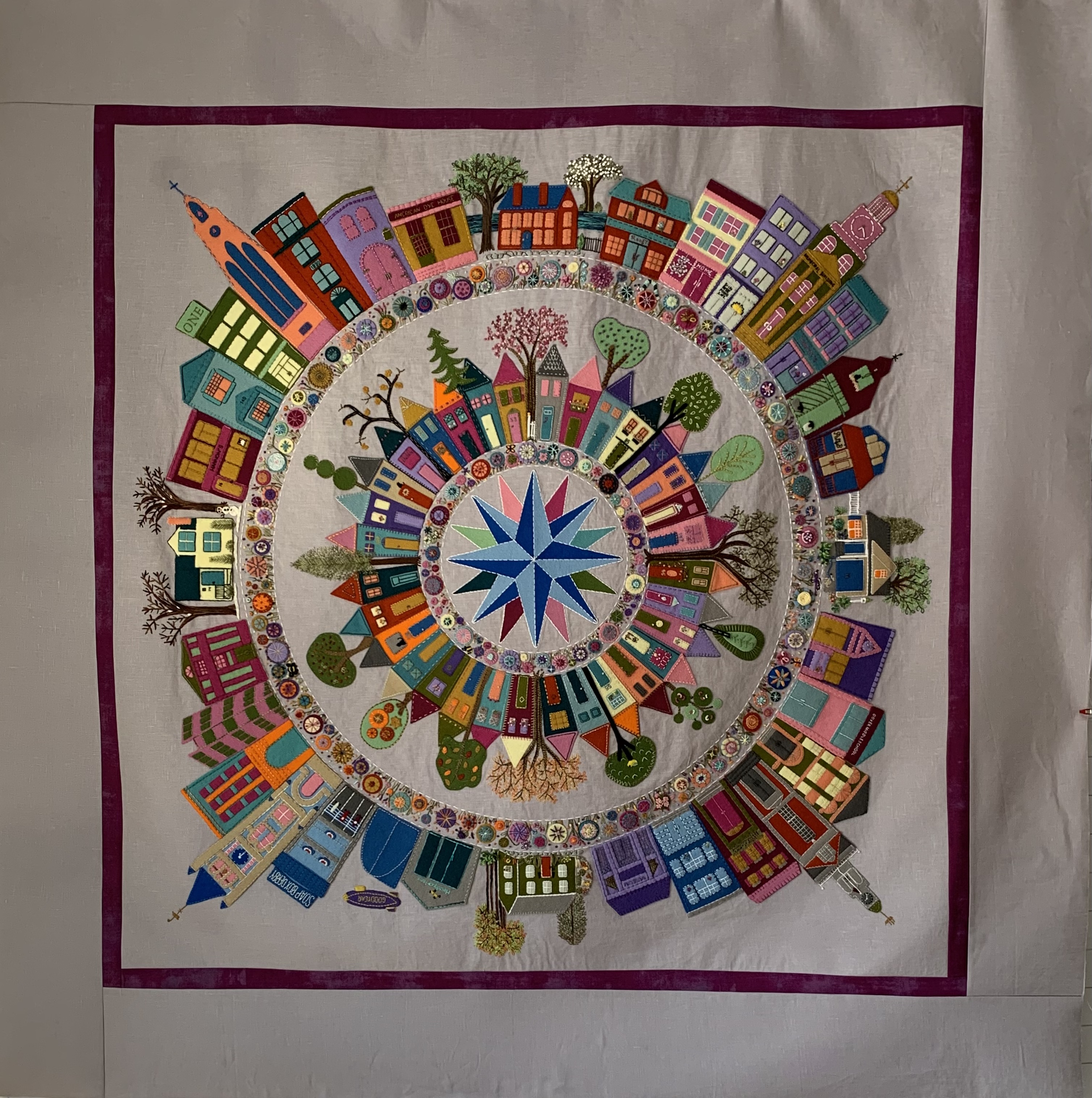 Hi Helen. Thanks for asking! I haven’t started on this year’s BOM, but hope to at least do the center at some point. I’m working diligently to finish up last year’s quilt. Border is on and I’m working on pennies to go on it. Yesterday I came up with the vine I plan to do in my wide border. Also doing a BOM with Sue Spargo and several other long-term projects. Not enough time in the day! Here’s my quilt.