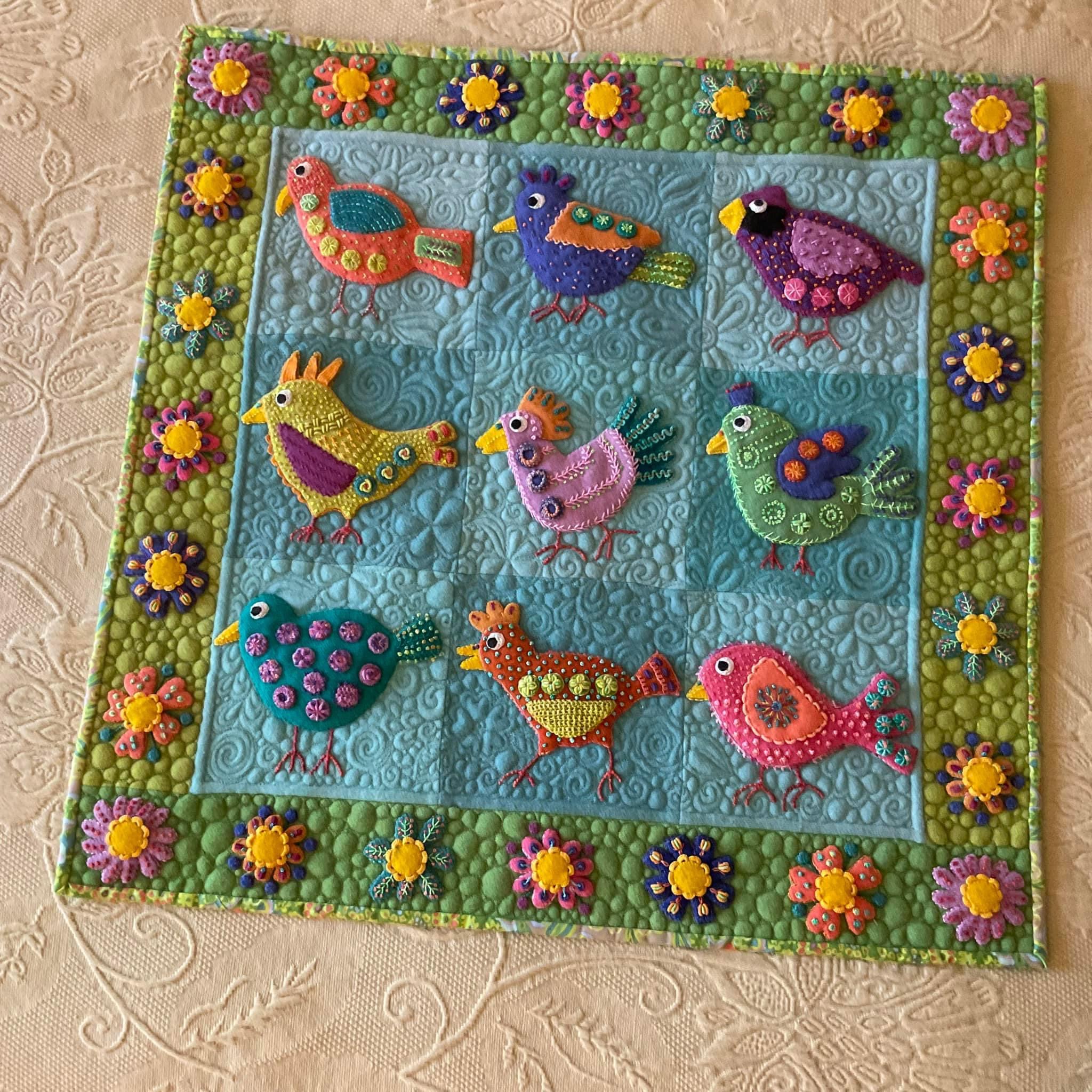Helen, Sue does not allow posting until she released the design for sale to the general public. In November she released her 2020 BOM Chirp. It was fun to see all the various versions people had done. This is an example (not mine-but I plan to do it for my niece’s high school graduation. She loves birds!)