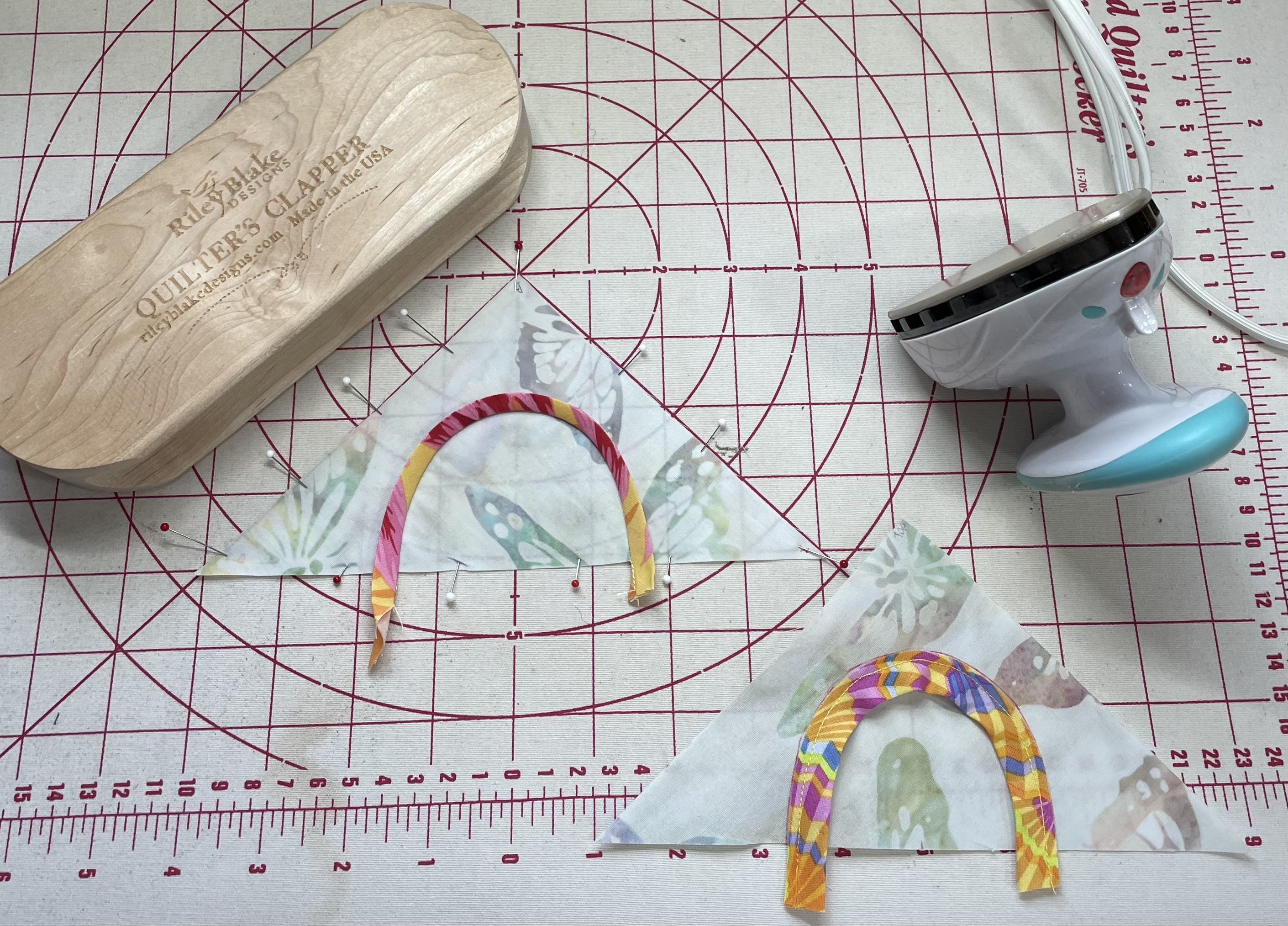 my idea how to keep the handles triangle shapes; starch spray and pinning to ironing board and