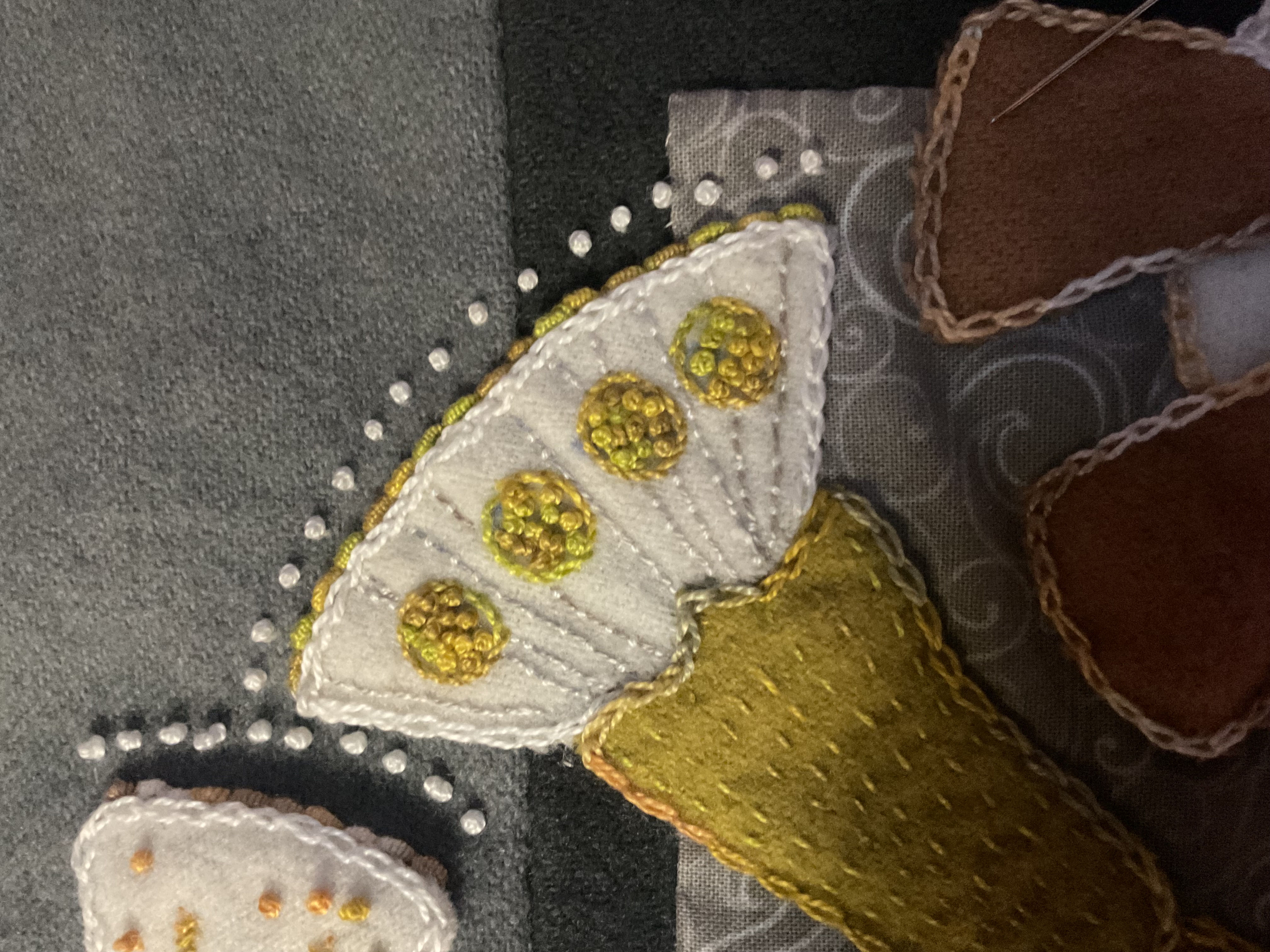 I am using a cotton background with the wool appliqué and almost finished stitching the appliqué pieces down to cotton background.