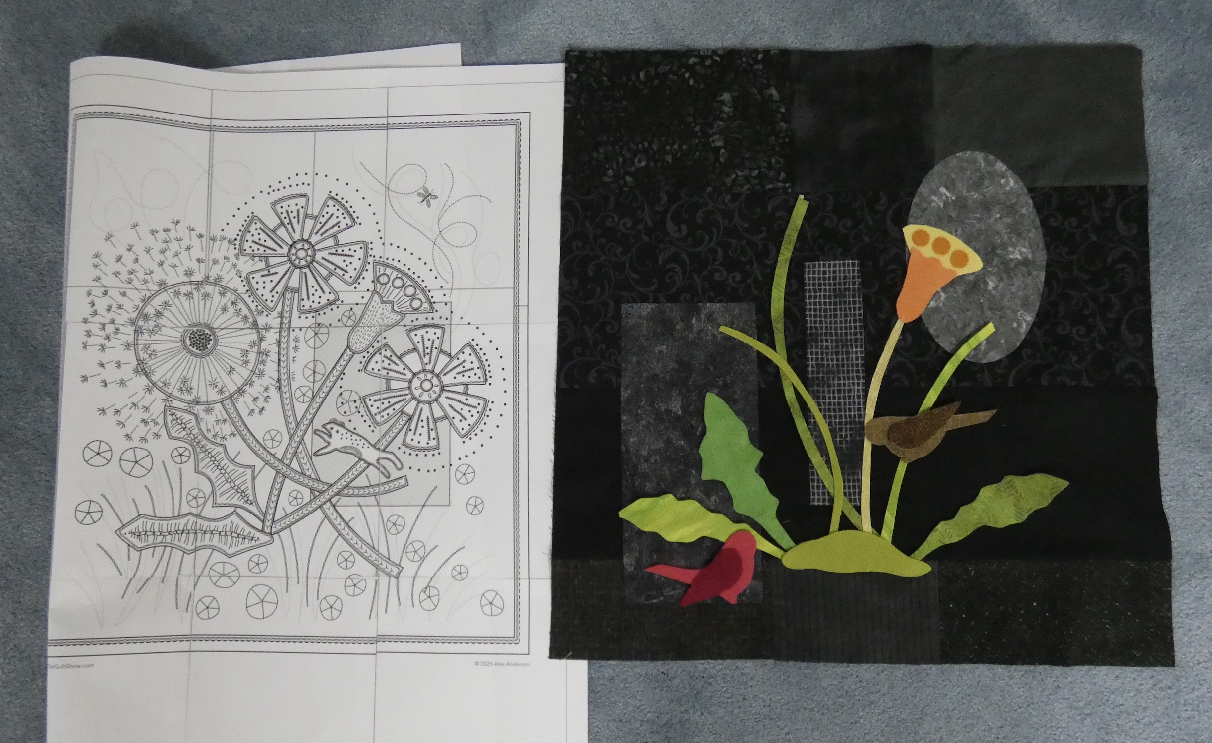 that will lay on top of it. Maybe lay the fabrics for the applique folded on top or along side each of your options take a photo