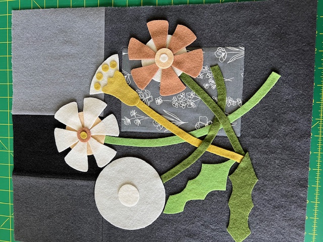 wool applique. I don't know of any way to leave all the pieces on the background while basting them