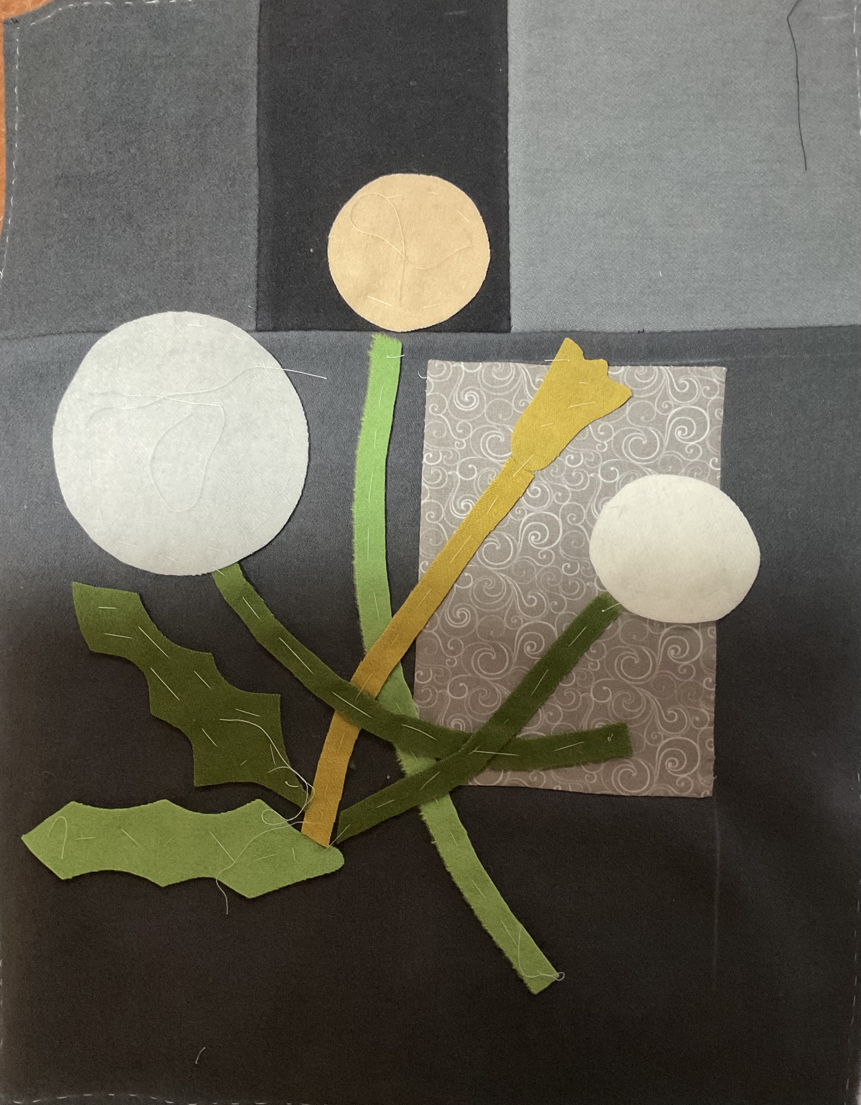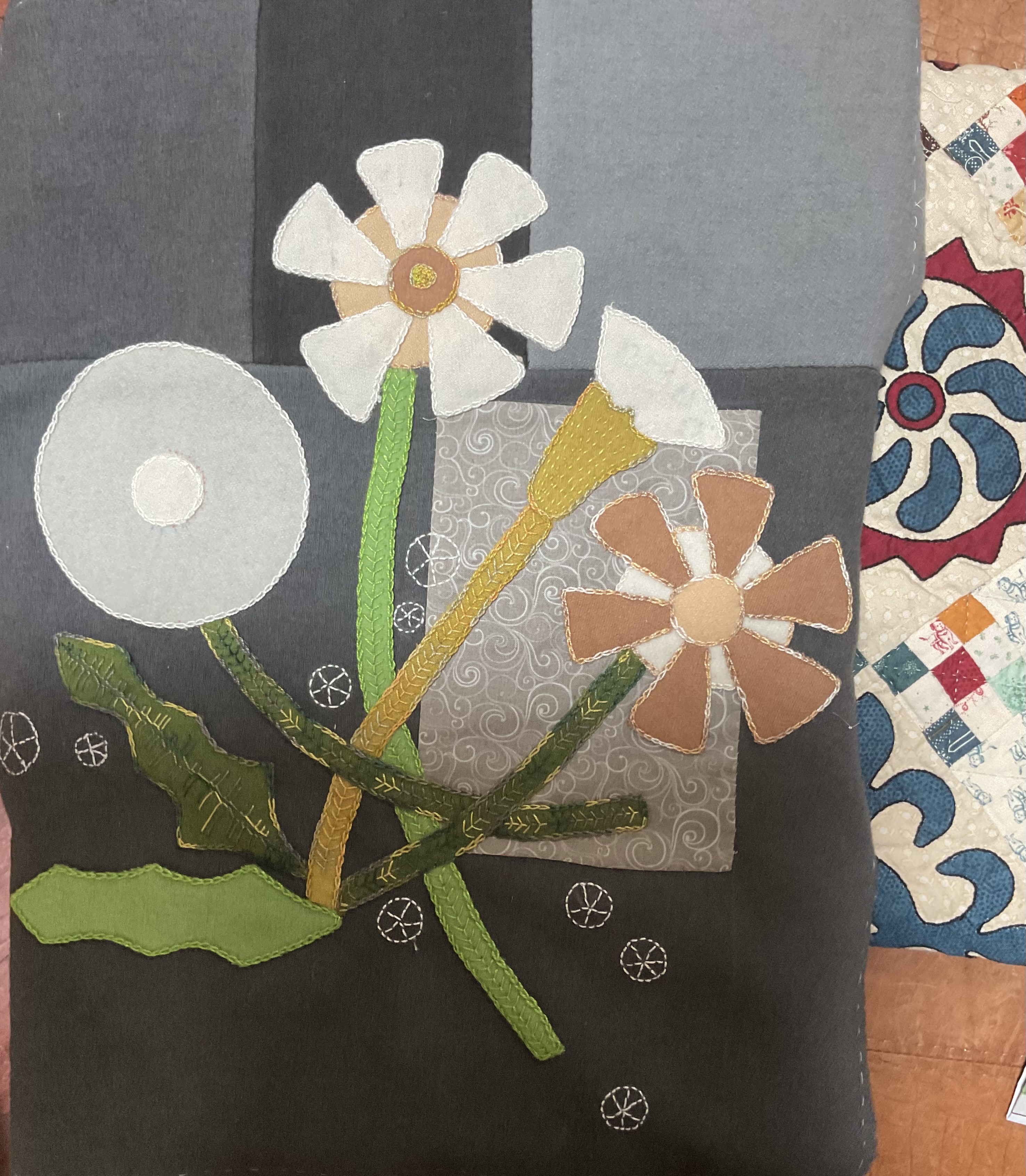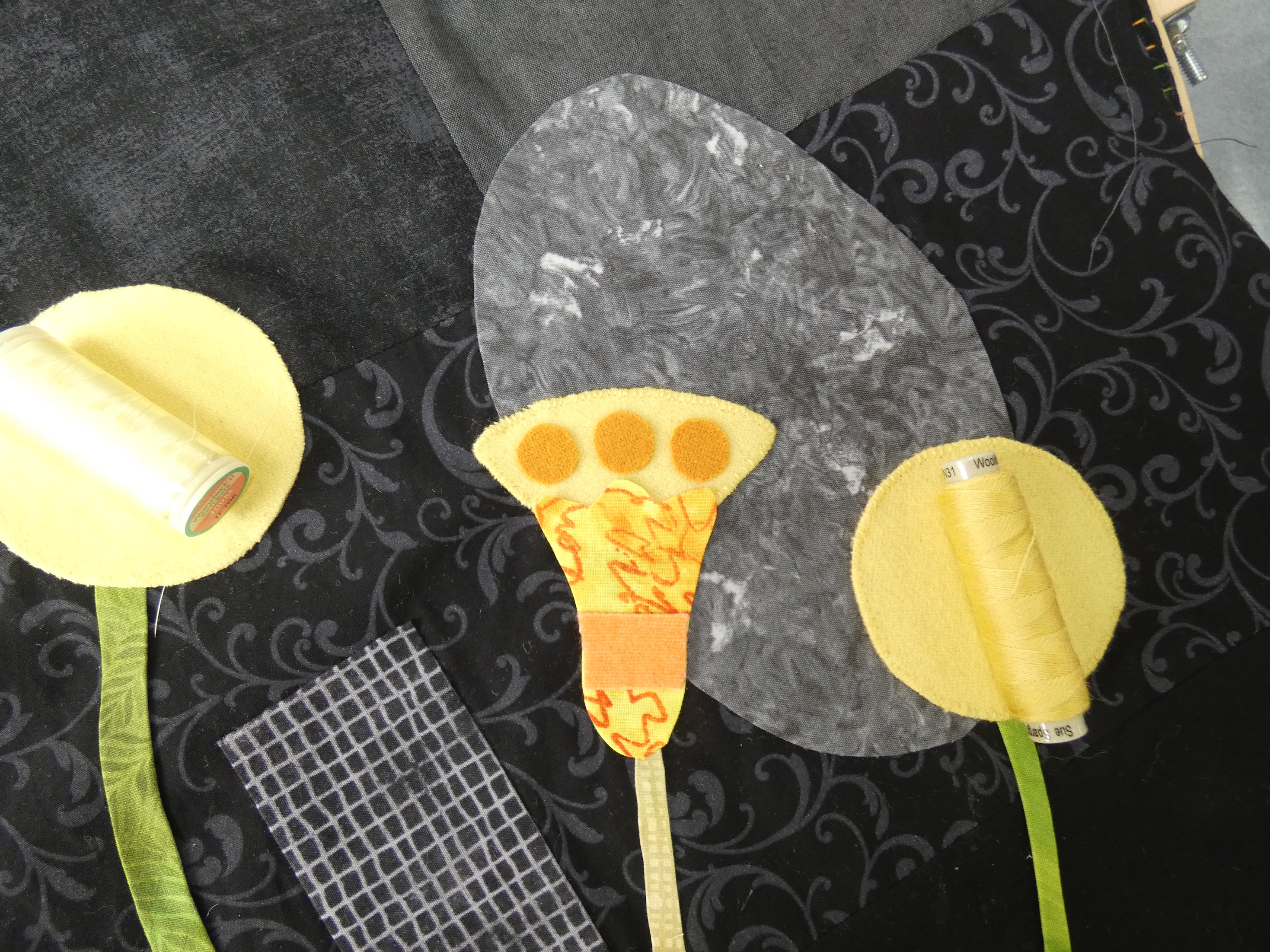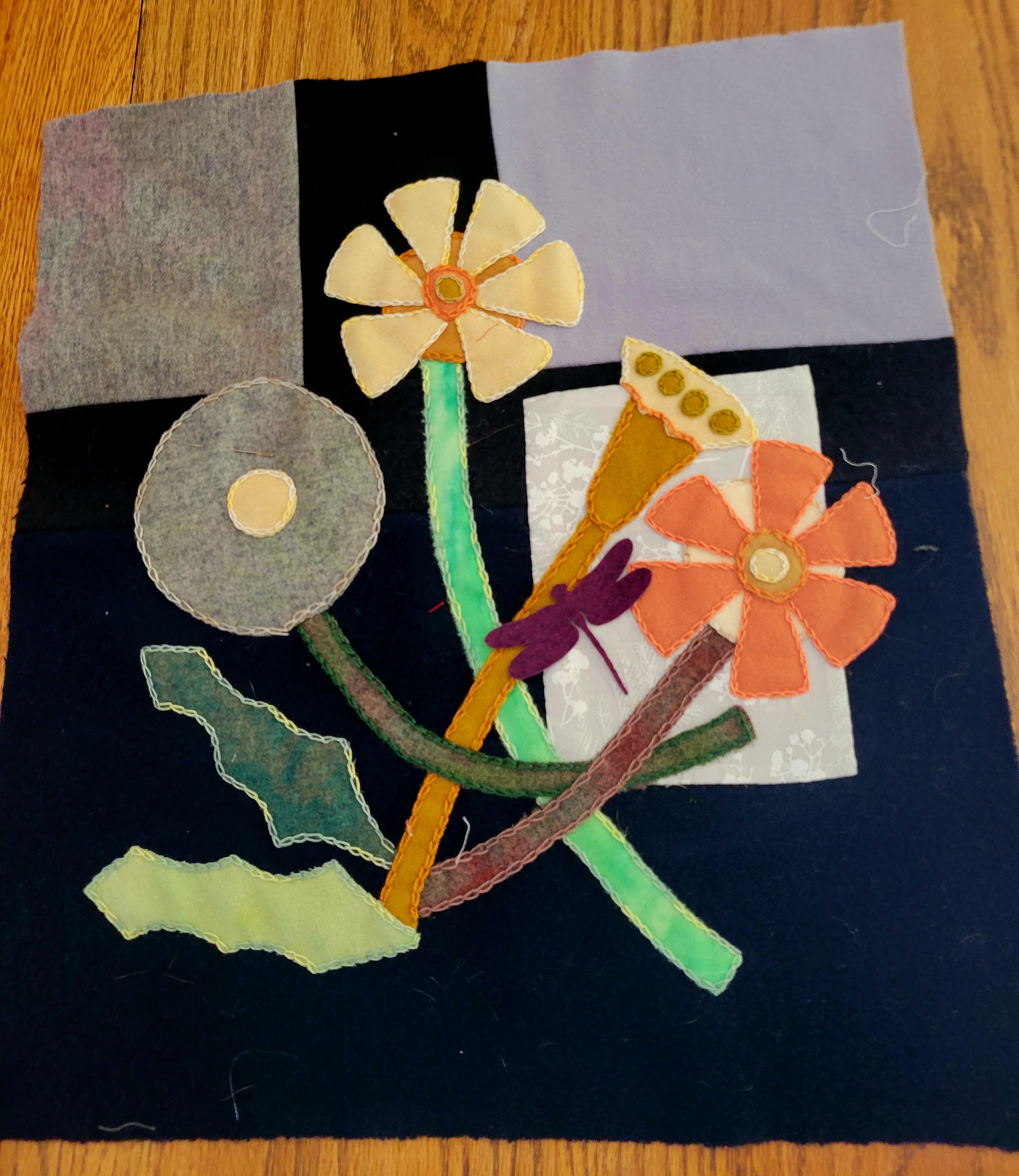 I'm allergic to wool, so I'm using cotton and some silk. I have more pieces to add yet, and the applique pieces are not stitched down yet. I'm considering adding a snail or other creature. I like your bird Helen W. Thanks for the inspiration!