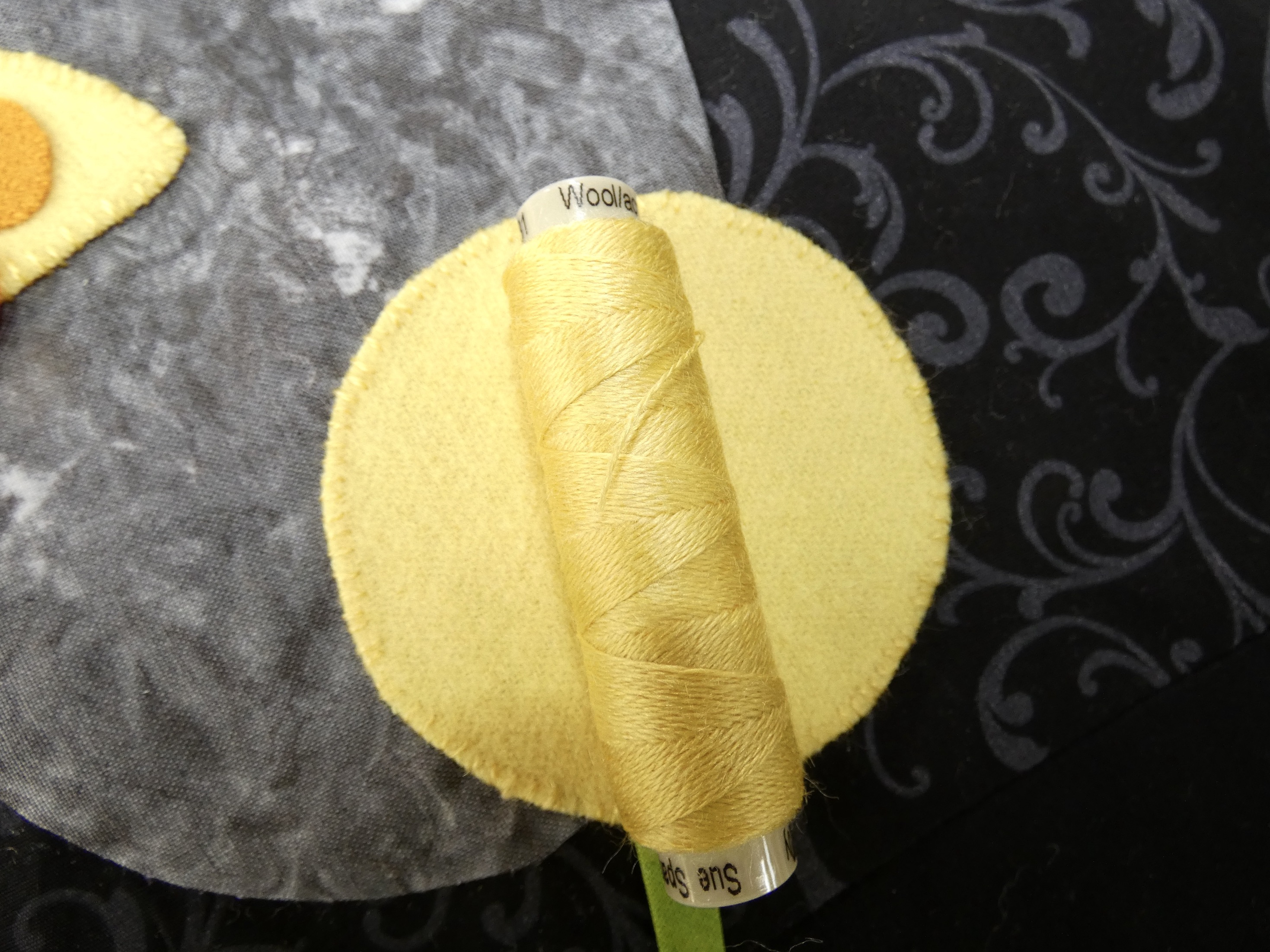 Experimenting with threads for the wool whip stitch. One on right uses the Sue Spargo yellow wool ellana thread on the yellow wool.