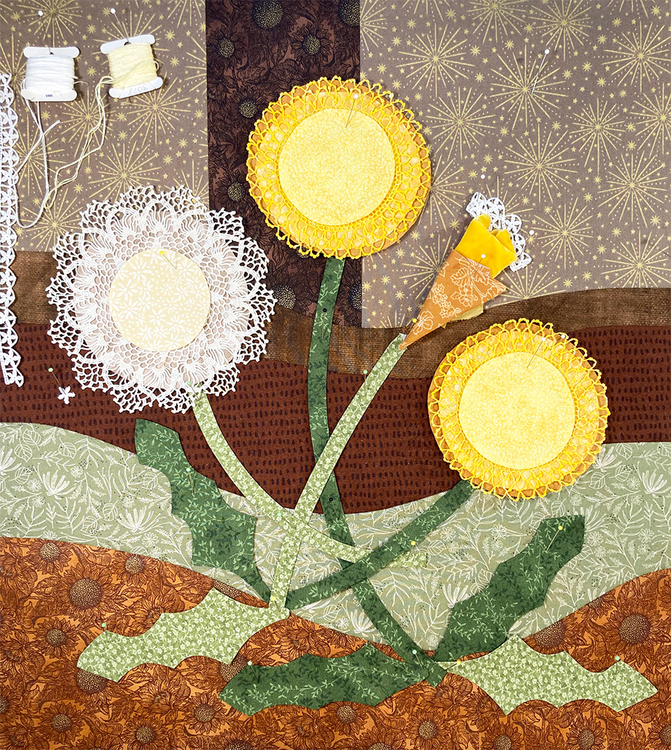 This was my first time using the freezer paper and starch method to turn the applique edges. I really like it!! Though it did stain the silk pieces; so I won't use it for silk going forward. The silk circles are behind the yellow lace doilies so they look fine there I think. The staining adds a bit of texture.