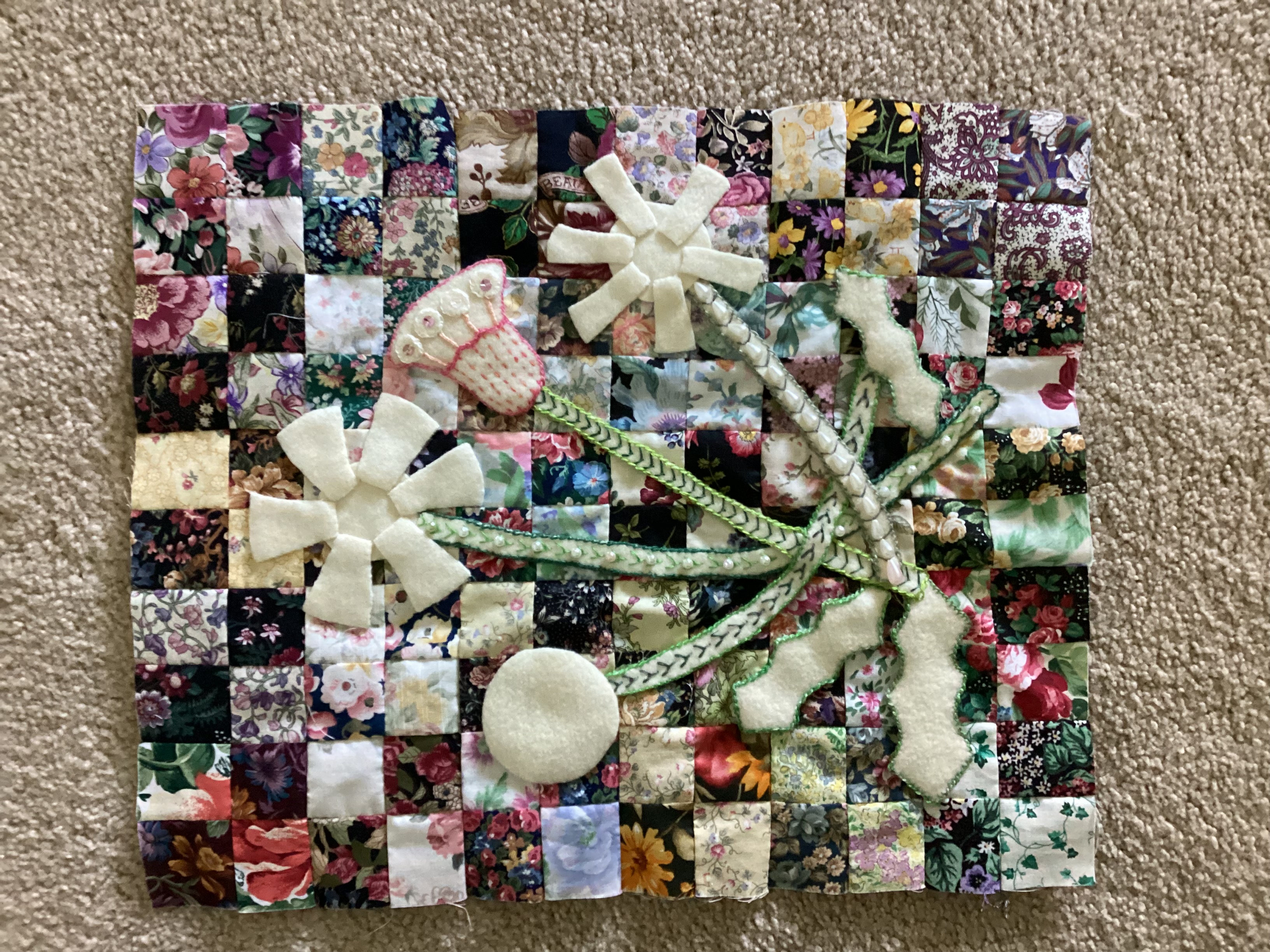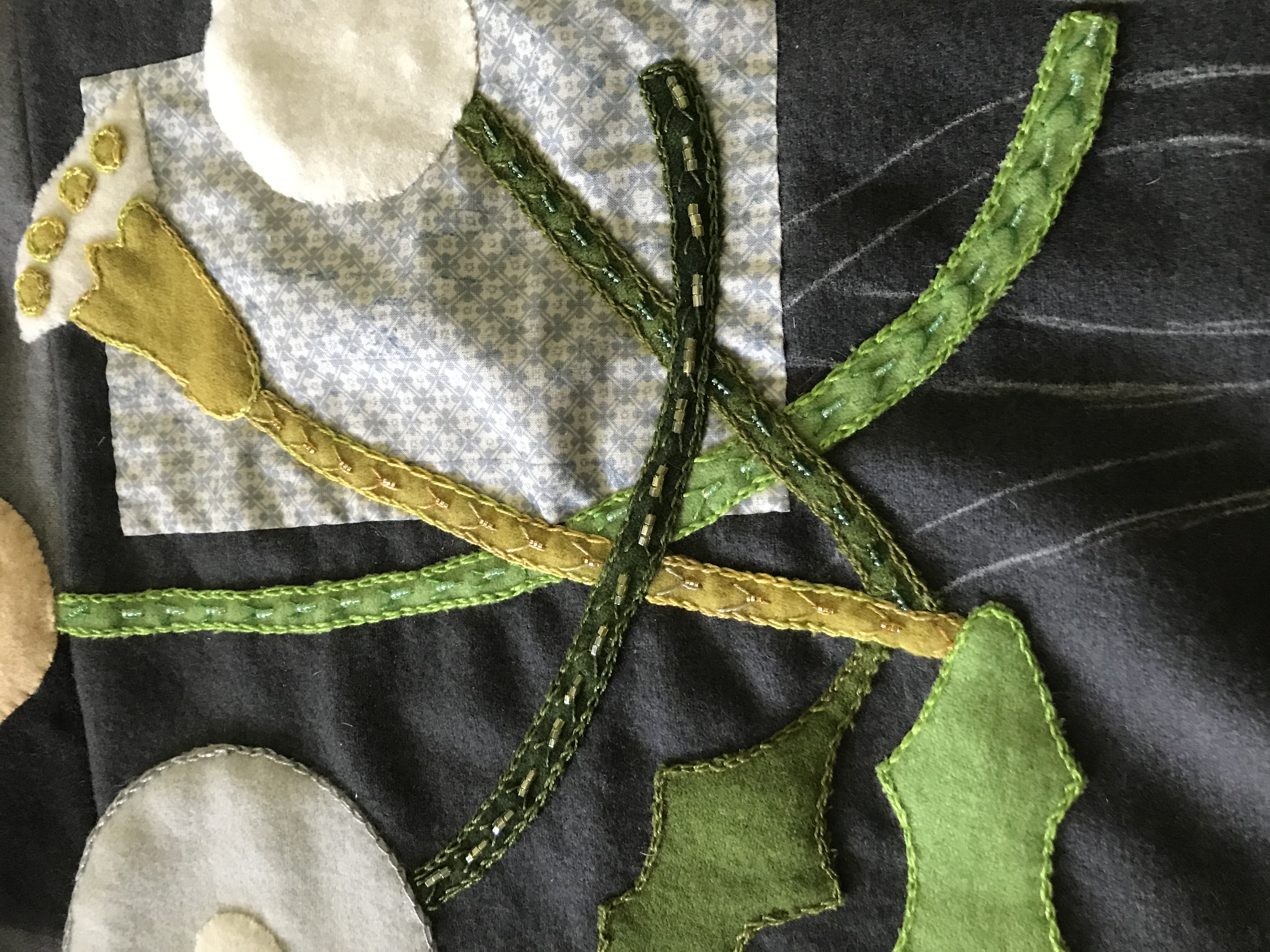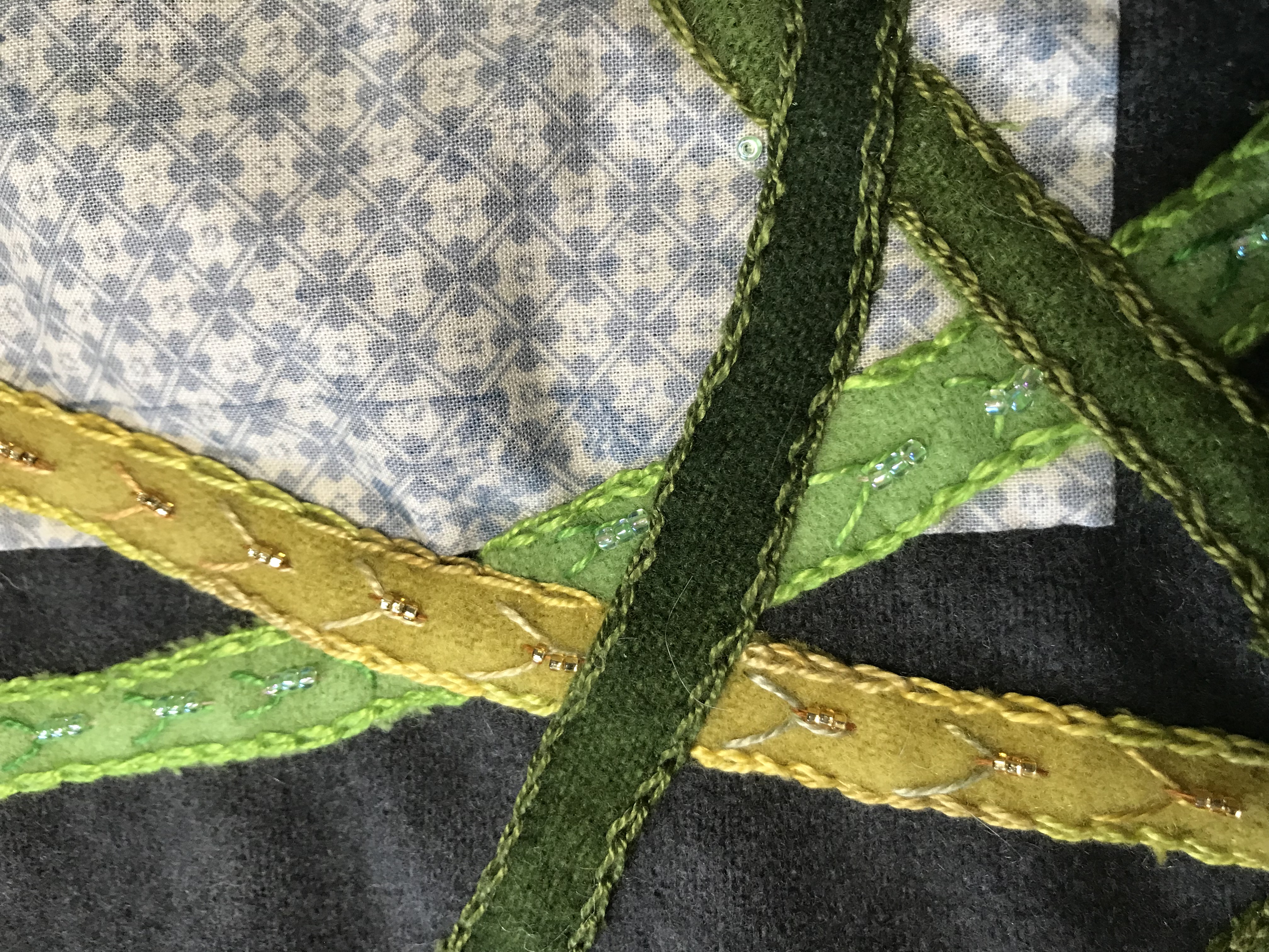 I am using my stash. Hand sewed charm squares and then used wool for appliqués. Since I only have off white wool, embroidery will be colors. Doing some beading also. Thanks Alex for tip using 2 colors for variegated threads. Looking forward to more stitches. I am summering in Wisconsin without my sewing machine, so it is all hand work I am doing. This project is perfect. I have 4 projects and I am sure some of these stitches will find their way into those projects.Linda H