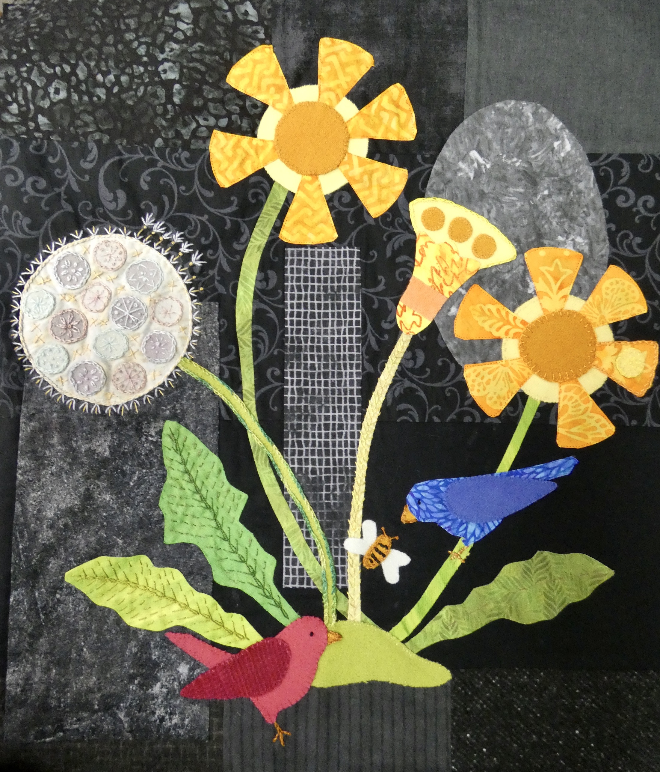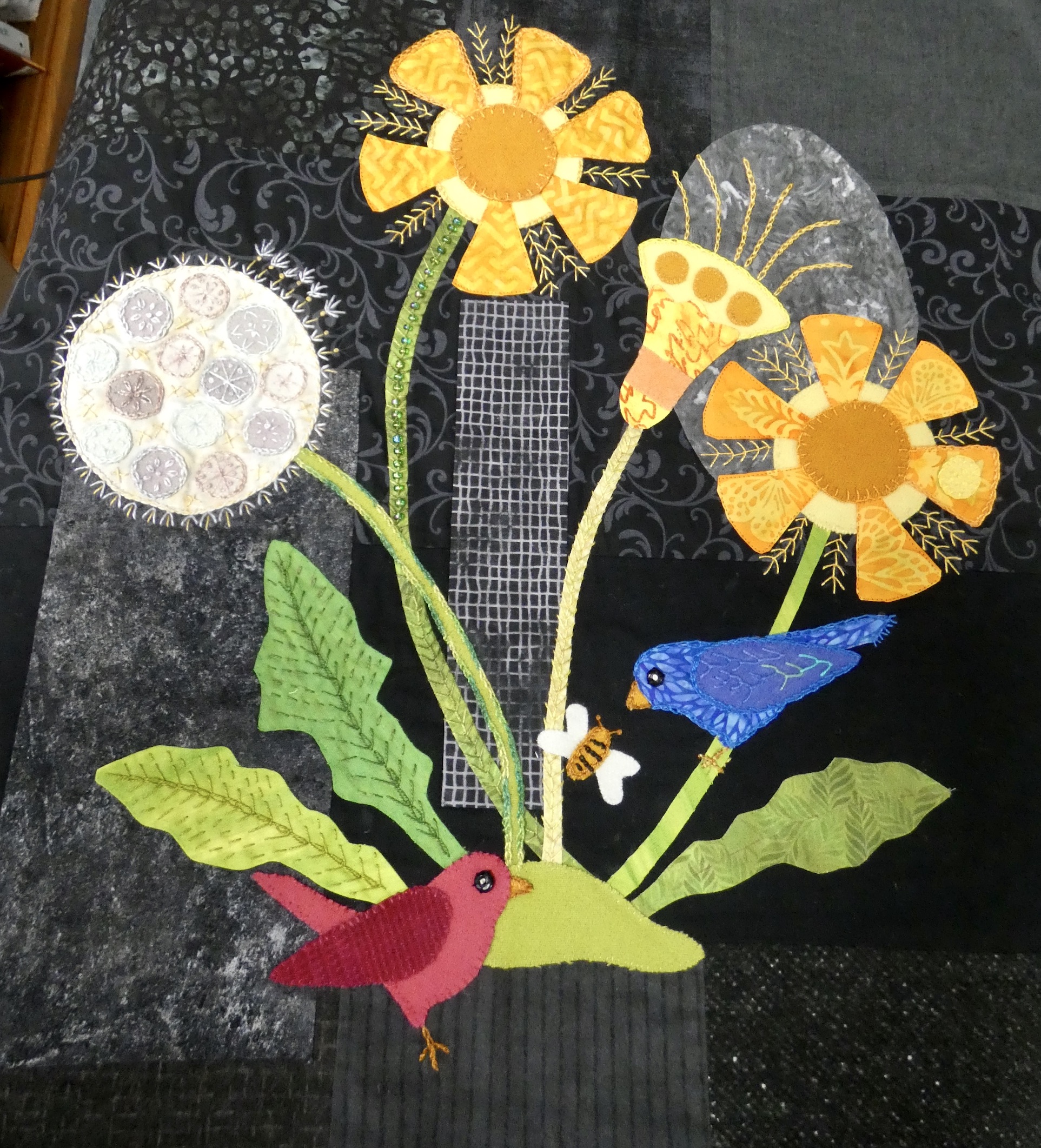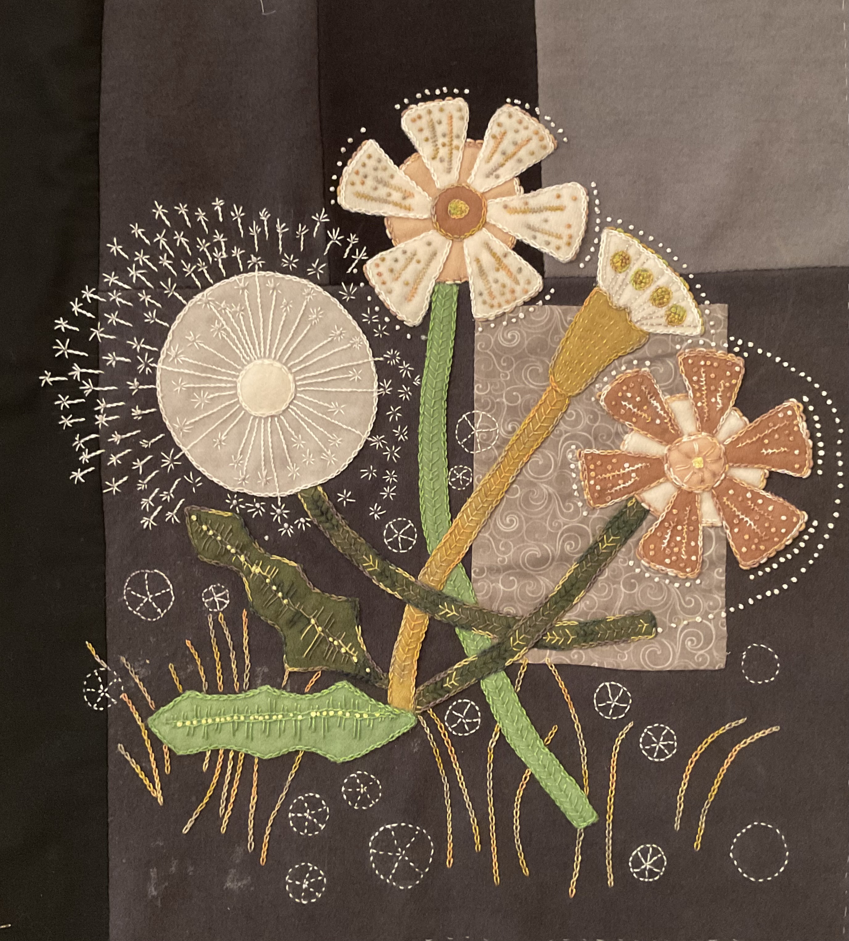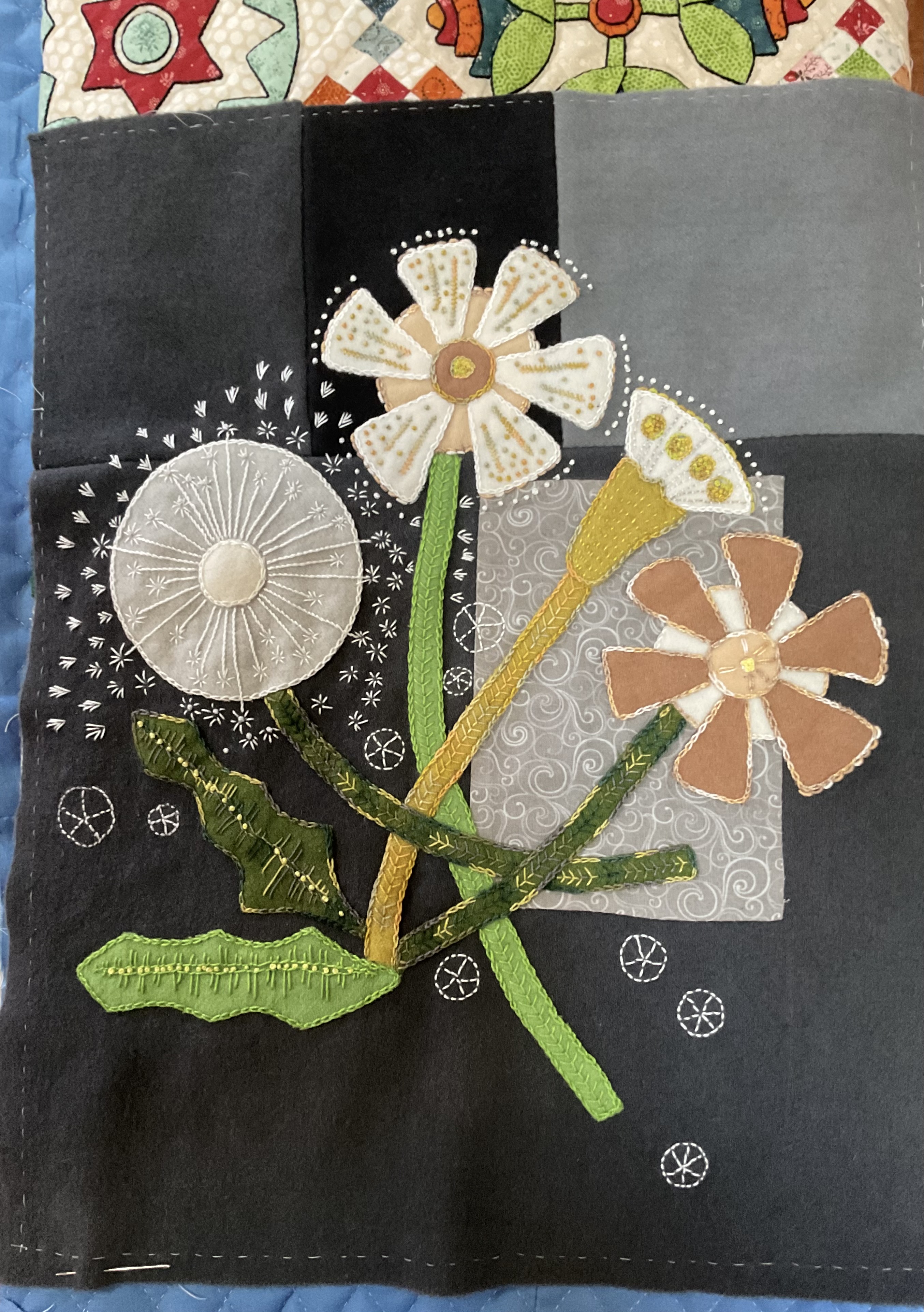 I love seeing everyone’s Wishes project and would love to see more. I take daily photos and sometimes they show me when something isn’t working. I did the bullion stitch for far right flower using the green/gold variegated thread (used in stem) and it did not work for me and I ended up taking them out. I’m in process of replacing with same thread I used for chain stitch and I’m glad I made the change. I’ll use the same thread for loop stitch in petals. I hope it’s not too bland. I’m running out of space on the left for dandelion “puff”. I’m thinking about adding a 2 inch strip of black to allow for more “wishes”.